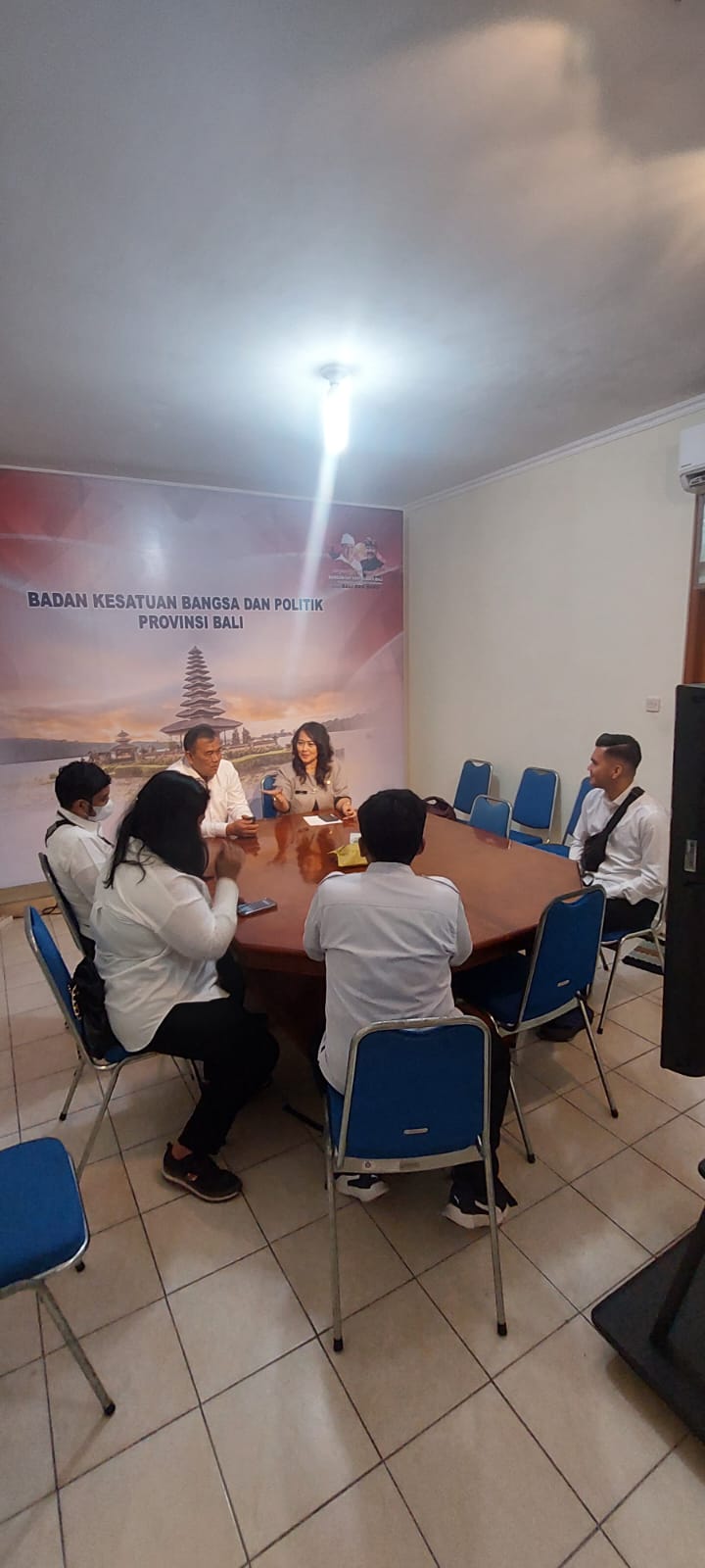 Senin, 26 Juni 2023. Badan Kesatuan Bangsa dan Politik Provinsi Bali dalam hal ini diwakili Kepala Bidang Kewaspadaan Nasional dan Penanganan Konflik Sosial, Nyoman Cahayawati menerima audensi Kasubdit pemberdayaan masyarakat BNPT (Badan Nasional Penanggulangan Terorisme) RI, Kolonel (Czi) Rahmad Suhendro dalam rangka pelaksanaan kegiatan monitoring pelibatan masyarakat dalam pencegahan terorisme melalui FKPT Bali.