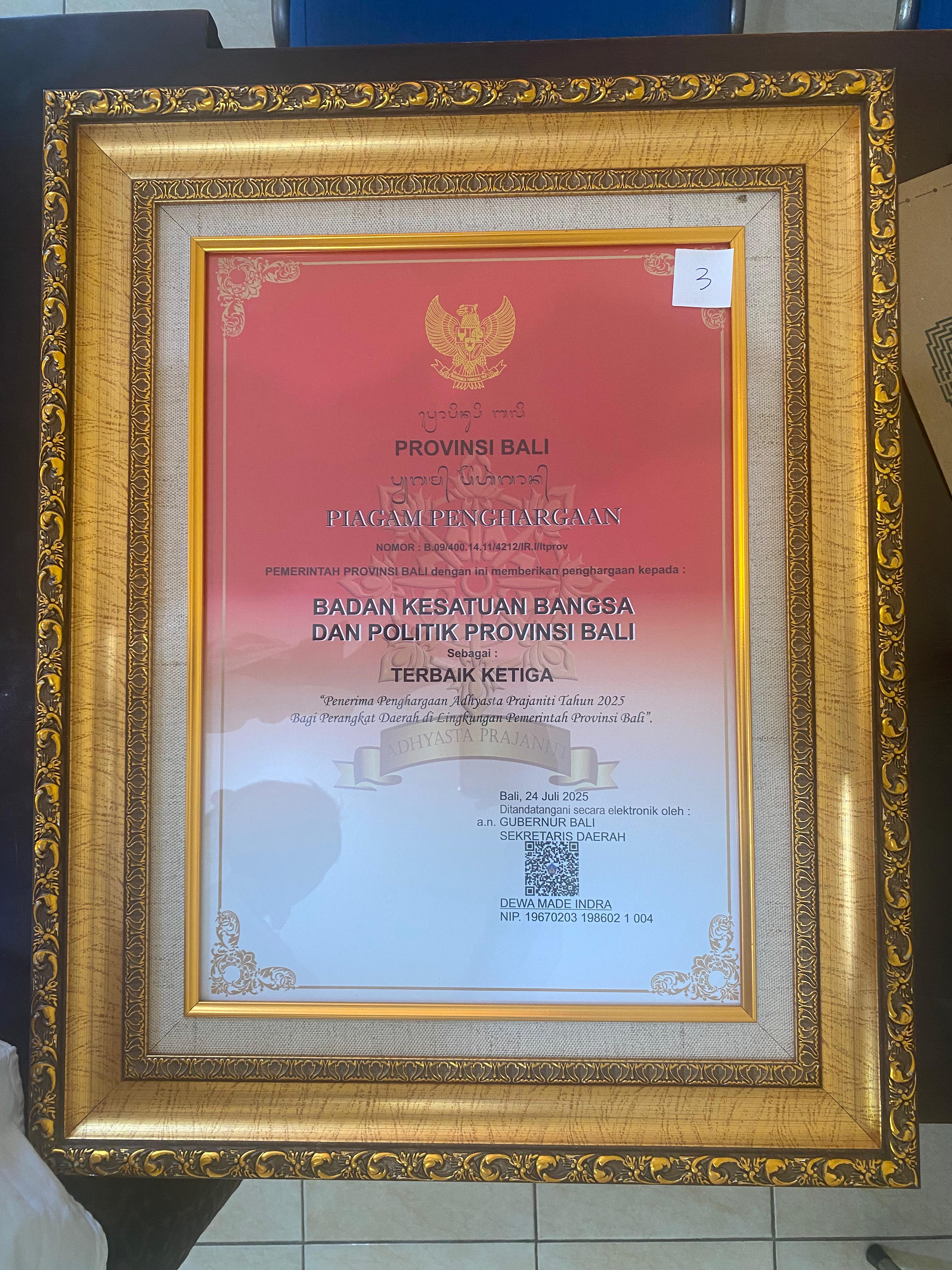 Bertepatan dengan Hari Ulang Tahun ke-67 Provinsi Bali, Badan Kesatuan Bangsa dan Politik (Badan Kesbangpol) Provinsi Bali mendapatkan kado indah sebagai Terbaik Ketiga Penerima Penghargaan Adhyasta Prajaniti Tahun 2025 bagi perangkat daerah di lingkungan pemerintah provinsi bali.