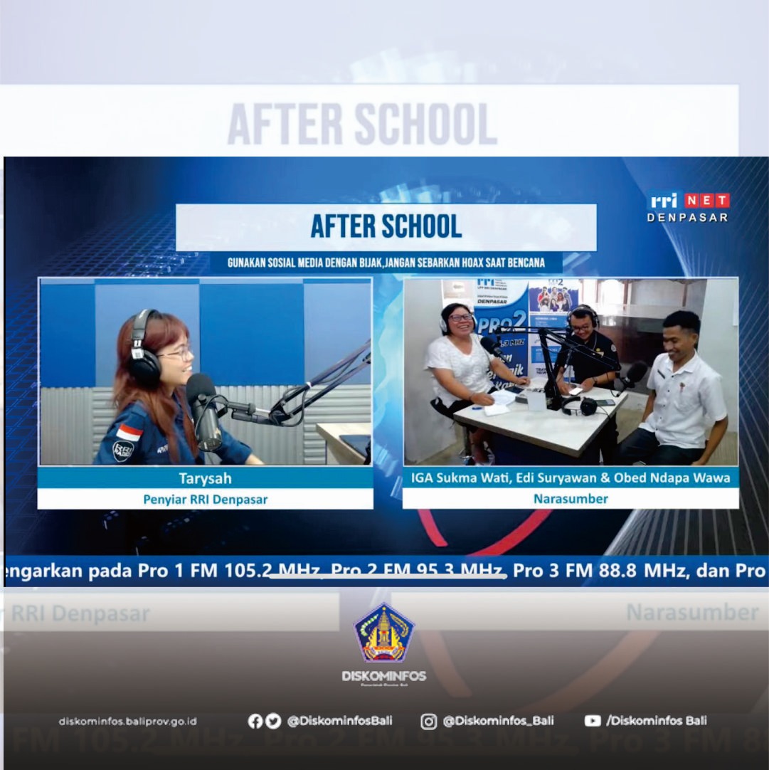 Diskominfos Bali turut serta berpartisipasi dalam program Dialog Tanggap Bencana Nasional (Kentongan) kolaborasi LPP RRI Denpasar dengan BPBD Provinsi Bali. Sebagaimana tujuan program Kentongan untuk memberikan edukasi dan informasi kepada masyarakat mengenai kebencanaan, mitigasi dan sarana peringatan dini untuk Tangguh dan siap menghadapi bencana, Diskominfos hadir dalam rangka mengajak generasi muda di Bali tanggap dan siap siaga bencana dengan menggunakan media social secara bijak dan tidak menyebarkan hoax saat bencana, di Studio Programa 2 RRI Denpasar pada Rabu, 12 Maret 2025. Hadir pada dialog tersebut mewakili Diskominfos Bali, Ketua Tim Monitoring Isu, Kebijakan dan Opini Publik di Media, I Gusti Ayu Sukmawati, untuk menyampaikan dan mengajak generasi muda berperan dalam kesiapsiagaan bencana dengan cek fakta dan stop hoax.