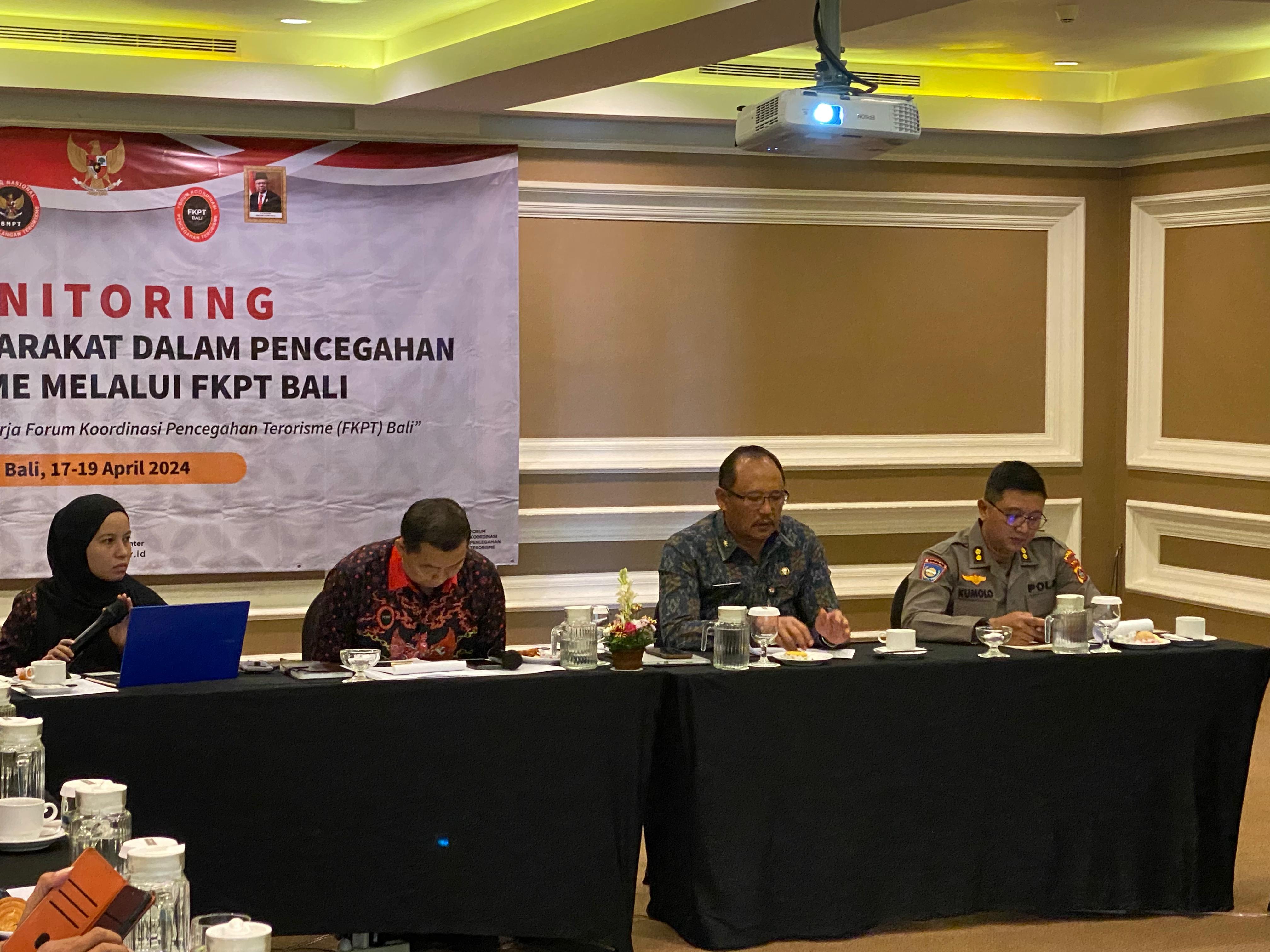 Jumat, 19 April 2024. Kepala Badan Kesatuan Bangsa dan Politik (Kesbangpol) Provinsi Bali selaku Ketua Forum Kordinasi Pencegahan Terorisme (FKPT) Bali, Drs. I Gusti Ngurah Wiryanata,M.Si. buka kegiatan Focus Group Discussion (FGD) Pelibatan Masyarakat Dalam Pencegahan Terorisme dan Formatur Pengusulan Calon Pengurus FKPT Bali periode 2025-2028, bertempat di Sky meting Room Herper Kuta Hotel bay Aston, Kuta Badung. Kegiatan ini merupakan pelaksanaan program kerja Deputi Bidang Pencegahan Perlindungan dan Deradikalisasi Badan Nasional Penanggulangan Terorisme Republik Indonesia (BNPT RI) yang dihadiri sekitar 50 Orang.