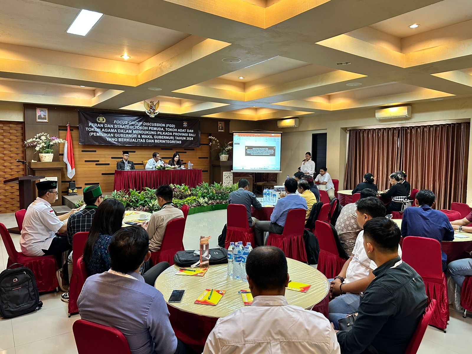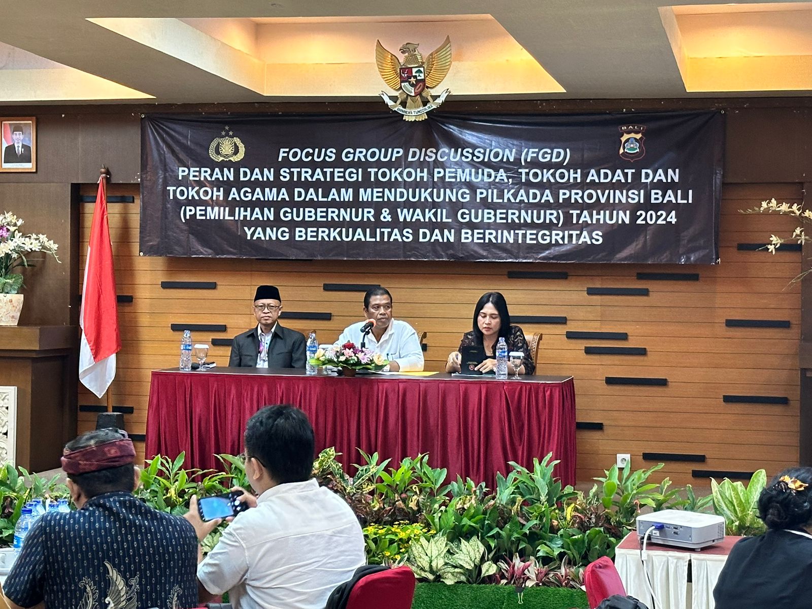 Badan Kesatuan Bangsa dan Politik (Kesbangpol) Provinsi Bali yang diwakili oleh Plt. Kepala Bidang Politik Dalam Negeri, Ni Kadek Rudiani menjadi Narasumber pada acara FGD Peran dan Strategi Tokoh Pemuda, Tokoh Adat dan Tokoh Agama dalam mendukung Pilkada Provinsi Bali Tahun 2024 yang berkualitas dan berintegritas pada Selasa, 27 Agustus 2024 yang dilaksanakan oleh Polda Bali di Hotel Puri Nusa Indah, Jalan Waribang Denpasar.