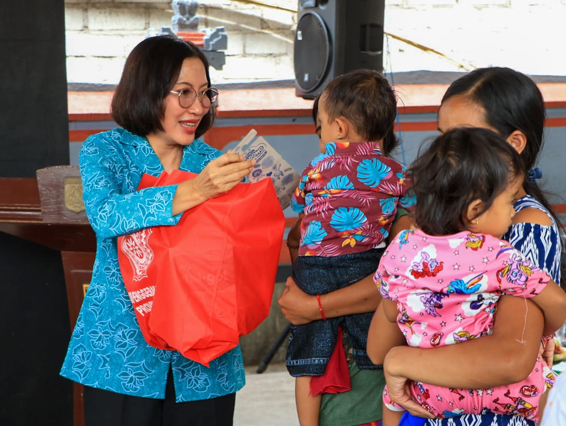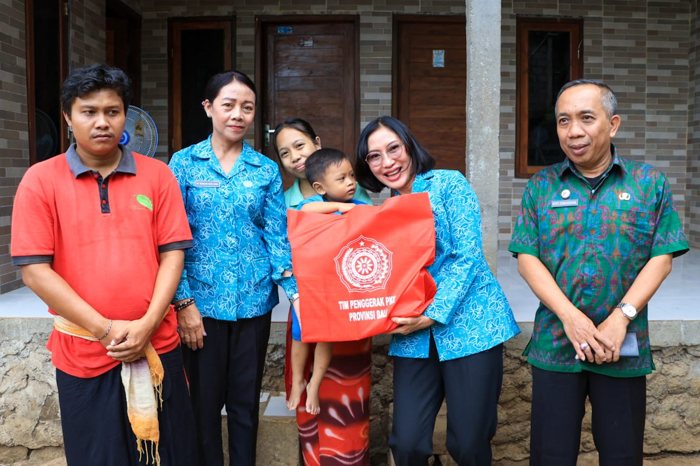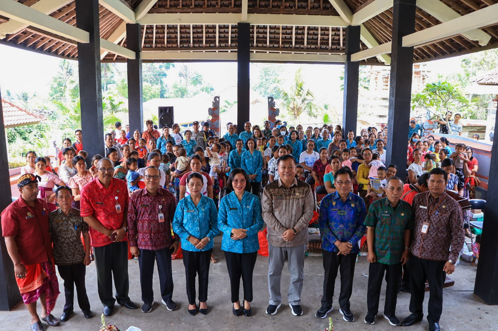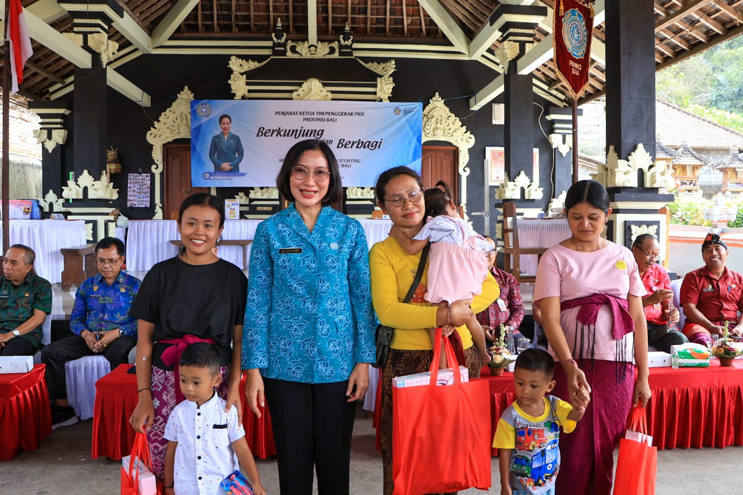 KARANGASEM - Fokus mendukung upaya pemerintah dalam pencegahan stunting, TP PKK Provinsi Bali melaksanakan kegiatan ‘Berkunjung dan Berbagi’ di Kabupaten Karangasem, Jumat (8/12/2023). Pada kegiatan yang dipusatkan di Wantilan Banjar Tuminggal Desa Tiyingtali, Kecamatan Abang, Kabupaten Karangasem, TP PKK Provinsi Bali menyalurkan bantuan kepada 50 balita berisiko stunting. Tiap balita menerima paket bantuan berupa 5 kg beras, 1 krat telur, 6 kotak susu dan sikat beserta pasta gigi. Selain itu, tiap balita juga memperoleh 1 kg udang segar dari Dinas Kelautan dan Perikanan Provinsi. Dalam kesempatan itu diserahkan pula bantuan berupa bibit ayam kampung dan pupuk cair oleh Kepala Dinas Pertanian dan Ketahanan Pangan Provinsi Bali kepada Ketua Tim Penggerak PKK Kabupaten Karangasem.