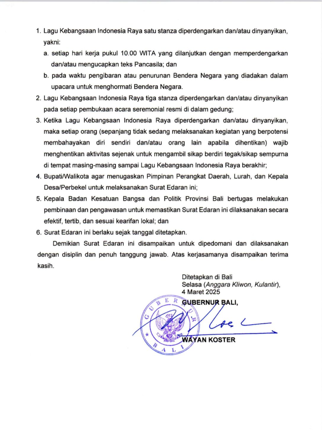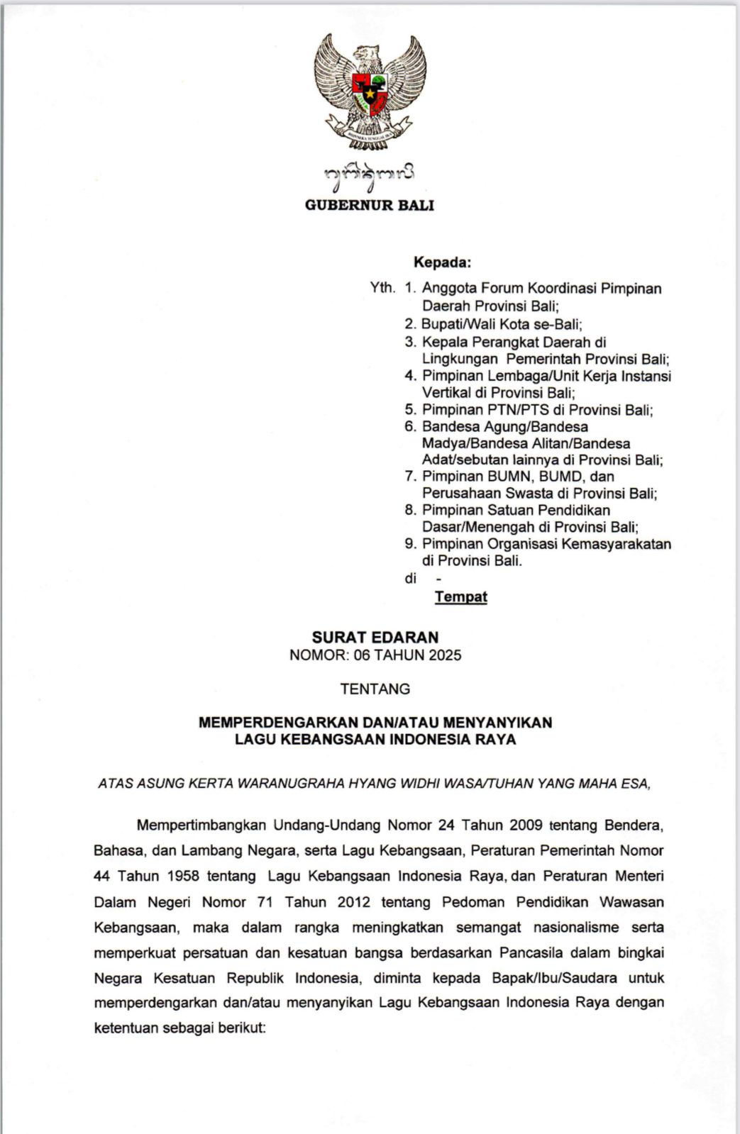 Gubernur Bali Wayan Koster dengan didampingi Sekretaris Daerah Provinsi Bali Dewa Made Indra menerbitkan Surat Edaran (SE) Nomor 6 Tahun 2025 tentang Memperdengarkan dan/atau Menyanyikan Lagu Kebangsaan Indonesia Raya. pada hari Selasa 4 Maret 2025 di Rumah Jabatan Gubernur Bali Jaya Sabha. SE ini mewajibkan pemutaran atau penyanyian lagu kebangsaan setiap hari kerja di berbagai sektor, mulai dari instansi pemerintah, sekolah, hingga lingkungan swasta dan adat.