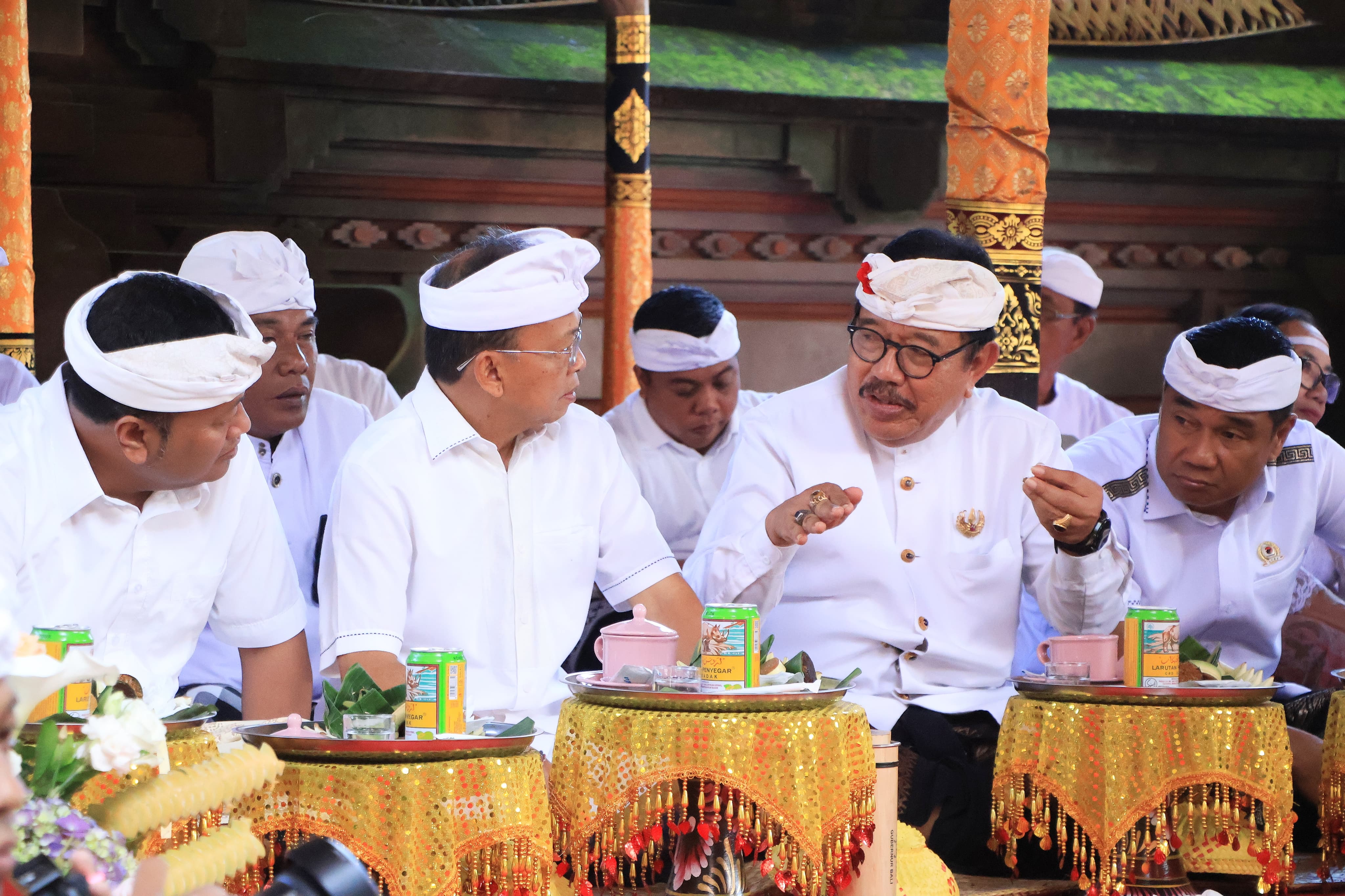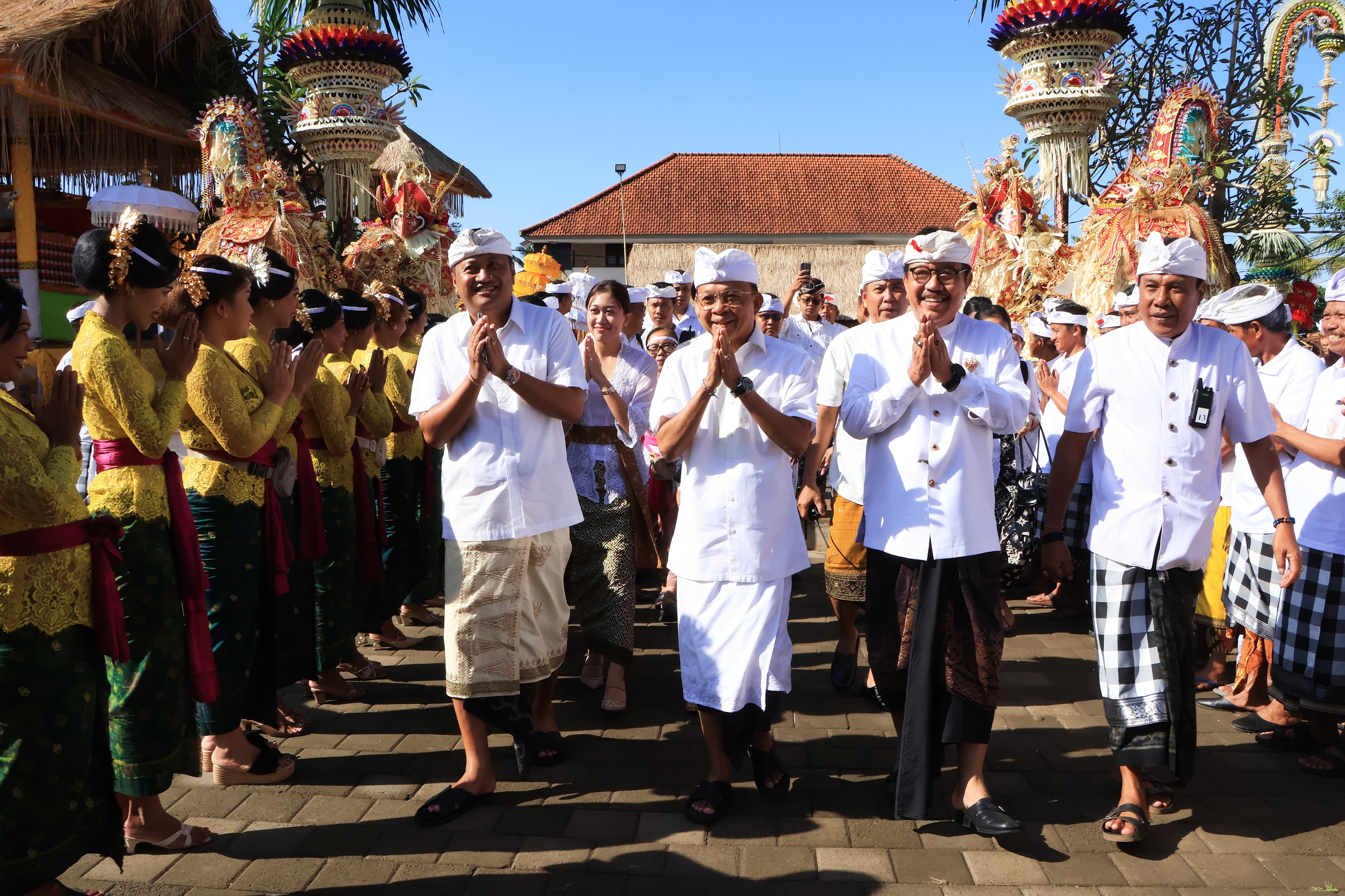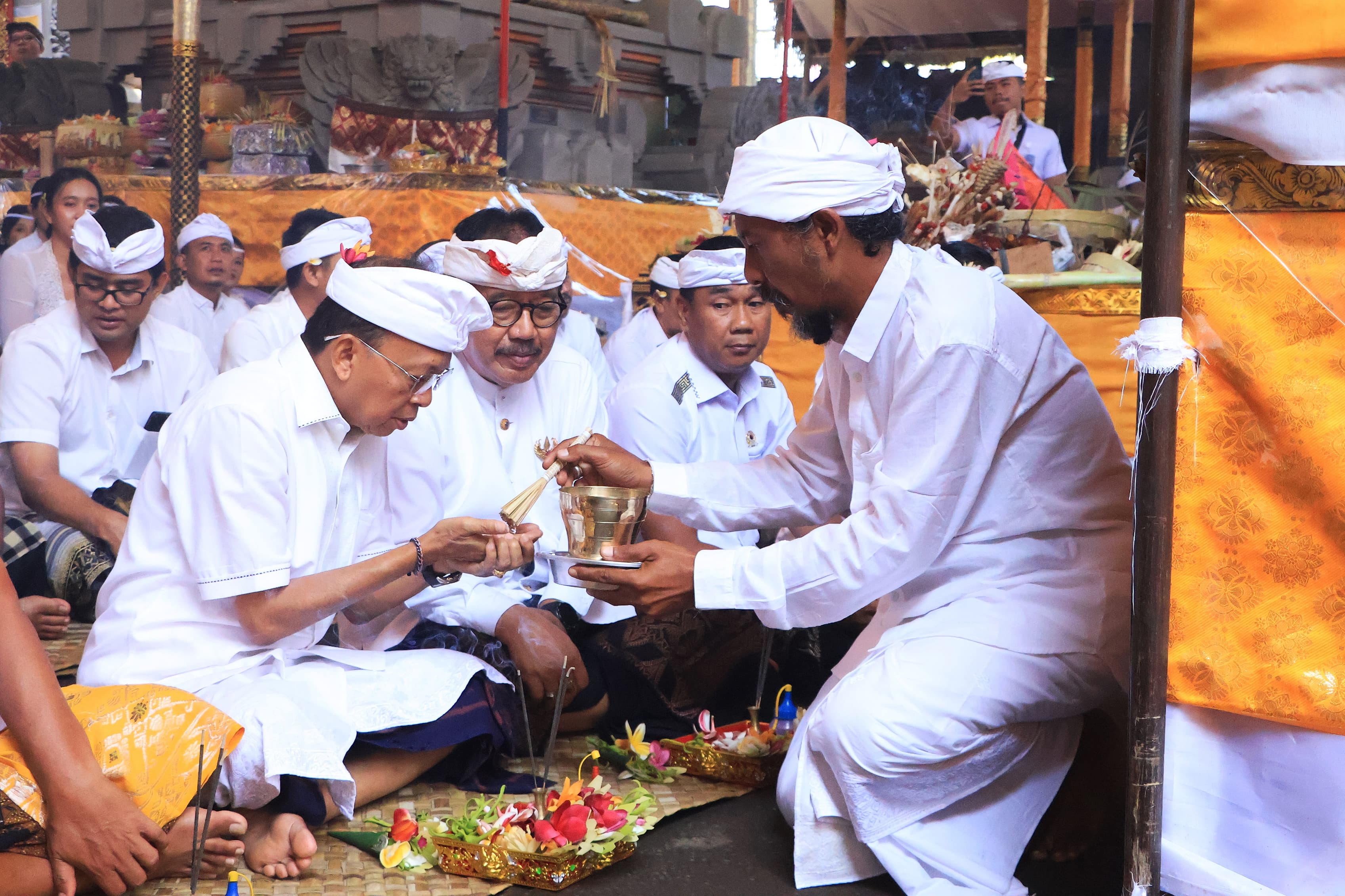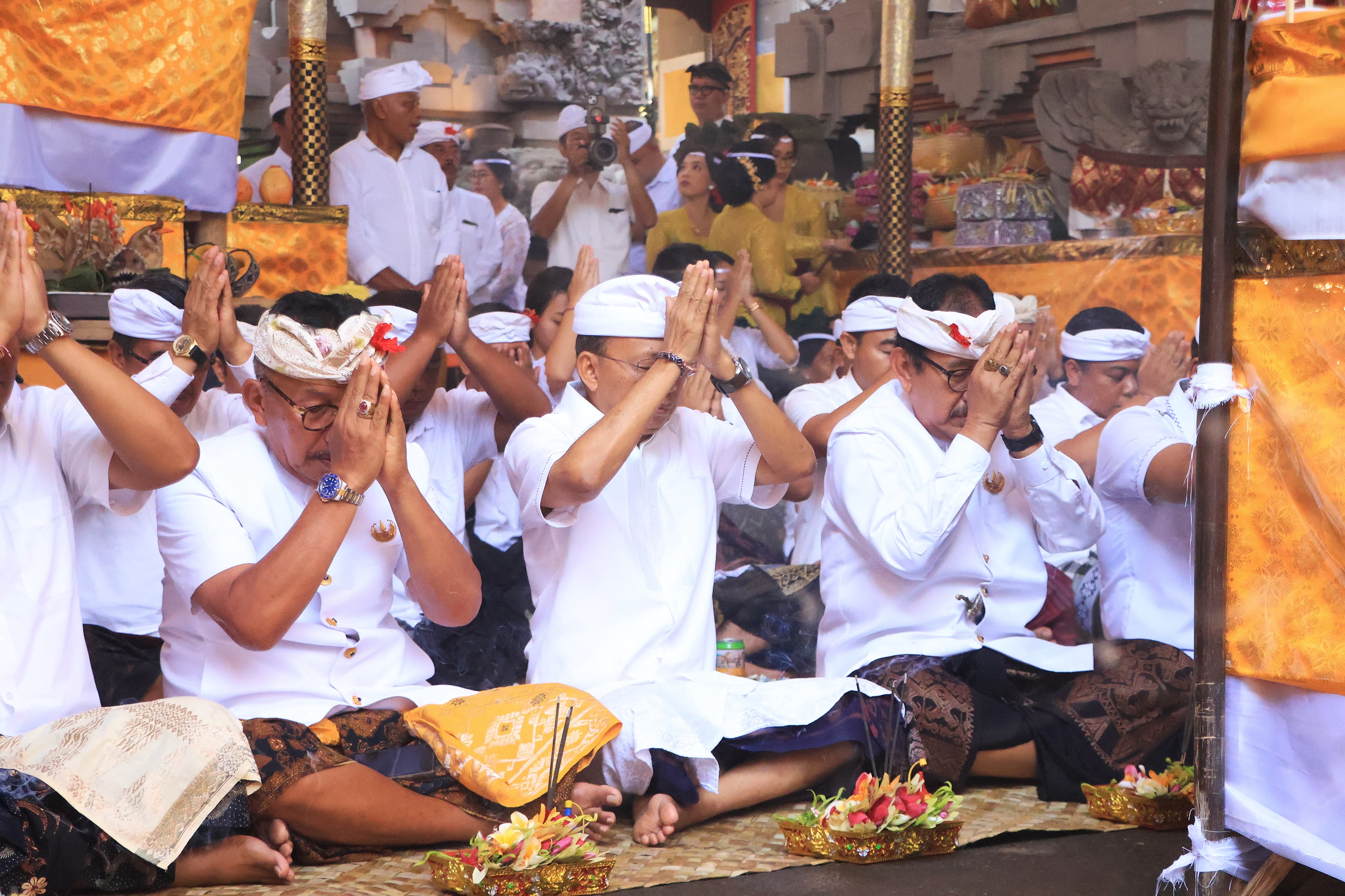 Gubernur Bali Wayan Koster menghadiri rangkaian Karya Agung Memungkah, Tawur Agung Pedanan, Ngenteg Linggih, Mapeselang, Ngusaba Desa lan Ngusaba Nini di Pura Desa lan Puseh Desa Adat Bunutan, Ubud, Gianyar pada Kamis (3/4) pagi.