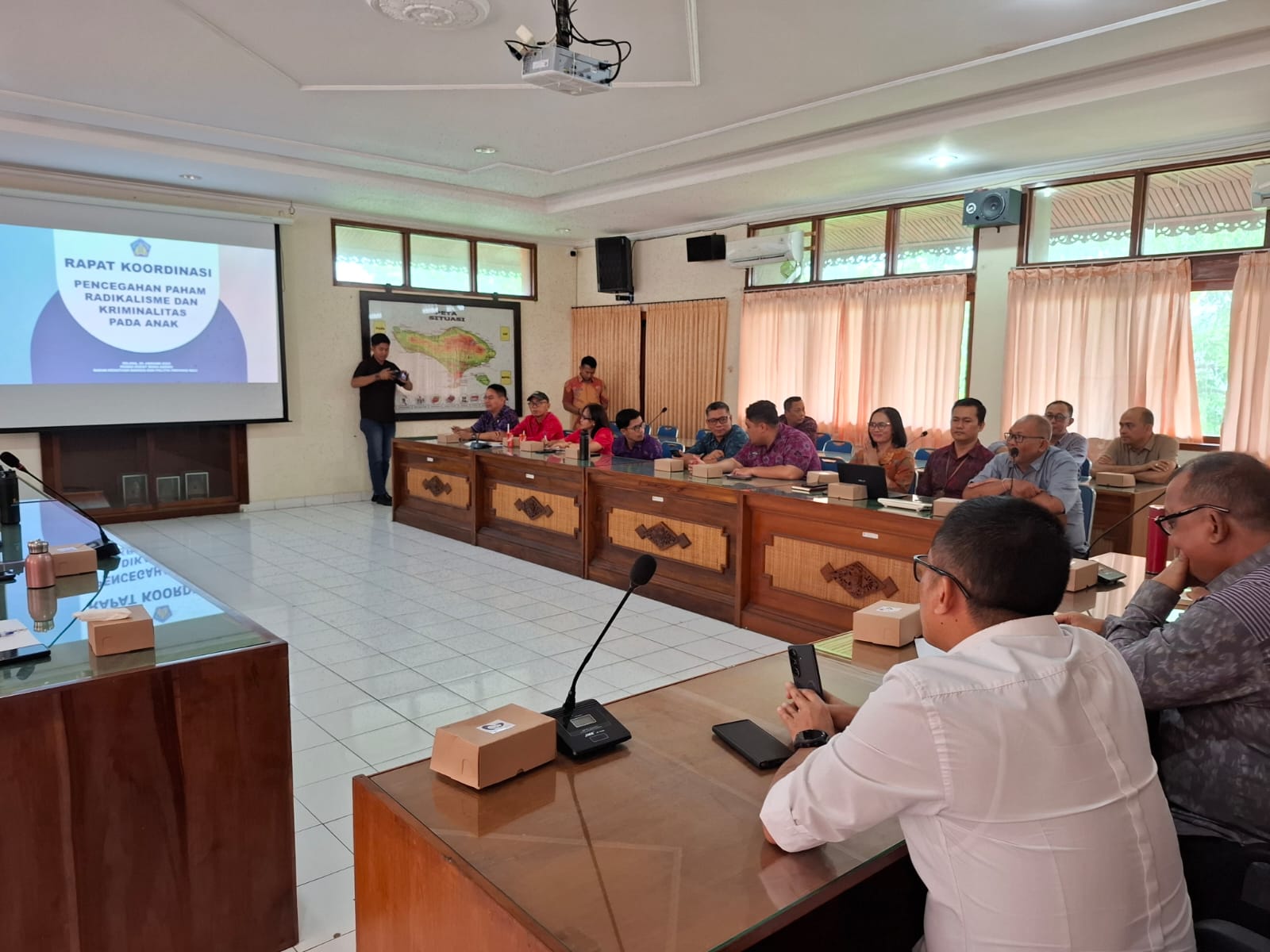 Selasa, 20 Januari 2026. Kepala Badan Kesatuan Bangsa dan Politik Provinsi Bali (Kaban Kesbangpol Bali), Gede Suralaga Pimpin Rapat Koordinasi Pencegahan Paham Radikalisme dan Kriminalitas pada Anak bertempat di Ruang Rapat Bung Karno, Gedung Bangsa Lt. II, Badan Kesbangpol Bali sebagai upaya langkah Koordinatif lintas sektor guna menyikapi dan merumuskan upaya pencegahan secara komprehensif dan berkelanjutan.