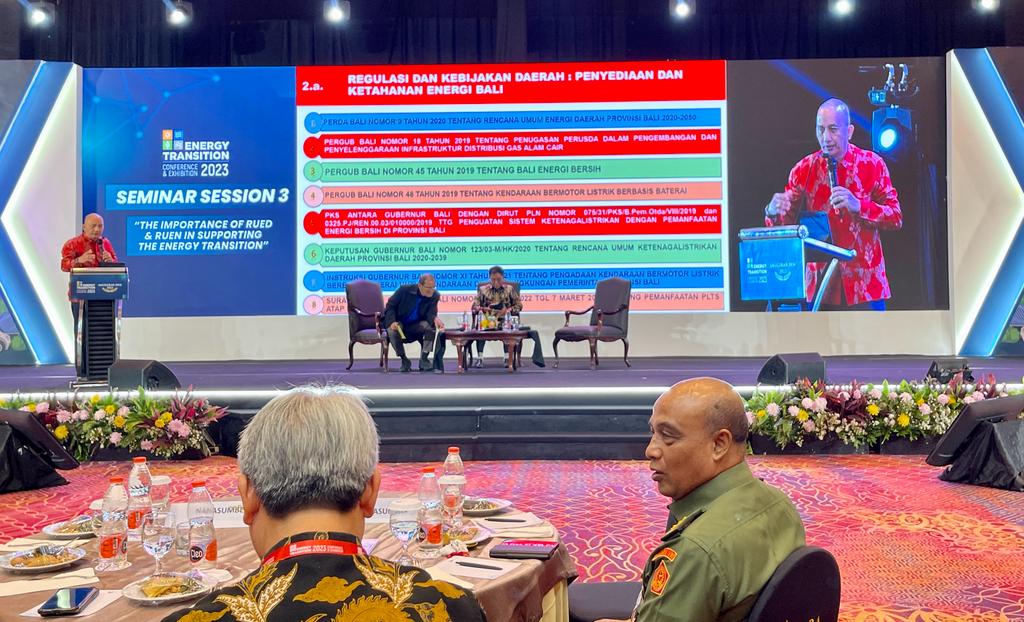 Kepala Dinas Ketenagakerjaan dan ESDM Provinsi Bali, IB setiawan didaulat mewakili Pj. Gubernur Bali mengisi Seminar Energy Transition 2023.