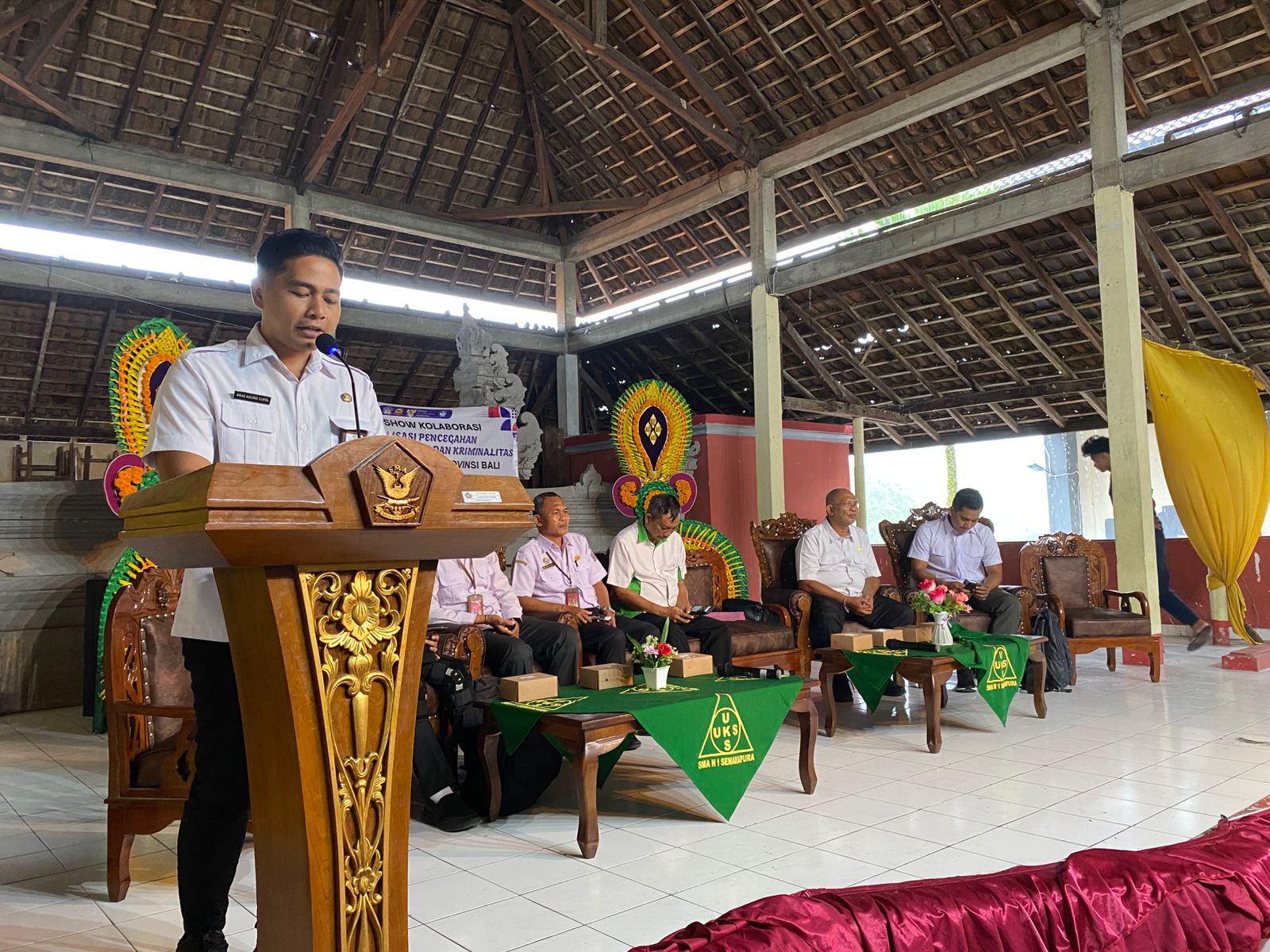 Sementara itu, sambutan Kepala Badan Kesbangpol Provinsi Bali yang dibacakan oleh Analis SDM Aparatur Ahli Muda A.A. Surya Pradipta, SSTP., MAP., menegaskan bahwa generasi muda merupakan kelompok yang rentan terpapar paham radikalisme maupun perilaku kriminalitas yang kerap masuk secara halus melalui berbagai media. Ia menekankan pentingnya penguatan karakter serta kemampuan menyaring informasi di tengah pesatnya perkembangan teknologi dan komunikasi. Selain itu, masyarakat Bali juga diingatkan untuk terus menjaga keharmonisan daerah sesuai dengan pola pembangunan Nangun Sat Kerti Loka Bali. “Generasi muda diharapkan mampu bersikap bijak dalam menyikapi berbagai informasi serta menjaga lingkungan yang positif agar tidak mudah terpengaruh ajaran radikalisme maupun kriminalitas,” jelasnya.