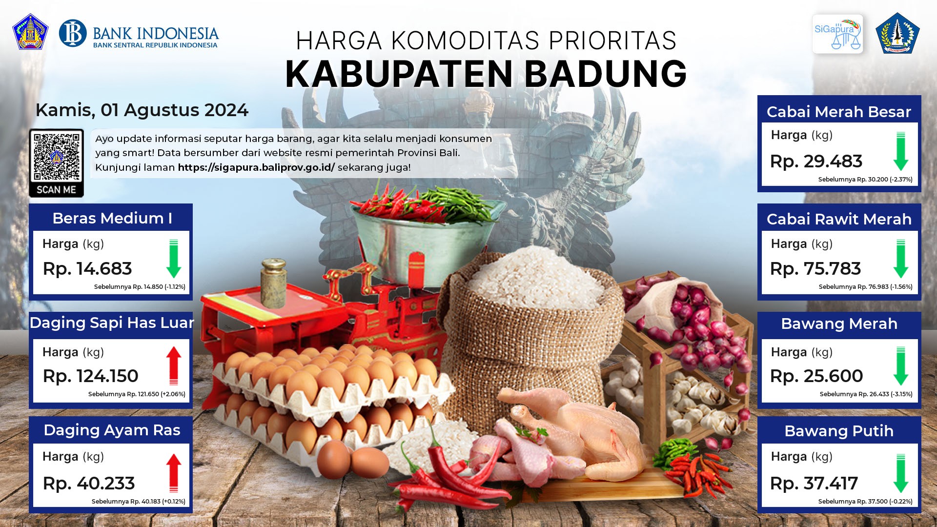 Berdasarkan pemantauan Harga Pangan Rata-Rata 7 (tujuh) Komoditas Prioritas di 60 Pasar seluruh Bali pada tanggal 01 Agustus 2024, diperoleh informasi Beras Medium I ada diharga Rp. 14.415, mengalami penurunan sebesar 0.02%. Daging Sapi Has Luar ada diharga Rp. 118.769, mengalami kenaikan sebesar 0.16%. Daging Ayam Ras ada diharga Rp. 39.936, mengalami kenaikan sebesar 0.02%. Cabai Merah Besar ada diharga Rp. 30.522, mengalami kenaikan sebesar 0.13%. Cabai Rawit Merah ada diharga Rp. 69.379, mengalami penurunan sebesar 8.14%. Bawang Merah ada diharga Rp. 21.732, mengalami penurunan sebesar 1.99%. Bawang Putih ada diharga Rp. 36.030, mengalami kenaikan sebesar 0.21%.