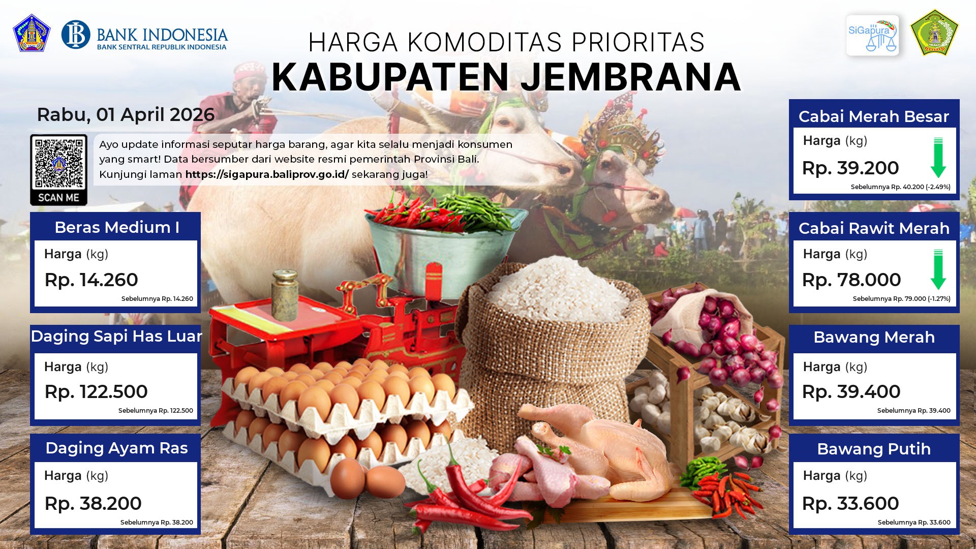 Berdasarkan pemantauan Harga Pangan Rata-Rata 7 (tujuh) Komoditas Prioritas di 60 Pasar seluruh Bali pada tanggal 01 April 2026, diperoleh informasi Beras Medium I ada diharga Rp. 14.375, mengalami penurunan sebesar 0.06%. Daging Sapi Has Luar tetap ada diharga Rp. 124.240. Daging Ayam Ras ada diharga Rp. 41.675, mengalami penurunan sebesar 0.06%. Cabai Merah Besar ada diharga Rp. 39.769, mengalami kenaikan sebesar 0.23%. Cabai Rawit Merah ada diharga Rp. 74.902, mengalami penurunan sebesar 0.53%. Bawang Merah ada diharga Rp. 41.264, mengalami kenaikan sebesar 2.83%. Bawang Putih ada diharga Rp. 33.486, mengalami penurunan sebesar 0.44%.