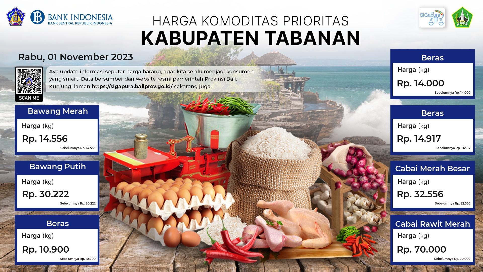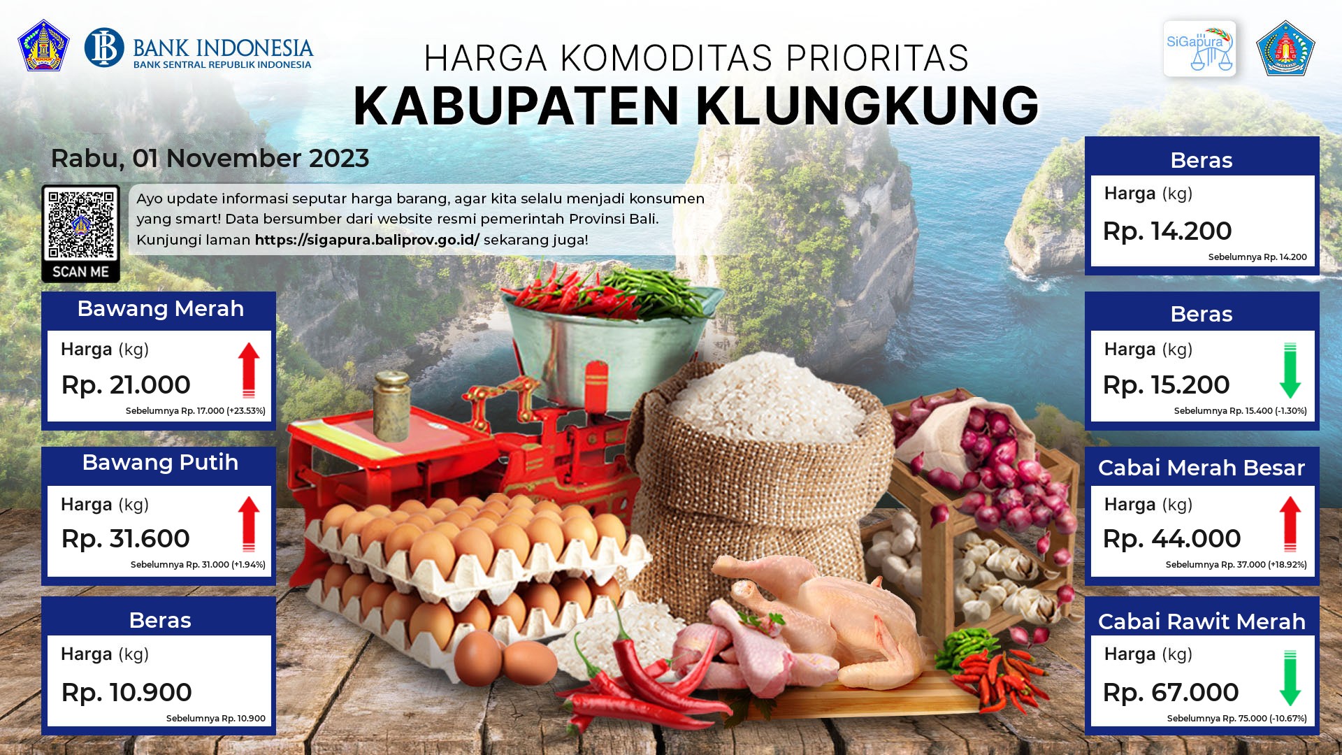 Berdasarkan pemantauan Harga Pangan Rata-Rata 7 (tujuh) Komoditas Prioritas di 60 Pasar seluruh Bali pada tanggal 01 November 2023, diperoleh informasi Bawang Merah ada diharga Rp. 17.331, mengalami kenaikan sebesar 5.89%. Bawang Putih ada diharga Rp. 32.398, mengalami kenaikan sebesar 0.76%. Beras tetap ada diharga Rp. 10.894. Beras ada diharga Rp. 13.889, mengalami kenaikan sebesar 0.19%. Beras ada diharga Rp. 14.980, mengalami penurunan sebesar 0.13%. Cabai Merah Besar ada diharga Rp. 37.161, mengalami kenaikan sebesar 4.81%. Cabai Rawit Merah ada diharga Rp. 66.284, mengalami penurunan sebesar 5.28%. Daging Ayam Ras ada diharga Rp. 38.955, mengalami kenaikan sebesar 0.23%. Daging Sapi Has Luar tetap ada diharga Rp. 119.797.
