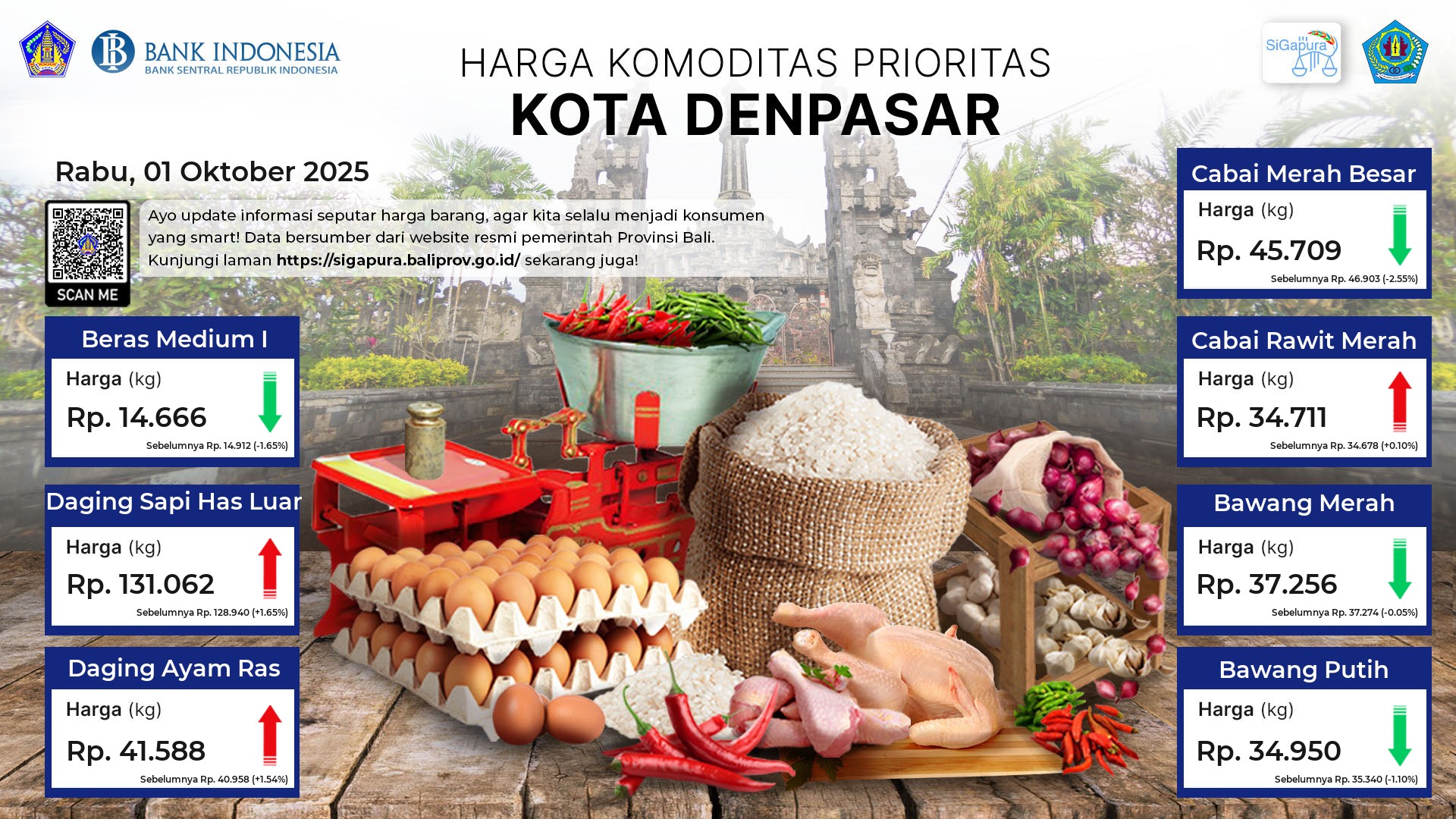Berdasarkan pemantauan Harga Pangan Rata-Rata 7 (tujuh) Komoditas Prioritas di 60 Pasar seluruh Bali pada tanggal 01 Oktober 2025, diperoleh informasi Beras Medium I ada diharga Rp. 14.777, mengalami kenaikan sebesar 0.05%. Daging Sapi Has Luar ada diharga Rp. 121.412, mengalami kenaikan sebesar 0.35%. Daging Ayam Ras ada diharga Rp. 42.974, mengalami kenaikan sebesar 0.65%. Cabai Merah Besar ada diharga Rp. 41.571, mengalami penurunan sebesar 2.37%. Cabai Rawit Merah ada diharga Rp. 33.321, mengalami penurunan sebesar 0.60%. Bawang Merah ada diharga Rp. 31.836, mengalami penurunan sebesar 0.89%. Bawang Putih ada diharga Rp. 31.923, mengalami penurunan sebesar 0.08%.