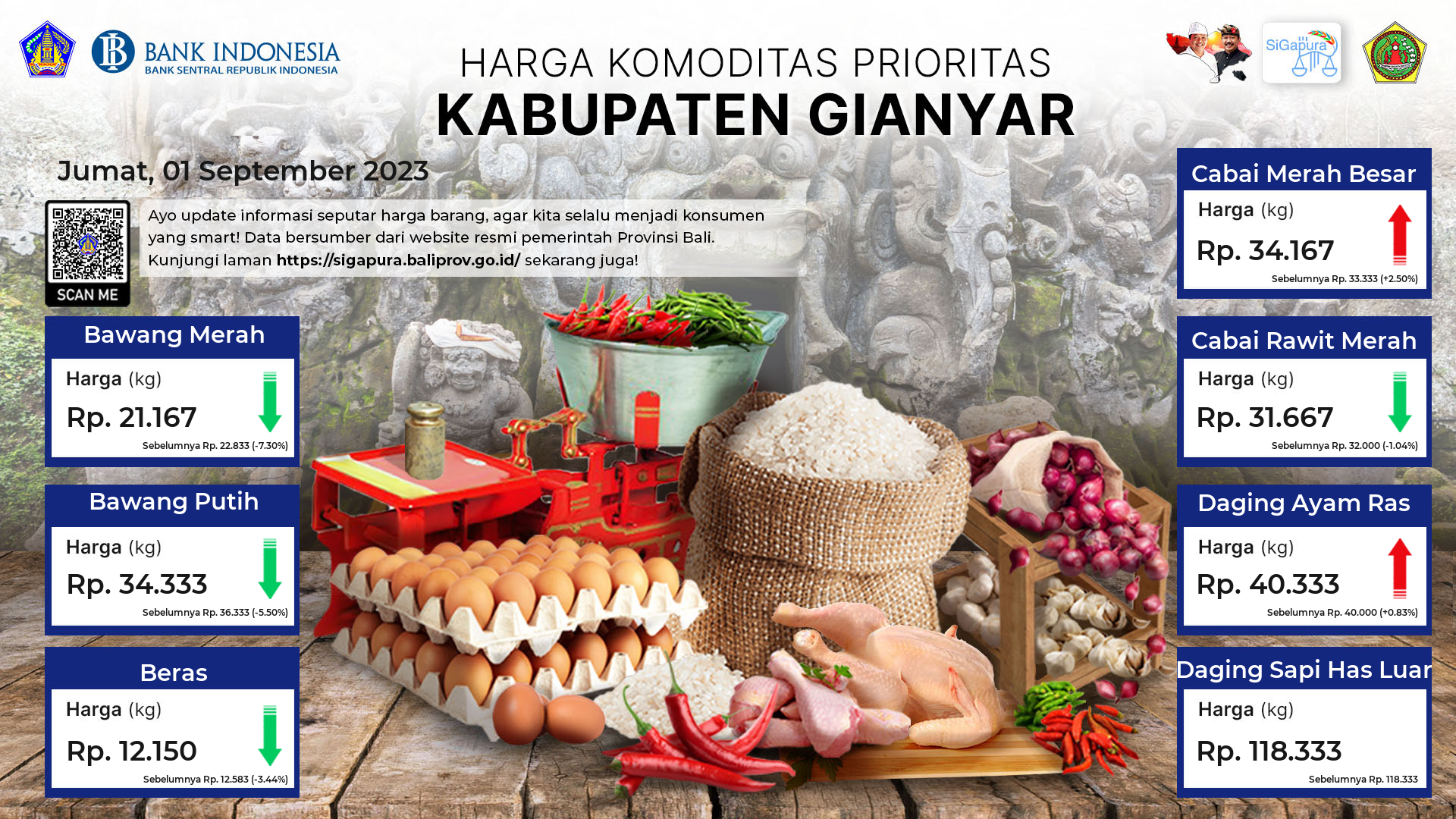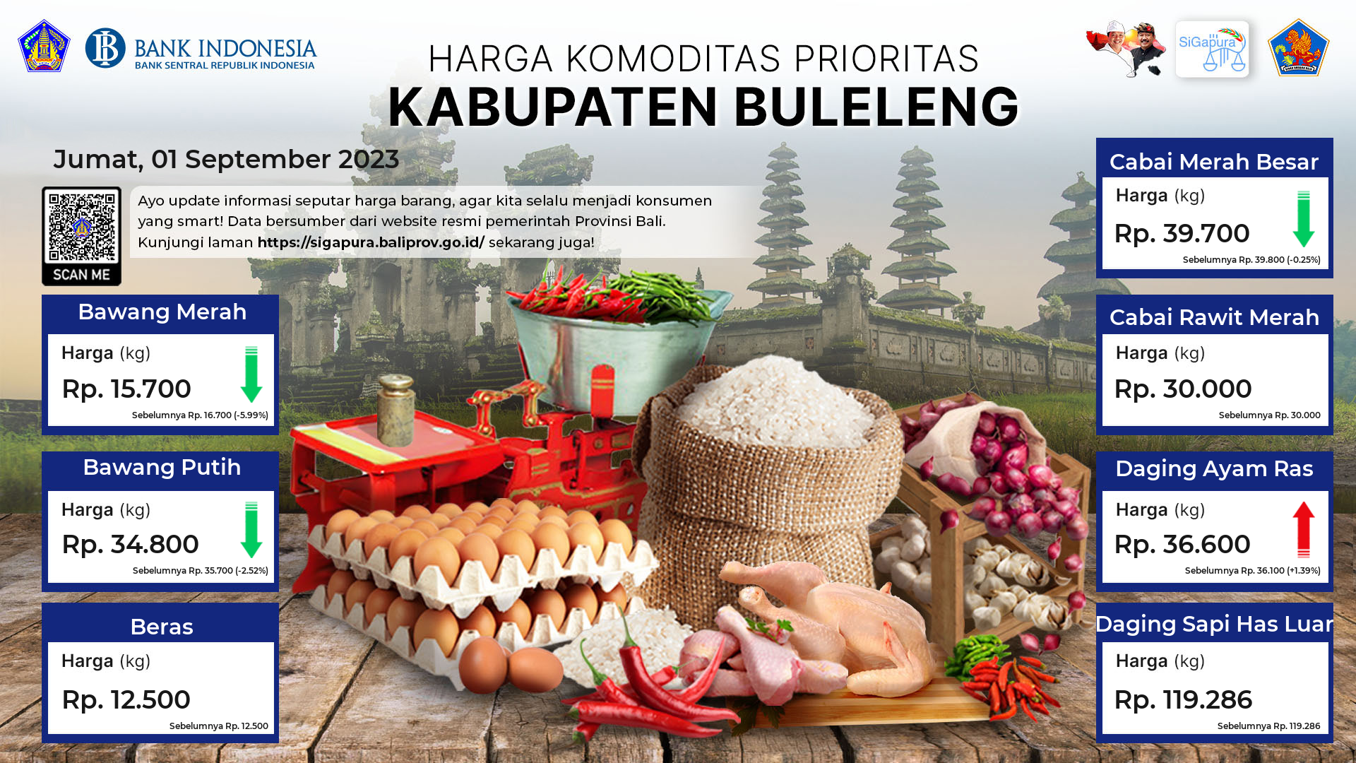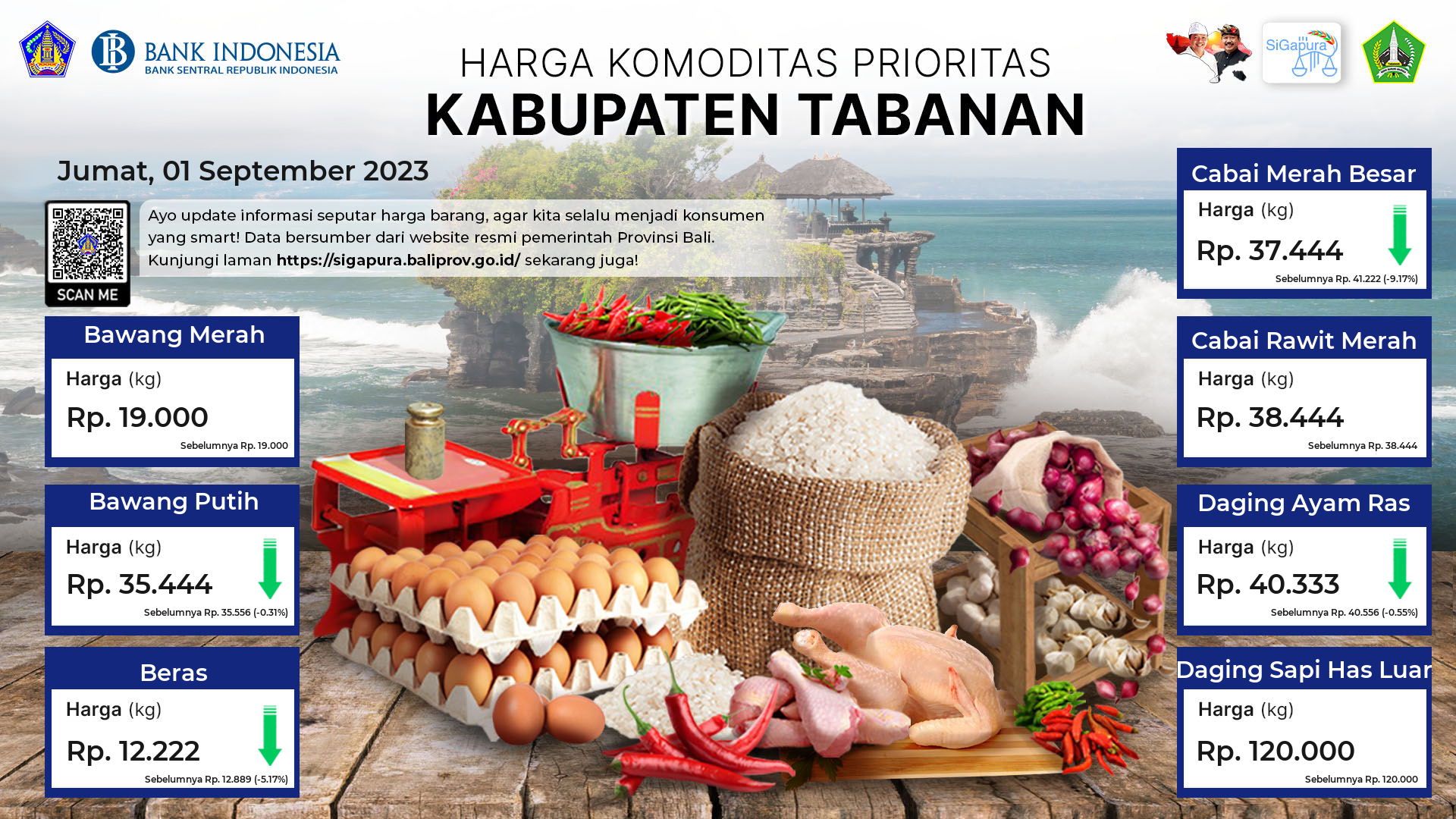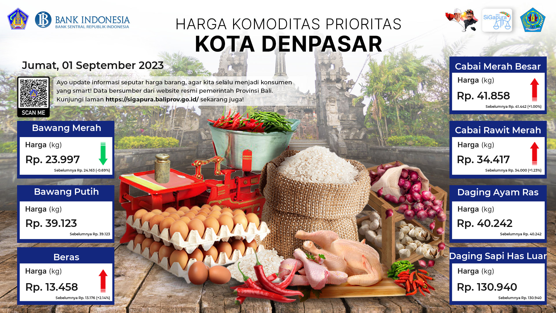 Berdasarkan pemantauan Harga Pangan Rata-Rata 7 (tujuh) Komoditas Prioritas di 60 Pasar seluruh Bali pada tanggal 01 September 2023, diperoleh informasi Bawang Merah ada diharga Rp. 19.727, mengalami penurunan sebesar 2.84%. Bawang Putih ada diharga Rp. 35.959, mengalami kenaikan sebesar 0.15%. Beras ada diharga Rp. 12.748, mengalami penurunan sebesar 0.95%. Cabai Merah Besar ada diharga Rp. 39.821, mengalami penurunan sebesar 1.08%. Cabai Rawit Merah ada diharga Rp. 31.315, mengalami penurunan sebesar 0.54%. Daging Ayam Ras ada diharga Rp. 39.657, mengalami penurunan sebesar 0.23%. Daging Sapi Has Luar tetap ada diharga Rp. 122.364.
