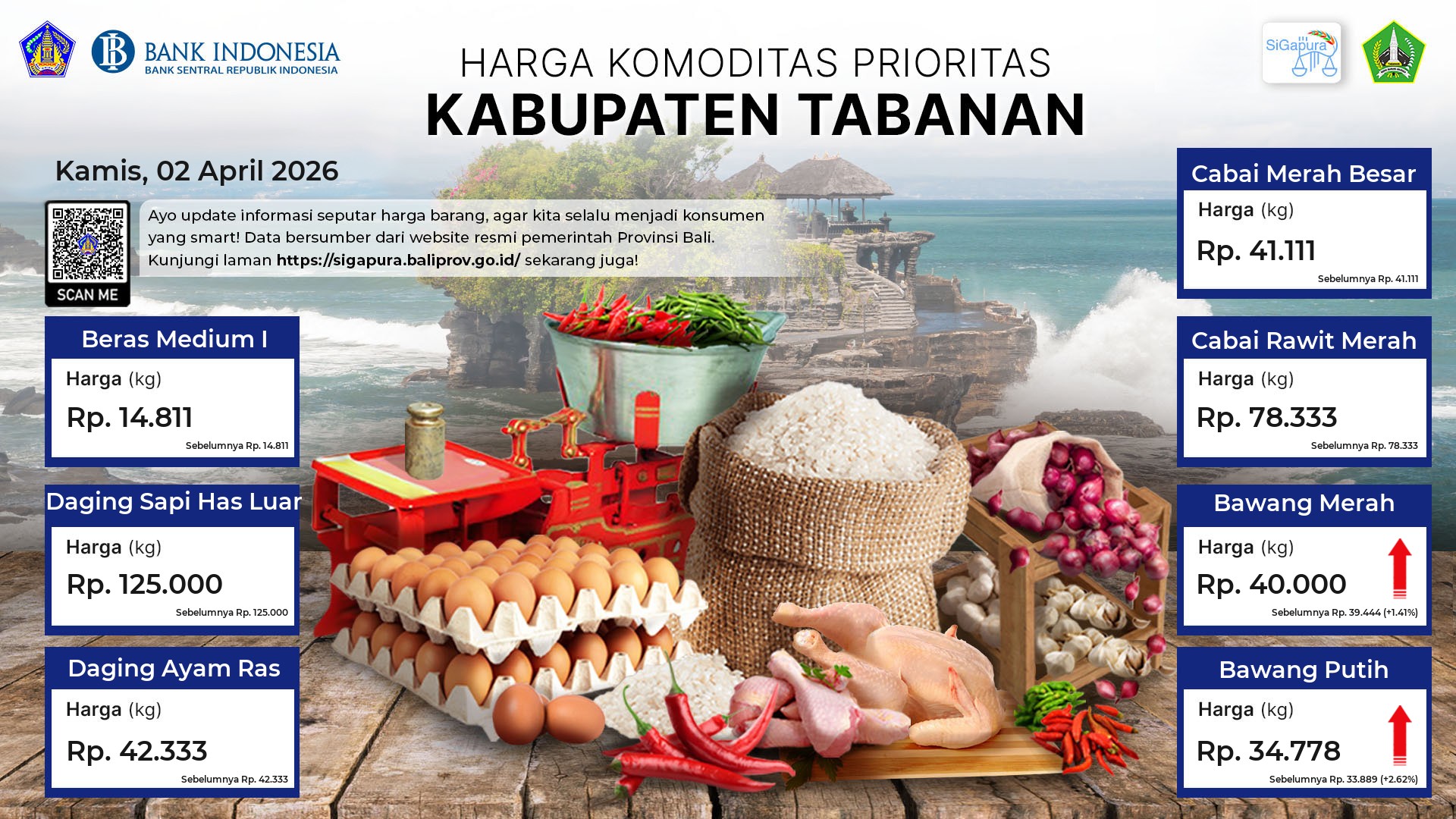 Berdasarkan pemantauan Harga Pangan Rata-Rata 7 (tujuh) Komoditas Prioritas di 60 Pasar seluruh Bali pada tanggal 02 April 2026, diperoleh informasi Beras Medium I ada diharga Rp. 14.391, mengalami kenaikan sebesar 0.11%. Daging Sapi Has Luar ada diharga Rp. 120.150, mengalami penurunan sebesar 3.29%. Daging Ayam Ras ada diharga Rp. 41.387, mengalami penurunan sebesar 0.69%. Cabai Merah Besar ada diharga Rp. 39.904, mengalami kenaikan sebesar 0.34%. Cabai Rawit Merah ada diharga Rp. 73.804, mengalami penurunan sebesar 1.47%. Bawang Merah ada diharga Rp. 41.166, mengalami penurunan sebesar 0.24%. Bawang Putih ada diharga Rp. 33.681, mengalami kenaikan sebesar 0.58%.