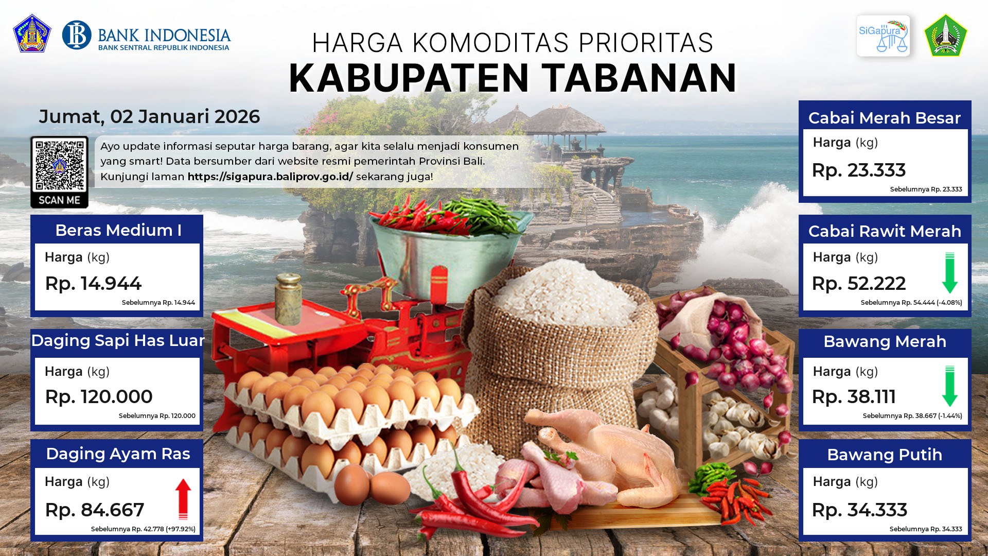 Berdasarkan pemantauan Harga Pangan Rata-Rata 7 (tujuh) Komoditas Prioritas di 60 Pasar seluruh Bali pada tanggal 02 Januari 2026, diperoleh informasi Beras Medium I ada diharga Rp. 14.498, mengalami kenaikan sebesar 0.12%. Daging Sapi Has Luar tetap ada diharga Rp. 120.638. Daging Ayam Ras ada diharga Rp. 48.155, mengalami kenaikan sebesar 16.20%. Cabai Merah Besar ada diharga Rp. 28.159, mengalami penurunan sebesar 4.95%. Cabai Rawit Merah ada diharga Rp. 56.235, mengalami penurunan sebesar 1.39%. Bawang Merah ada diharga Rp. 40.331, mengalami penurunan sebesar 3.85%. Bawang Putih ada diharga Rp. 33.327, mengalami penurunan sebesar 1.27%.