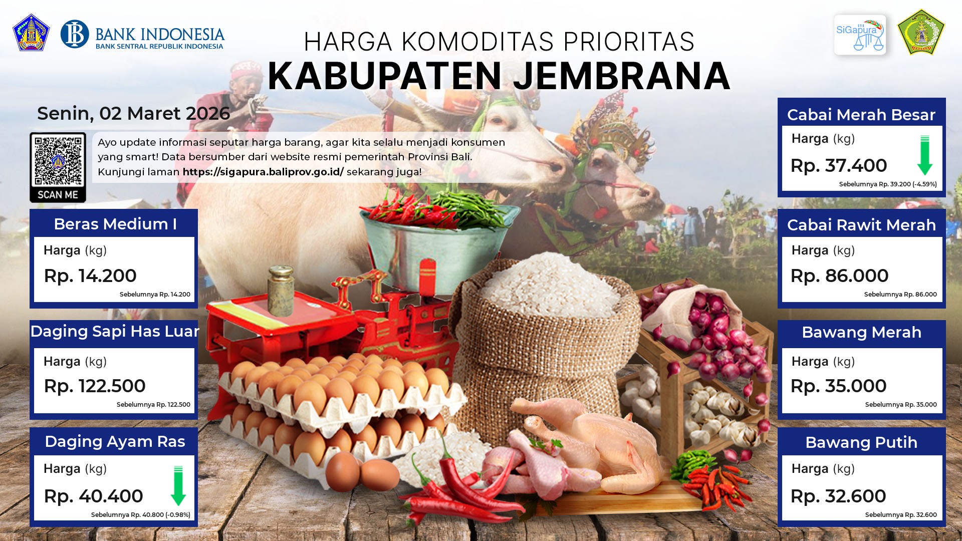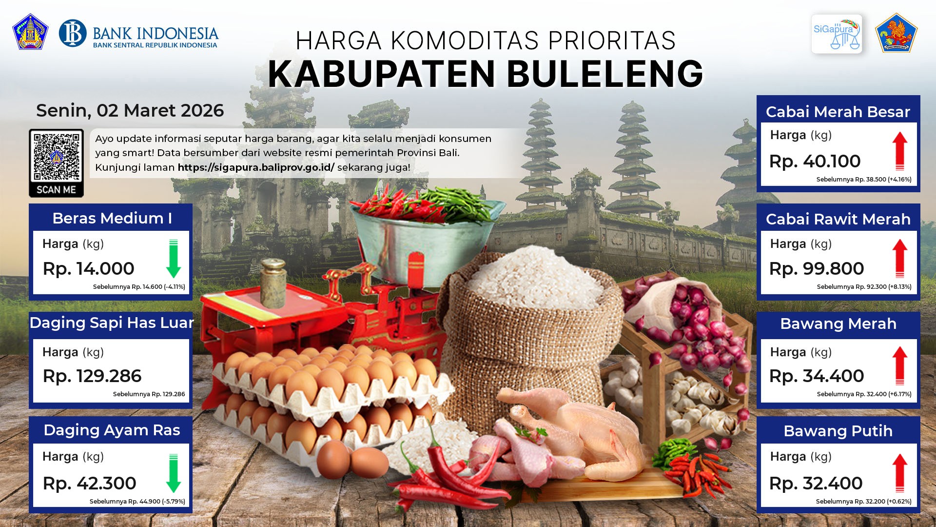 Berdasarkan pemantauan Harga Pangan Rata-Rata 7 (tujuh) Komoditas Prioritas di 60 Pasar seluruh Bali pada tanggal 02 Maret 2026, diperoleh informasi Beras Medium I ada diharga Rp. 14.369, mengalami penurunan sebesar 0.70%. Daging Sapi Has Luar tetap ada diharga Rp. 123.698. Daging Ayam Ras ada diharga Rp. 42.412, mengalami penurunan sebesar 1.43%. Cabai Merah Besar ada diharga Rp. 40.046, mengalami kenaikan sebesar 2.37%. Cabai Rawit Merah ada diharga Rp. 88.228, mengalami kenaikan sebesar 3.33%. Bawang Merah ada diharga Rp. 36.578, mengalami kenaikan sebesar 1.51%. Bawang Putih ada diharga Rp. 33.284, mengalami penurunan sebesar 1.76%.