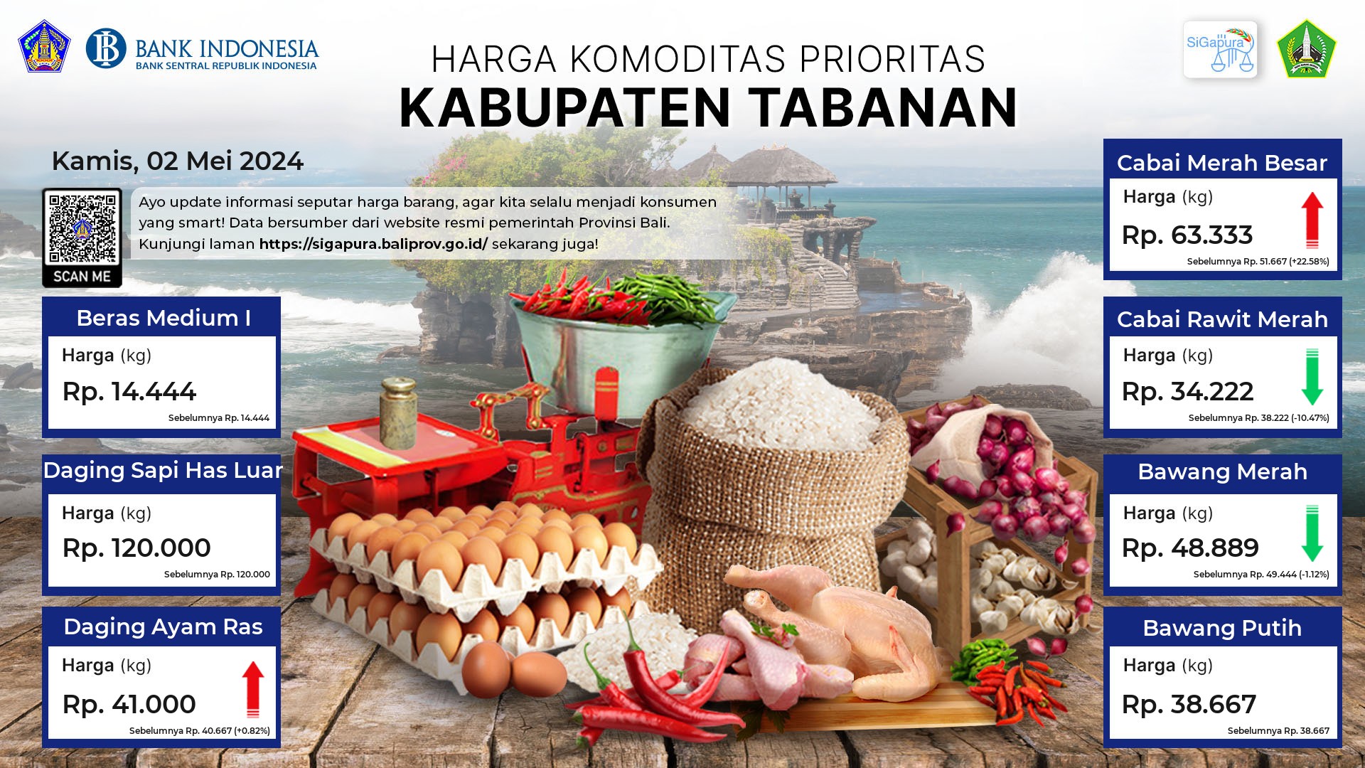 Berdasarkan pemantauan Harga Pangan Rata-Rata 7 (tujuh) Komoditas Prioritas di 60 Pasar seluruh Bali pada tanggal 02 Mei 2024, diperoleh informasi Beras Medium I ada diharga Rp. 14.199, mengalami penurunan sebesar 0.06%. Daging Sapi Has Luar ada diharga Rp. 118.533, mengalami kenaikan sebesar 0.05%. Daging Ayam Ras ada diharga Rp. 39.821, mengalami penurunan sebesar 1.08%. Cabai Merah Besar ada diharga Rp. 57.659, mengalami kenaikan sebesar 11.52%. Cabai Rawit Merah ada diharga Rp. 32.161, mengalami penurunan sebesar 6.33%. Bawang Merah ada diharga Rp. 47.414, mengalami penurunan sebesar 0.39%. Bawang Putih ada diharga Rp. 38.370, mengalami kenaikan sebesar 0.47%.
