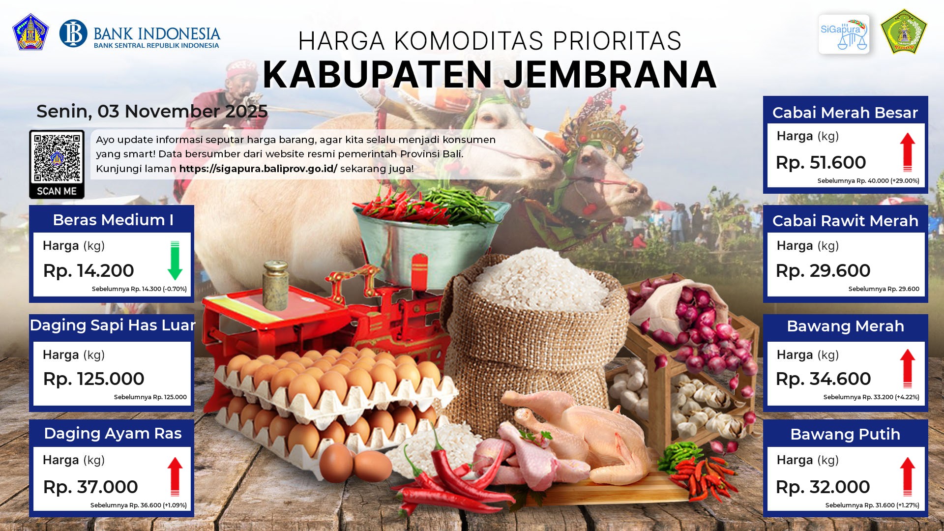 Berdasarkan pemantauan Harga Pangan Rata-Rata 7 (tujuh) Komoditas Prioritas di 60 Pasar seluruh Bali pada tanggal 03 November 2025, diperoleh informasi Beras Medium I ada diharga Rp. 14.596, mengalami penurunan sebesar 0.11%. Daging Sapi Has Luar ada diharga Rp. 121.888, mengalami kenaikan sebesar 0.06%. Daging Ayam Ras ada diharga Rp. 40.850, mengalami penurunan sebesar 0.03%. Cabai Merah Besar ada diharga Rp. 44.201, mengalami kenaikan sebesar 6.28%. Cabai Rawit Merah ada diharga Rp. 29.324, mengalami penurunan sebesar 3.25%. Bawang Merah ada diharga Rp. 35.611, mengalami kenaikan sebesar 1.75%. Bawang Putih ada diharga Rp. 32.651, mengalami penurunan sebesar 1.38%.