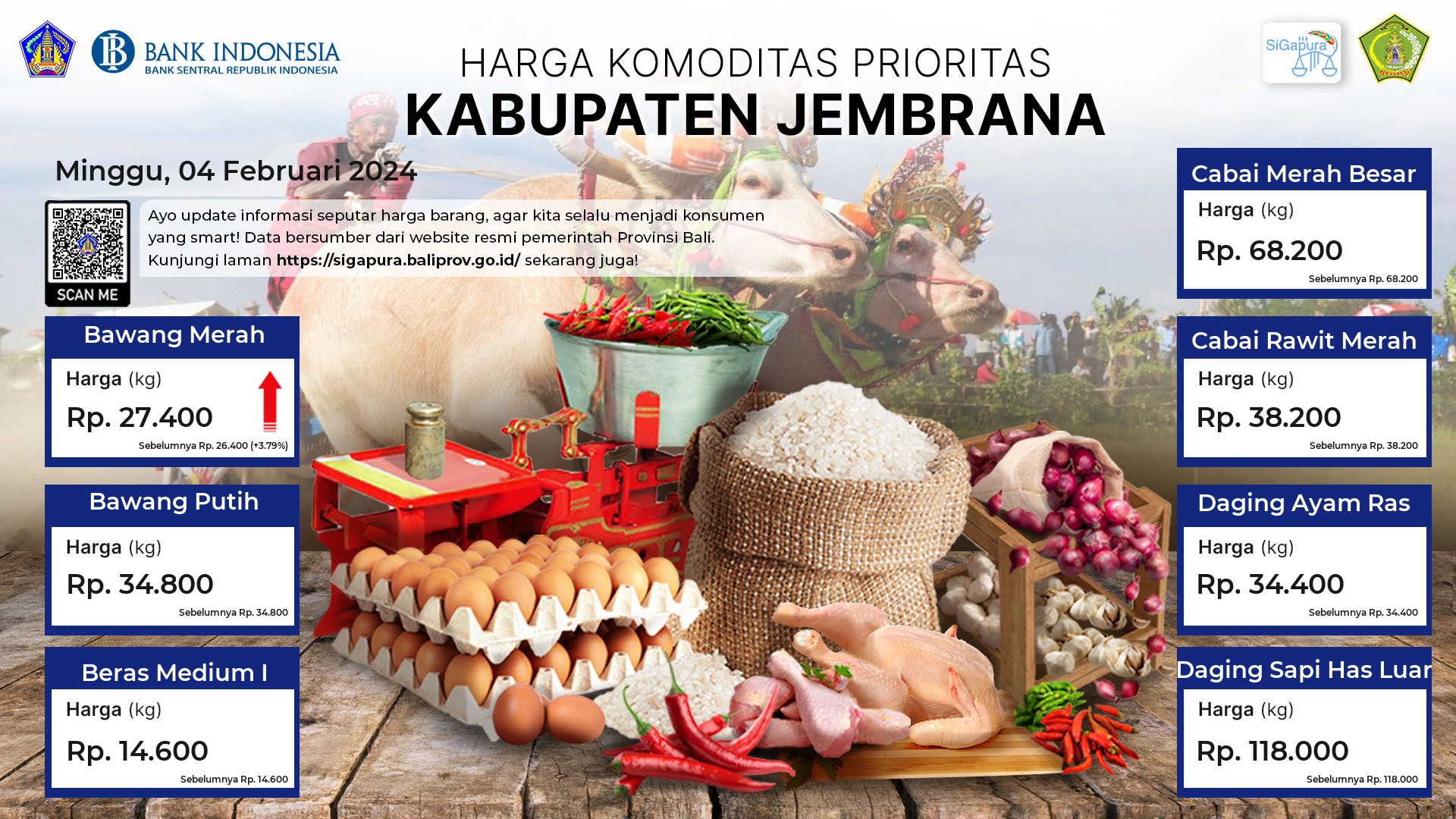 Berdasarkan pemantauan Harga Pangan Rata-Rata 7 (tujuh) Komoditas Prioritas di 60 Pasar seluruh Bali pada tanggal 04 Februari 2024, diperoleh informasi Bawang Merah ada diharga Rp. 28.783, mengalami penurunan sebesar 0.48%. Bawang Putih tetap ada diharga Rp. 33.903. Beras Medium I tetap ada diharga Rp. 14.260. Cabai Merah Besar ada diharga Rp. 70.927, mengalami penurunan sebesar 0.37%. Cabai Rawit Merah ada diharga Rp. 36.100, mengalami kenaikan sebesar 0.15%. Daging Ayam Ras ada diharga Rp. 37.888, mengalami kenaikan sebesar 0.14%. Daging Sapi Has Luar tetap ada diharga Rp. 118.507.