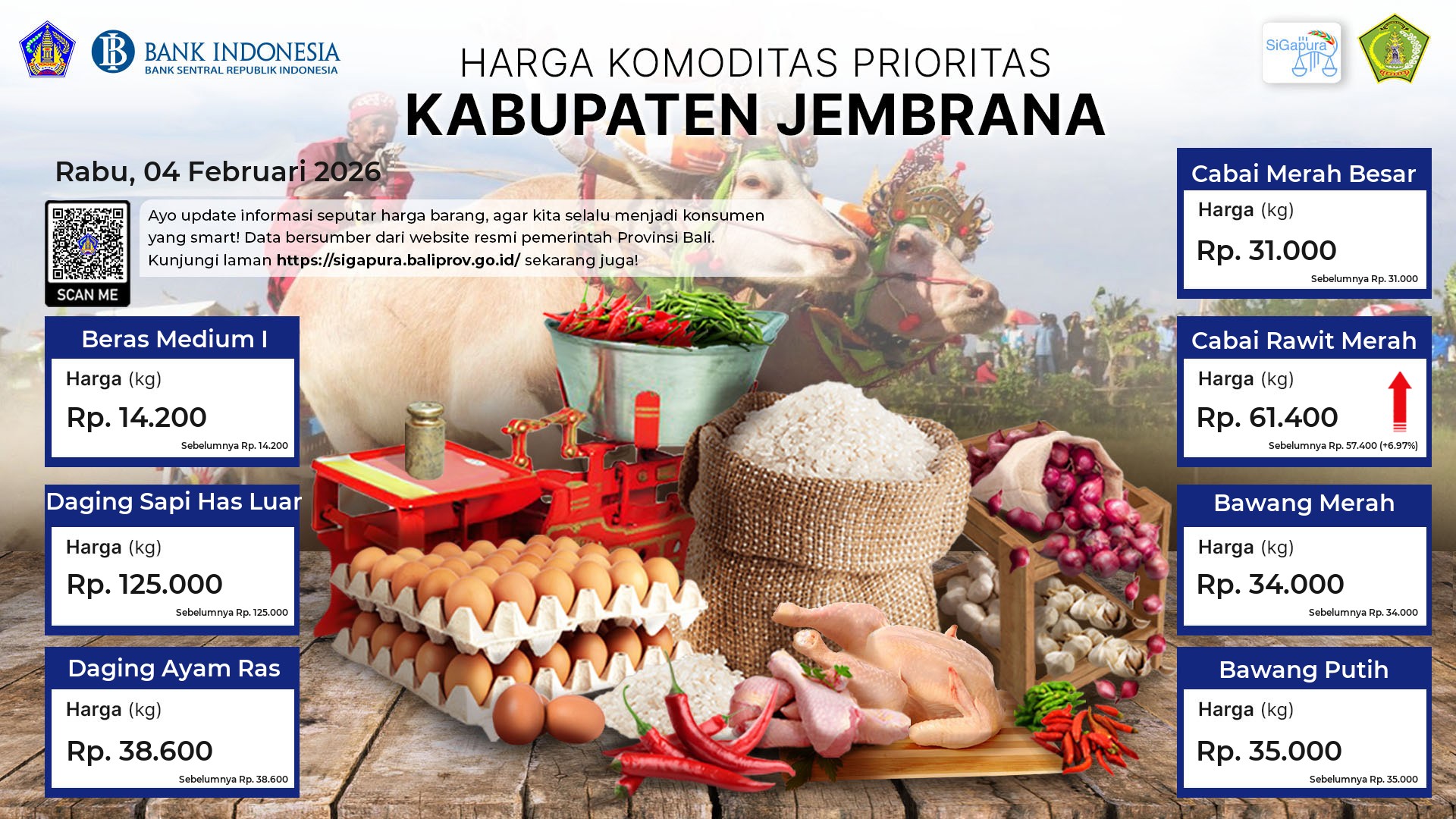 Berdasarkan pemantauan Harga Pangan Rata-Rata 7 (tujuh) Komoditas Prioritas di 60 Pasar seluruh Bali pada tanggal 04 Februari 2026, diperoleh informasi Beras Medium I ada diharga Rp. 14.520, mengalami kenaikan sebesar 0.10%. Daging Sapi Has Luar ada diharga Rp. 112.263, mengalami penurunan sebesar 7.46%. Daging Ayam Ras ada diharga Rp. 41.422, mengalami kenaikan sebesar 0.08%. Cabai Merah Besar ada diharga Rp. 32.121, mengalami kenaikan sebesar 0.84%. Cabai Rawit Merah ada diharga Rp. 66.594, mengalami kenaikan sebesar 6.64%. Bawang Merah ada diharga Rp. 34.459, mengalami penurunan sebesar 0.79%. Bawang Putih ada diharga Rp. 34.805, mengalami penurunan sebesar 1.00%.