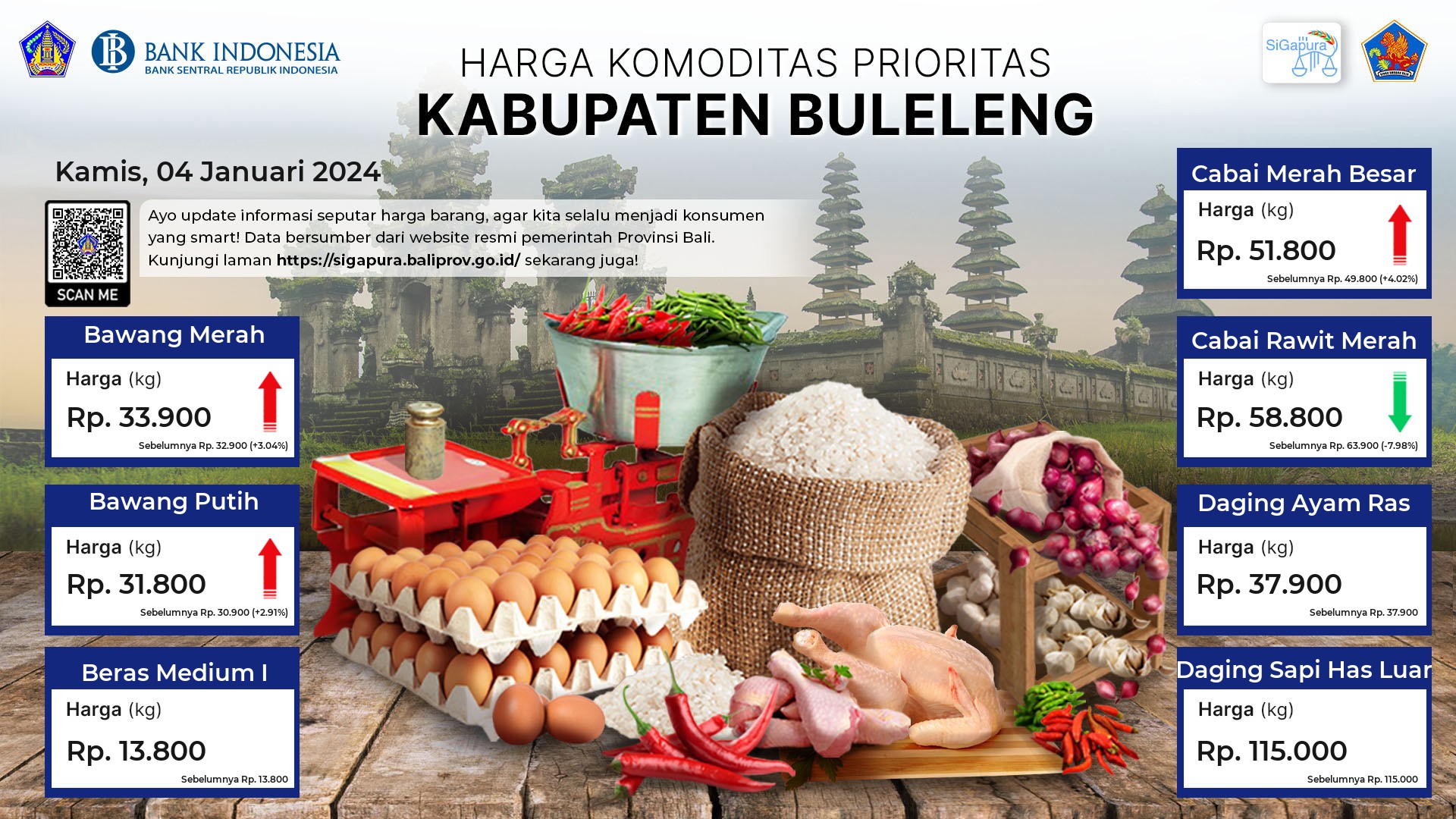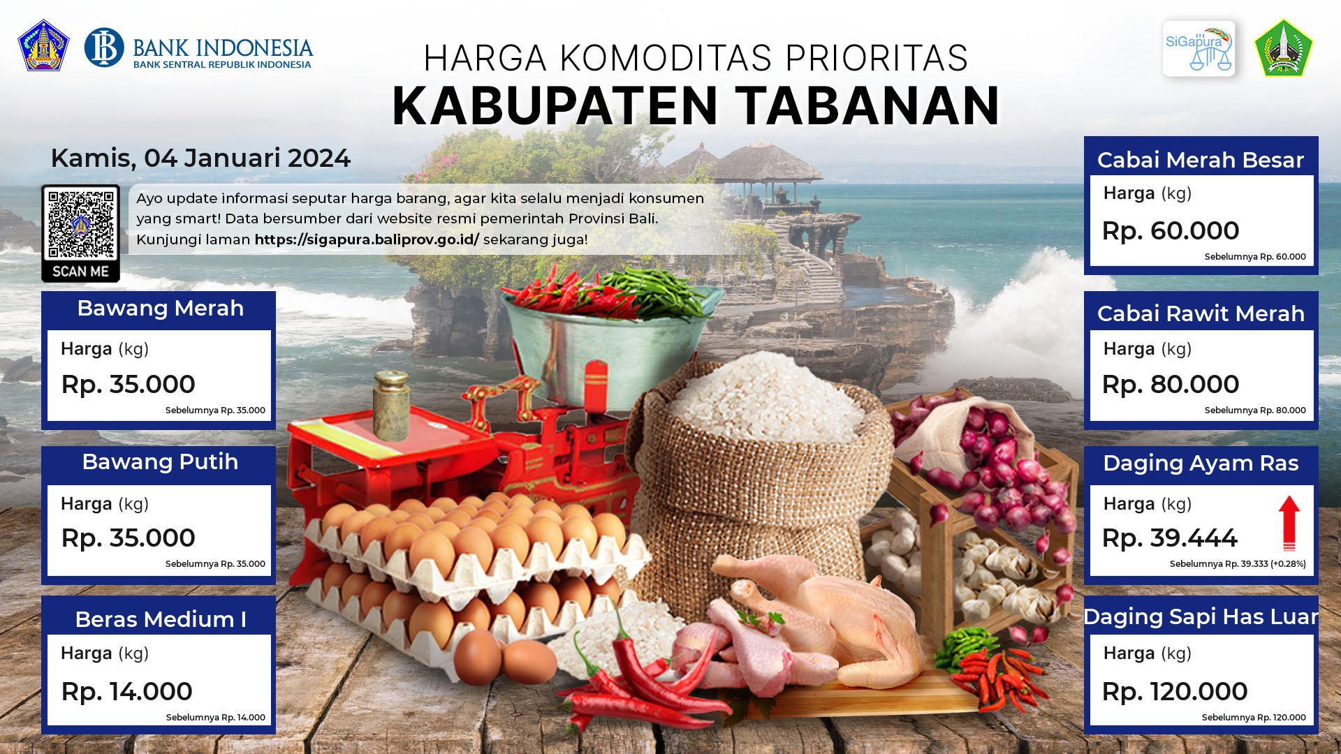 Berdasarkan pemantauan Harga Pangan Rata-Rata 7 (tujuh) Komoditas Prioritas di 60 Pasar seluruh Bali pada tanggal 04 Januari 2024, diperoleh informasi Bawang Merah ada diharga Rp. 35.737, mengalami kenaikan sebesar 1.43%. Bawang Putih ada diharga Rp. 34.386, mengalami kenaikan sebesar 0.43%. Beras Medium I ada diharga Rp. 13.854, mengalami penurunan sebesar 0.48%. Cabai Merah Besar ada diharga Rp. 54.302, mengalami penurunan sebesar 1.84%. Cabai Rawit Merah ada diharga Rp. 73.782, mengalami penurunan sebesar 3.44%. Daging Ayam Ras ada diharga Rp. 38.921, mengalami penurunan sebesar 0.50%. Daging Sapi Has Luar ada diharga Rp. 119.407, mengalami penurunan sebesar 0.59%.