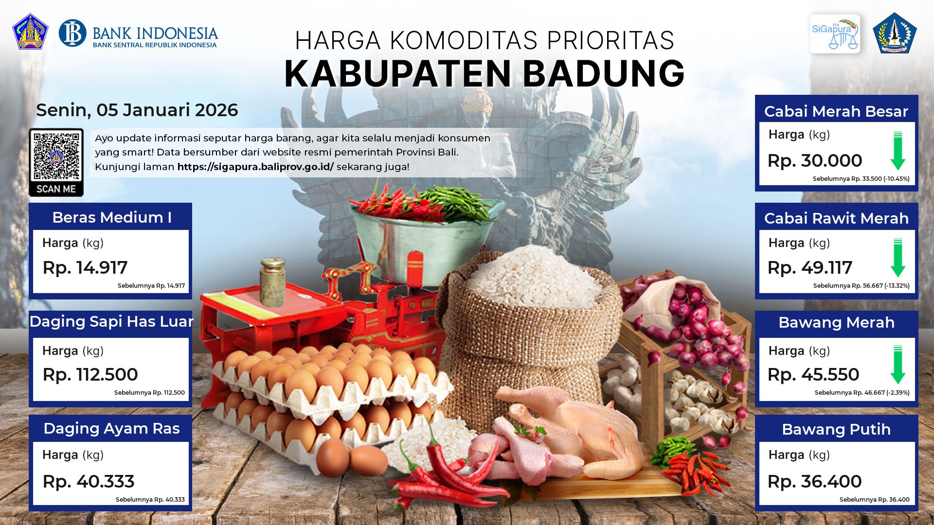 Berdasarkan pemantauan Harga Pangan Rata-Rata 7 (tujuh) Komoditas Prioritas di 60 Pasar seluruh Bali pada tanggal 05 Januari 2026, diperoleh informasi Beras Medium I ada diharga Rp. 14.517, mengalami kenaikan sebesar 0.13%. Daging Sapi Has Luar tetap ada diharga Rp. 120.638. Daging Ayam Ras ada diharga Rp. 41.286, mengalami penurunan sebesar 14.26%. Cabai Merah Besar ada diharga Rp. 27.177, mengalami penurunan sebesar 3.49%. Cabai Rawit Merah ada diharga Rp. 49.343, mengalami penurunan sebesar 12.20%. Bawang Merah ada diharga Rp. 38.913, mengalami penurunan sebesar 3.64%. Bawang Putih ada diharga Rp. 33.380, mengalami kenaikan sebesar 0.05%.