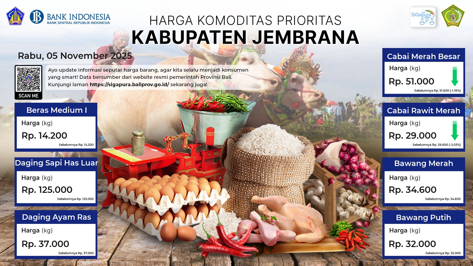 Berdasarkan pemantauan Harga Pangan Rata-Rata 7 (tujuh) Komoditas Prioritas di 60 Pasar seluruh Bali pada tanggal 05 November 2025, diperoleh informasi Beras Medium I ada diharga Rp. 14.582, mengalami penurunan sebesar 0.02%. Daging Sapi Has Luar ada diharga Rp. 121.680, mengalami penurunan sebesar 0.17%. Daging Ayam Ras ada diharga Rp. 41.082, mengalami kenaikan sebesar 0.51%. Cabai Merah Besar ada diharga Rp. 46.280, mengalami kenaikan sebesar 1.55%. Cabai Rawit Merah ada diharga Rp. 29.071, mengalami penurunan sebesar 0.54%. Bawang Merah ada diharga Rp. 35.510, mengalami penurunan sebesar 0.03%. Bawang Putih ada diharga Rp. 32.479, mengalami penurunan sebesar 1.15%.