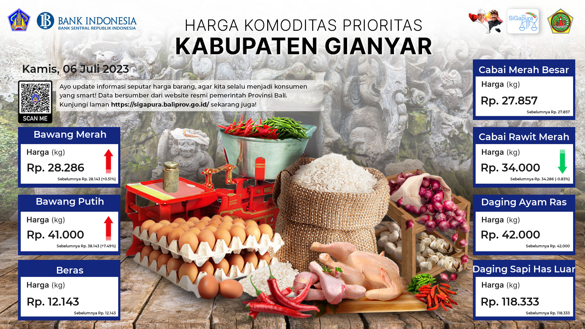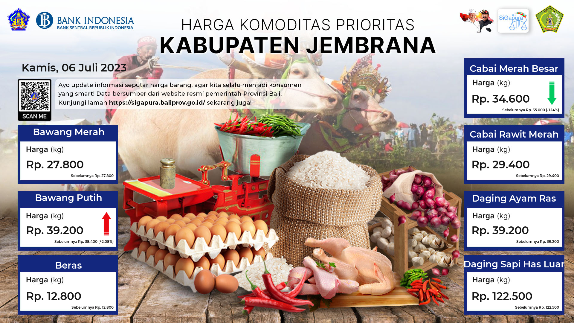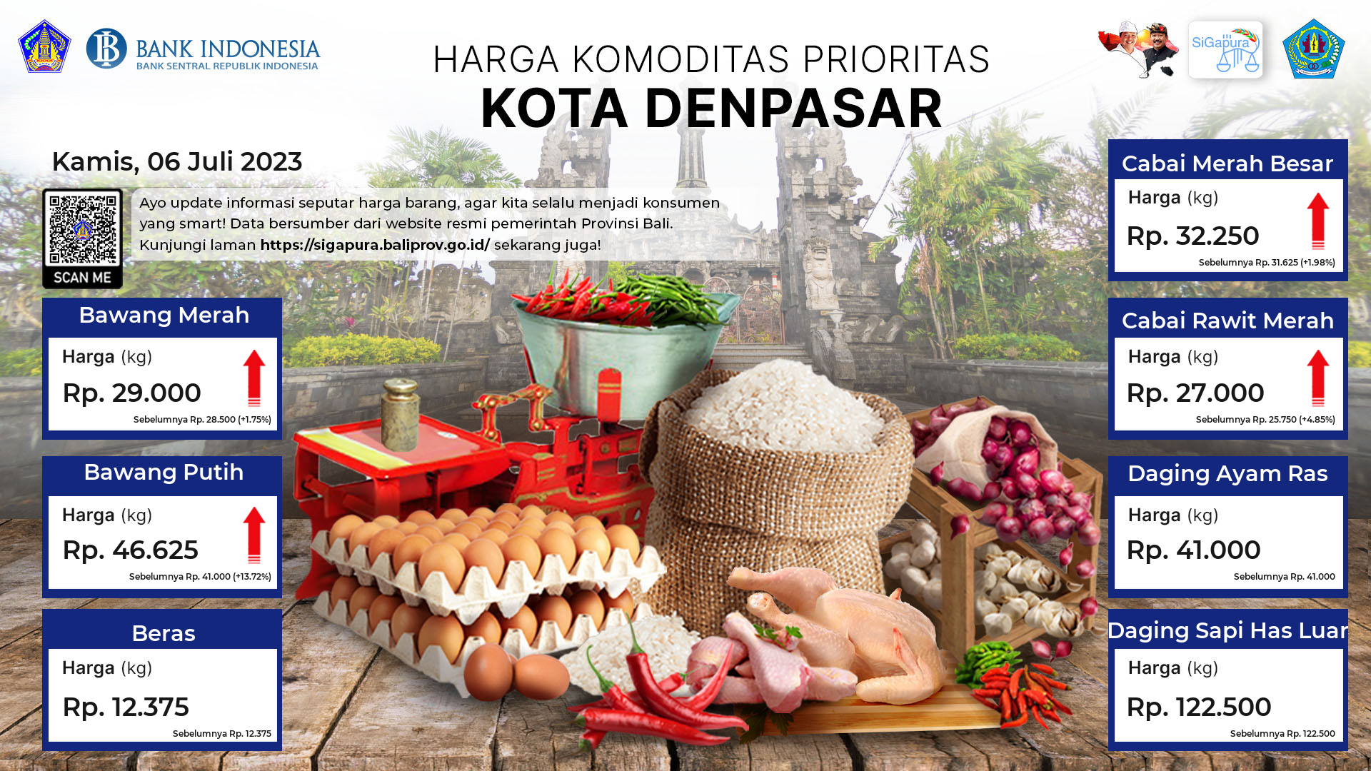 Berdasarkan pemantauan Harga Pangan Rata-Rata 7 (tujuh) Komoditas Prioritas di 60 Pasar seluruh Bali pada tanggal 06 Juli 2023, diperoleh informasi Bawang Merah ada diharga Rp. 28.522, mengalami penurunan sebesar 0.97%. Bawang Putih ada diharga Rp. 43.542, mengalami kenaikan sebesar 8.03%. Beras ada diharga Rp. 12.096, mengalami kenaikan sebesar 0.02%. Cabai Merah Besar ada diharga Rp. 33.042, mengalami penurunan sebesar 4.48%. Cabai Rawit Merah ada diharga Rp. 29.062, mengalami penurunan sebesar 2.00%. Daging Ayam Ras ada diharga Rp. 41.667, mengalami penurunan sebesar 0.49%. Daging Sapi Has Luar tetap ada diharga Rp. 120.626.