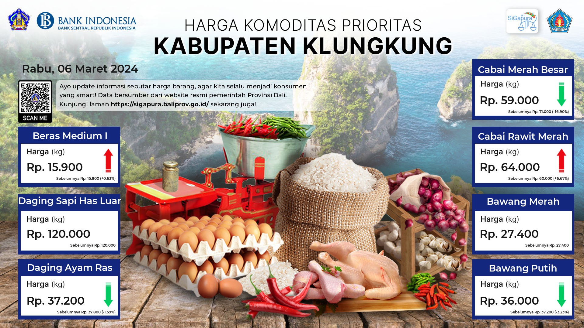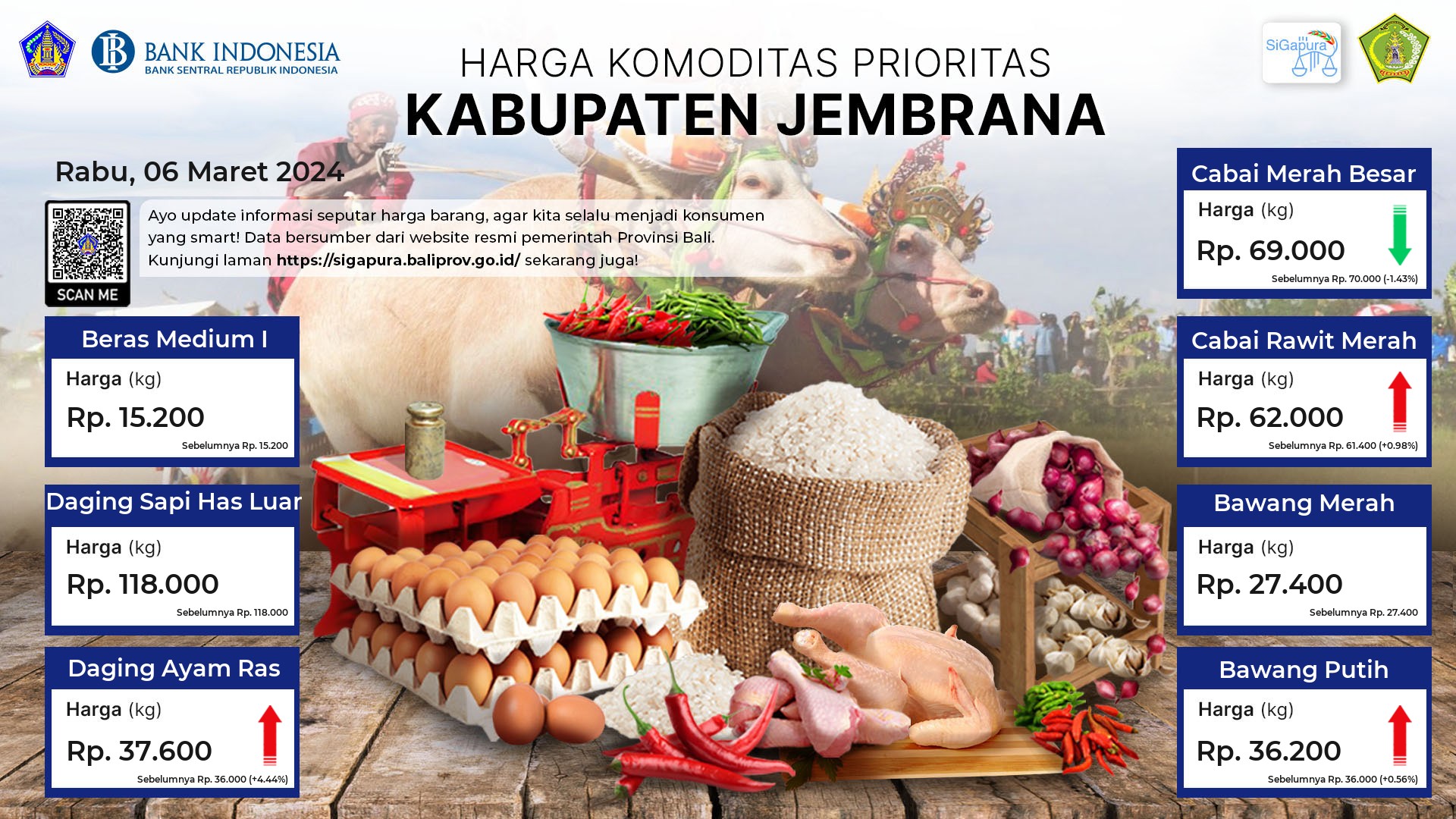 Berdasarkan pemantauan Harga Pangan Rata-Rata 7 (tujuh) Komoditas Prioritas di 60 Pasar seluruh Bali pada tanggal 06 Maret 2024, diperoleh informasi Beras Medium I tetap ada diharga Rp. 15.421. Daging Sapi Has Luar ada diharga Rp. 117.645, mengalami penurunan sebesar 0.02%. Daging Ayam Ras ada diharga Rp. 39.729, mengalami kenaikan sebesar 1.61%. Cabai Merah Besar ada diharga Rp. 68.591, mengalami penurunan sebesar 8.21%. Cabai Rawit Merah ada diharga Rp. 60.506, mengalami penurunan sebesar 0.17%. Bawang Merah ada diharga Rp. 28.232, mengalami kenaikan sebesar 0.12%. Bawang Putih ada diharga Rp. 36.242, mengalami penurunan sebesar 0.78%.
