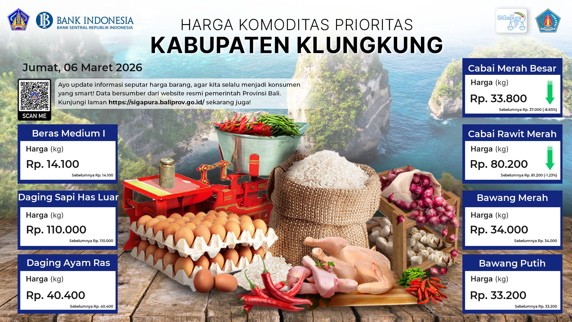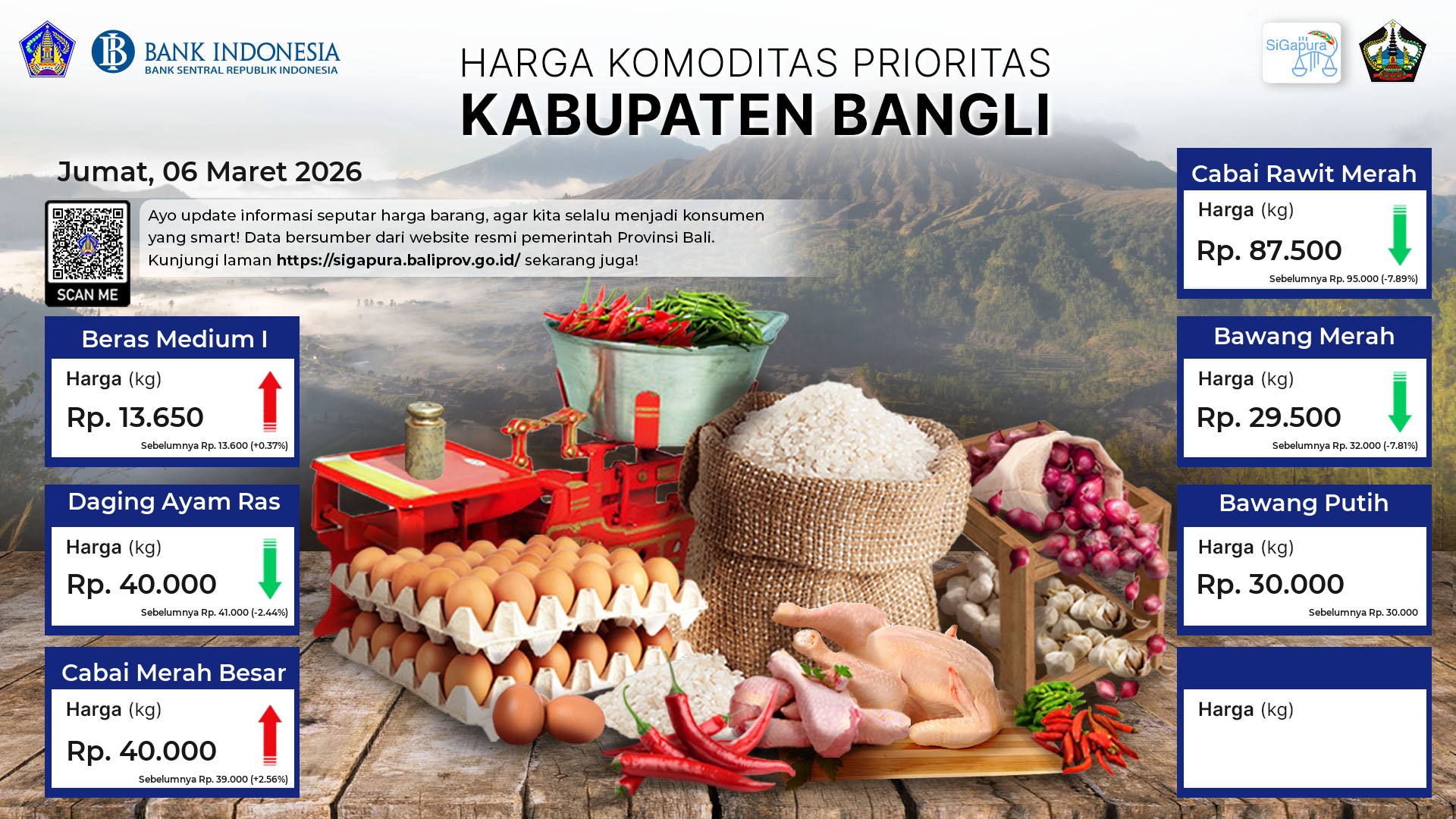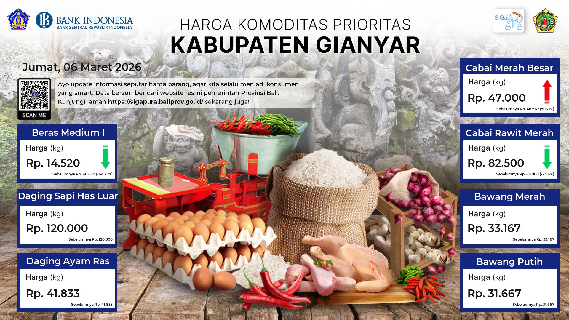 Berdasarkan pemantauan Harga Pangan Rata-Rata 7 (tujuh) Komoditas Prioritas di 60 Pasar seluruh Bali pada tanggal 06 Maret 2026, diperoleh informasi Beras Medium I ada diharga Rp. 14.371, mengalami penurunan sebesar 13.91%. Daging Sapi Has Luar tetap ada diharga Rp. 123.698. Daging Ayam Ras ada diharga Rp. 42.822, mengalami penurunan sebesar 0.17%. Cabai Merah Besar ada diharga Rp. 38.982, mengalami penurunan sebesar 1.18%. Cabai Rawit Merah ada diharga Rp. 92.199, mengalami penurunan sebesar 0.13%. Bawang Merah ada diharga Rp. 35.631, mengalami penurunan sebesar 2.01%. Bawang Putih ada diharga Rp. 33.740, mengalami kenaikan sebesar 0.09%.
