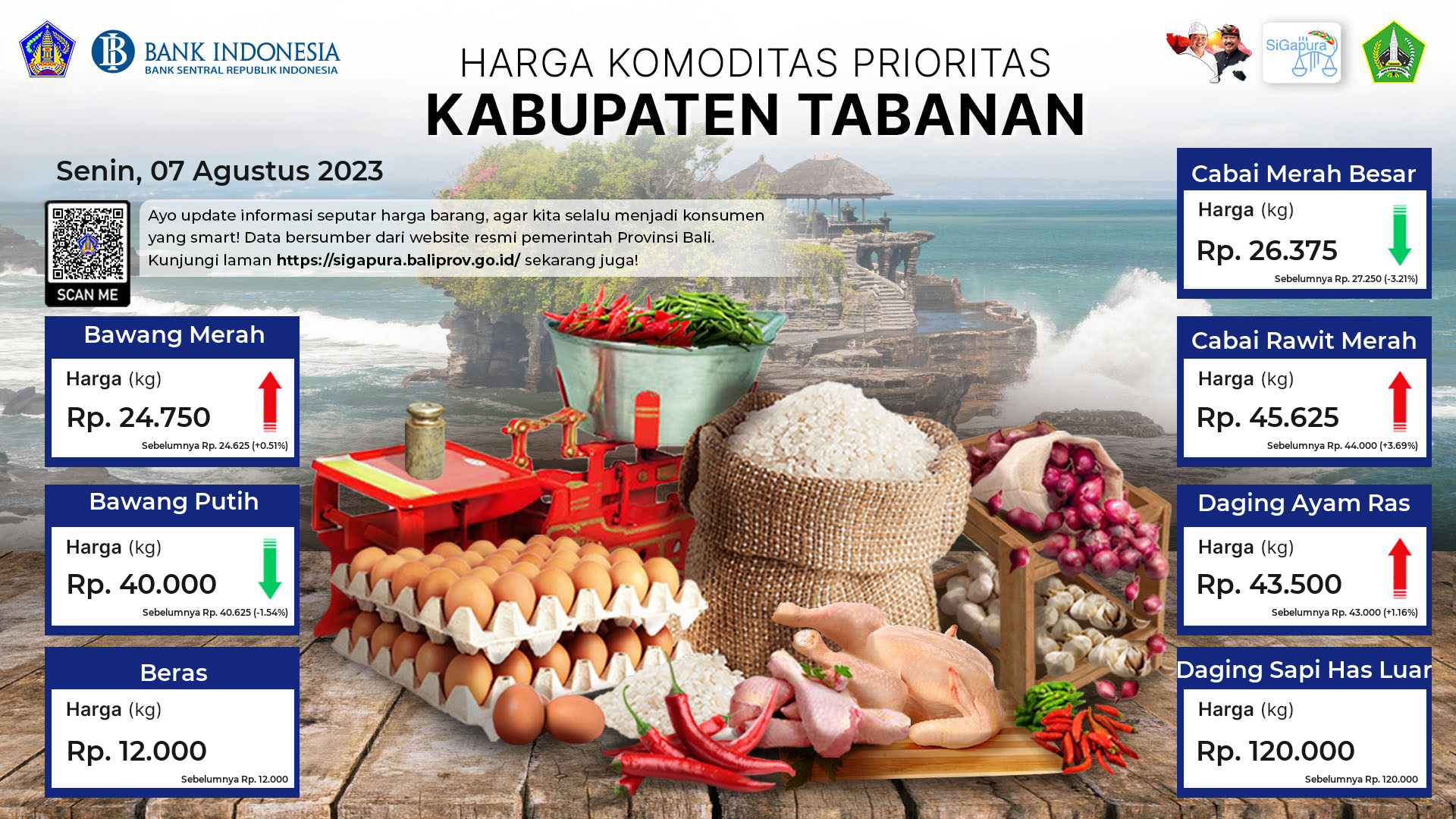 Berdasarkan pemantauan Harga Pangan Rata-Rata 7 (tujuh) Komoditas Prioritas di 60 Pasar seluruh Bali pada tanggal 07 Agustus 2023, diperoleh informasi Bawang Merah ada diharga Rp. 25.396, mengalami penurunan sebesar 1.05%. Bawang Putih ada diharga Rp. 38.813, mengalami penurunan sebesar 3.26%. Beras ada diharga Rp. 12.144, mengalami kenaikan sebesar 0.16%. Cabai Merah Besar ada diharga Rp. 27.788, mengalami kenaikan sebesar 0.82%. Cabai Rawit Merah ada diharga Rp. 38.956, mengalami penurunan sebesar 1.06%. Daging Ayam Ras ada diharga Rp. 41.481, mengalami penurunan sebesar 2.28%. Daging Sapi Has Luar ada diharga Rp. 121.087, mengalami penurunan sebesar 0.28%.