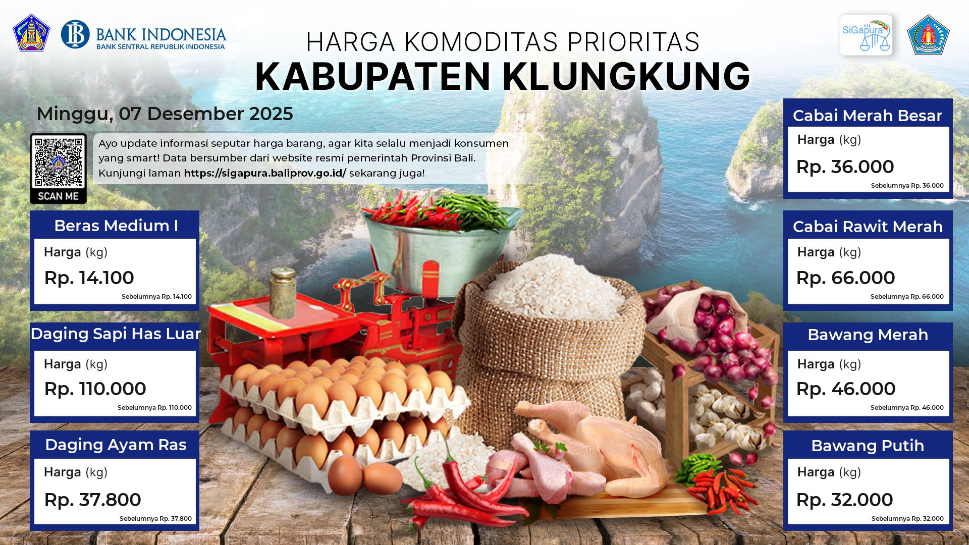 Berdasarkan pemantauan Harga Pangan Rata-Rata 7 (tujuh) Komoditas Prioritas di 60 Pasar seluruh Bali pada tanggal 07 Desember 2025, diperoleh informasi Beras Medium I tetap ada diharga Rp. 14.474. Daging Sapi Has Luar tetap ada diharga Rp. 118.596. Daging Ayam Ras tetap ada diharga Rp. 40.989. Cabai Merah Besar tetap ada diharga Rp. 42.344. Cabai Rawit Merah tetap ada diharga Rp. 65.342. Bawang Merah ada diharga Rp. 46.260, mengalami kenaikan sebesar 0.39%. Bawang Putih tetap ada diharga Rp. 34.087.
