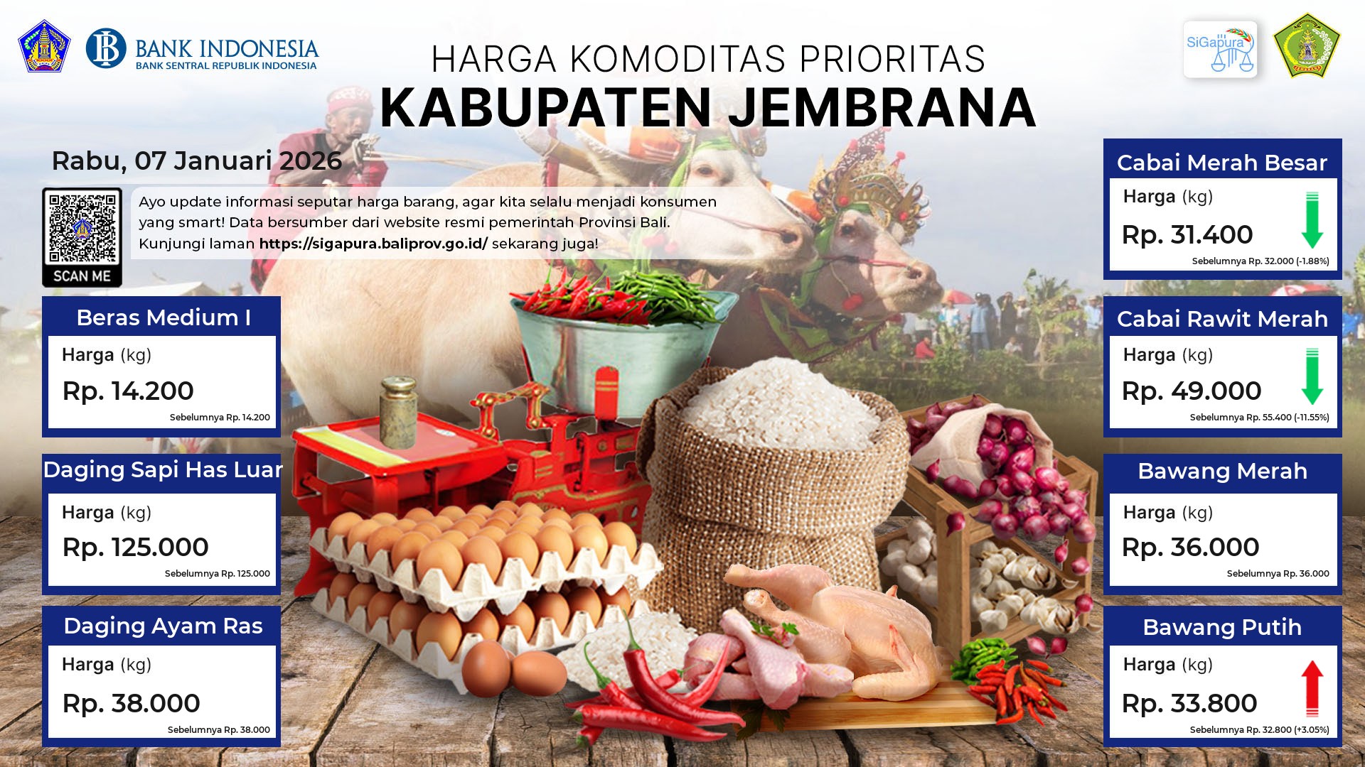 Berdasarkan pemantauan Harga Pangan Rata-Rata 7 (tujuh) Komoditas Prioritas di 60 Pasar seluruh Bali pada tanggal 07 Januari 2026, diperoleh informasi Beras Medium I ada diharga Rp. 14.493, mengalami penurunan sebesar 14.74%. Daging Sapi Has Luar ada diharga Rp. 111.638, mengalami penurunan sebesar 7.46%. Daging Ayam Ras ada diharga Rp. 41.369, mengalami kenaikan sebesar 0.24%. Cabai Merah Besar ada diharga Rp. 27.227, mengalami penurunan sebesar 0.34%. Cabai Rawit Merah ada diharga Rp. 47.425, mengalami penurunan sebesar 2.77%. Bawang Merah ada diharga Rp. 38.184, mengalami penurunan sebesar 0.84%. Bawang Putih ada diharga Rp. 34.286, mengalami kenaikan sebesar 2.44%.