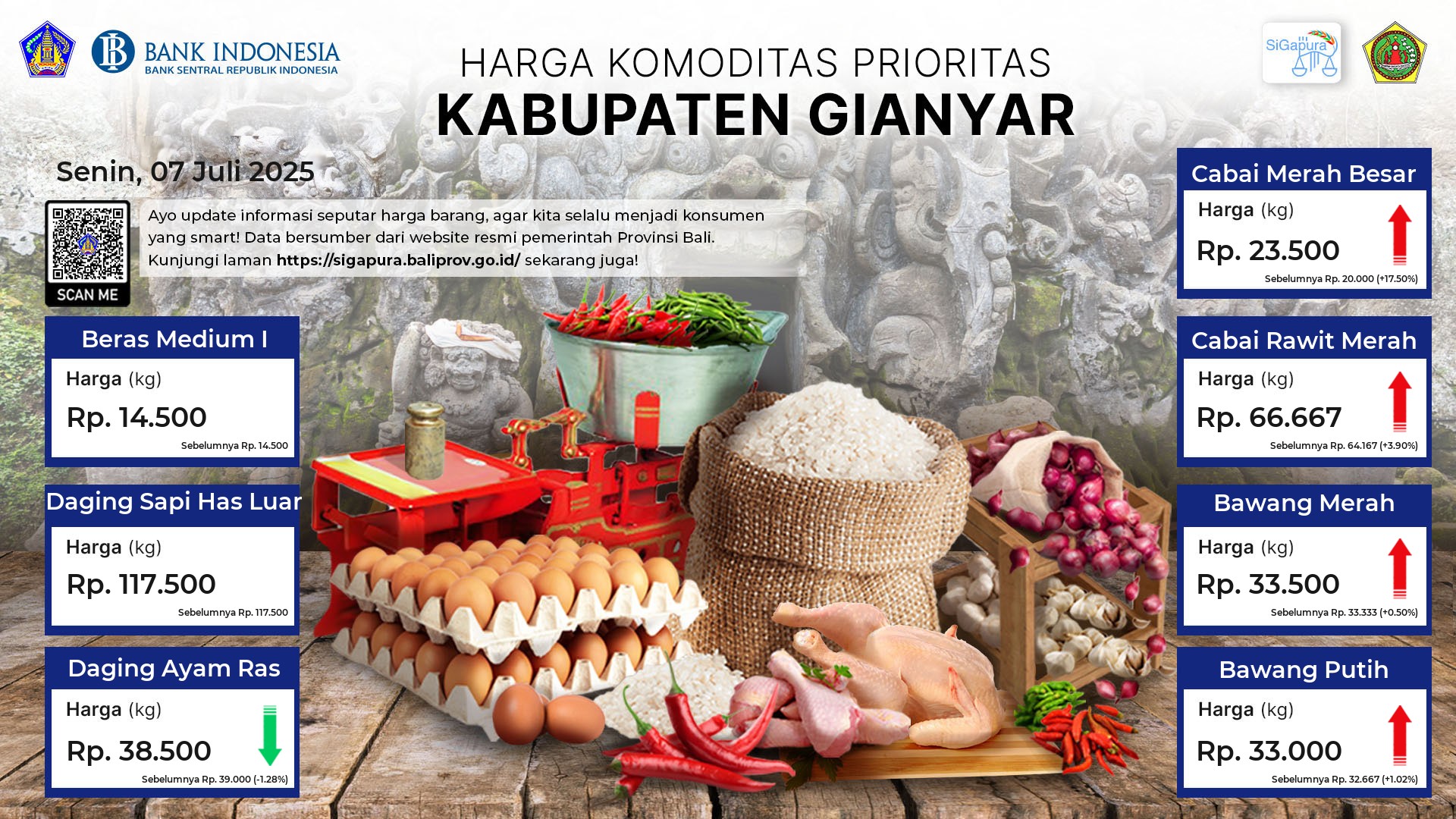 Berdasarkan pemantauan Harga Pangan Rata-Rata 7 (tujuh) Komoditas Prioritas di 60 Pasar seluruh Bali pada tanggal 07 Juli 2025, diperoleh informasi Beras Medium I ada diharga Rp. 14.309, mengalami kenaikan sebesar 1.50%. Daging Sapi Has Luar ada diharga Rp. 123.188, mengalami kenaikan sebesar 2.67%. Daging Ayam Ras ada diharga Rp. 39.598, mengalami penurunan sebesar 0.05%. Cabai Merah Besar ada diharga Rp. 26.468, mengalami kenaikan sebesar 4.66%. Cabai Rawit Merah ada diharga Rp. 63.128, mengalami kenaikan sebesar 2.06%. Bawang Merah ada diharga Rp. 35.421, mengalami penurunan sebesar 0.55%. Bawang Putih ada diharga Rp. 34.281, mengalami penurunan sebesar 0.57%.