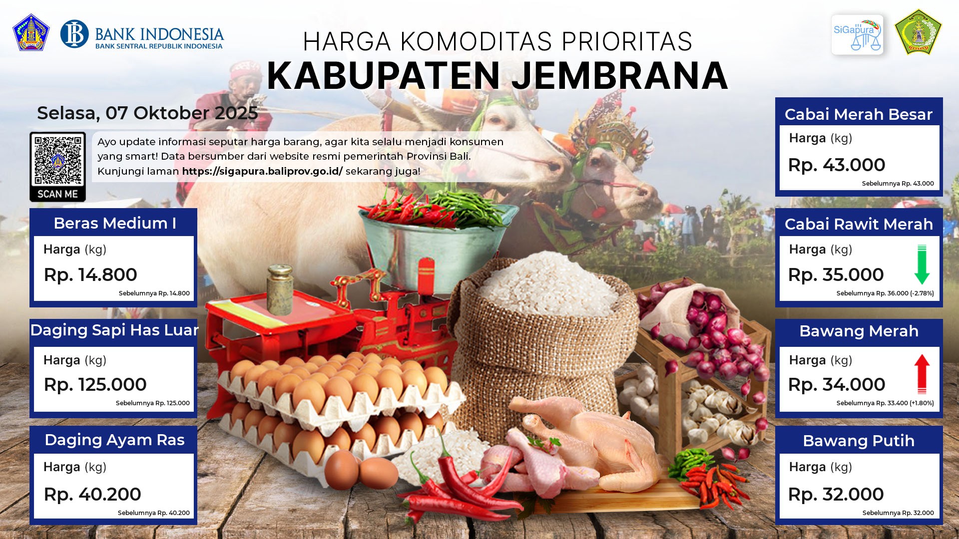 Berdasarkan pemantauan Harga Pangan Rata-Rata 7 (tujuh) Komoditas Prioritas di 60 Pasar seluruh Bali pada tanggal 07 Oktober 2025, diperoleh informasi Beras Medium I ada diharga Rp. 14.777, mengalami kenaikan sebesar 0.16%. Daging Sapi Has Luar ada diharga Rp. 111.172, mengalami penurunan sebesar 7.98%. Daging Ayam Ras ada diharga Rp. 42.813, mengalami kenaikan sebesar 0.07%. Cabai Merah Besar ada diharga Rp. 42.874, mengalami kenaikan sebesar 0.79%. Cabai Rawit Merah ada diharga Rp. 33.933, mengalami kenaikan sebesar 0.88%. Bawang Merah ada diharga Rp. 31.891, mengalami penurunan sebesar 0.23%. Bawang Putih ada diharga Rp. 31.971, mengalami kenaikan sebesar 0.38%.