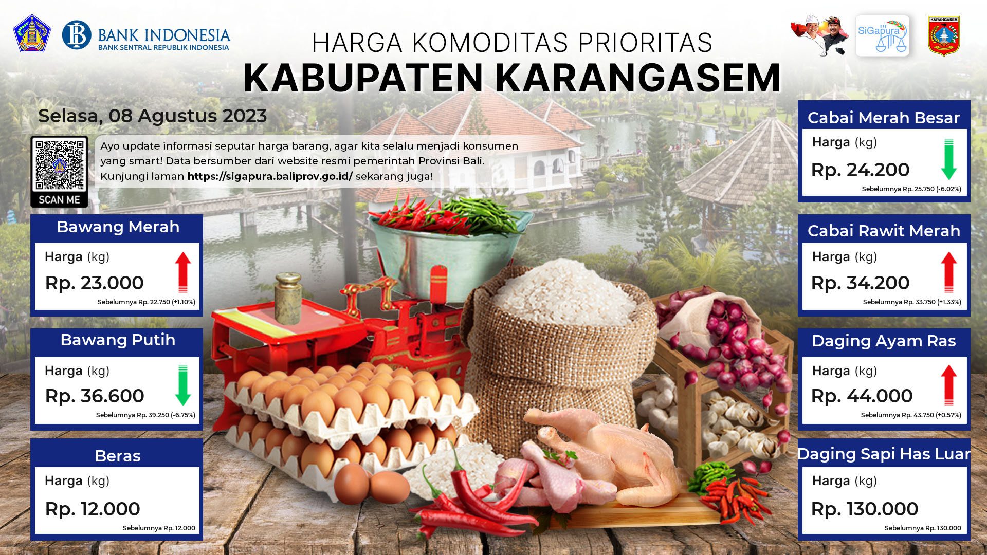 Berdasarkan pemantauan Harga Pangan Rata-Rata 7 (tujuh) Komoditas Prioritas di 60 Pasar seluruh Bali pada tanggal 08 Agustus 2023, diperoleh informasi Bawang Merah ada diharga Rp. 25.323, mengalami penurunan sebesar 0.29%. Bawang Putih ada diharga Rp. 38.442, mengalami penurunan sebesar 0.96%. Beras ada diharga Rp. 12.142, mengalami penurunan sebesar 0.02%. Cabai Merah Besar ada diharga Rp. 27.296, mengalami penurunan sebesar 1.77%. Cabai Rawit Merah ada diharga Rp. 39.466, mengalami kenaikan sebesar 1.31%. Daging Ayam Ras ada diharga Rp. 41.189, mengalami penurunan sebesar 0.70%. Daging Sapi Has Luar ada diharga Rp. 120.626, mengalami penurunan sebesar 0.38%.