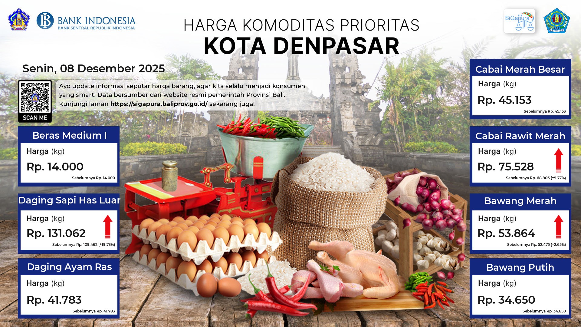 Berdasarkan pemantauan Harga Pangan Rata-Rata 7 (tujuh) Komoditas Prioritas di 60 Pasar seluruh Bali pada tanggal 08 Desember 2025, diperoleh informasi Beras Medium I ada diharga Rp. 14.484, mengalami kenaikan sebesar 0.07%. Daging Sapi Has Luar tetap ada diharga Rp. 118.596. Daging Ayam Ras ada diharga Rp. 40.954, mengalami penurunan sebesar 0.09%. Cabai Merah Besar ada diharga Rp. 42.695, mengalami kenaikan sebesar 0.83%. Cabai Rawit Merah ada diharga Rp. 76.301, mengalami kenaikan sebesar 16.77%. Bawang Merah ada diharga Rp. 50.547, mengalami kenaikan sebesar 9.27%. Bawang Putih ada diharga Rp. 32.660, mengalami penurunan sebesar 4.19%.