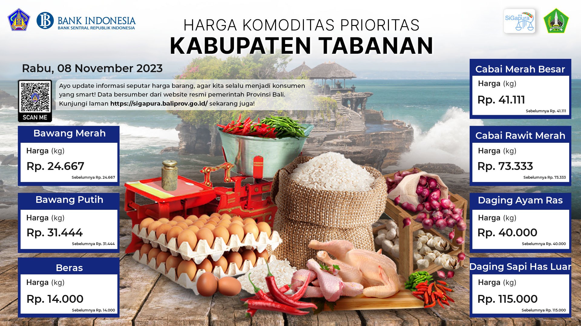 Berdasarkan pemantauan Harga Pangan Rata-Rata 7 (tujuh) Komoditas Prioritas di 60 Pasar seluruh Bali pada tanggal 08 November 2023, diperoleh informasi Bawang Merah ada diharga Rp. 24.991, mengalami penurunan sebesar 0.71%. Bawang Putih ada diharga Rp. 32.388, mengalami penurunan sebesar 0.06%. Beras tetap ada diharga Rp. 13.902. Cabai Merah Besar ada diharga Rp. 47.882, mengalami kenaikan sebesar 6.66%. Cabai Rawit Merah ada diharga Rp. 69.614, mengalami kenaikan sebesar 4.90%. Daging Ayam Ras ada diharga Rp. 39.043, mengalami penurunan sebesar 0.05%. Daging Sapi Has Luar tetap ada diharga Rp. 119.797.