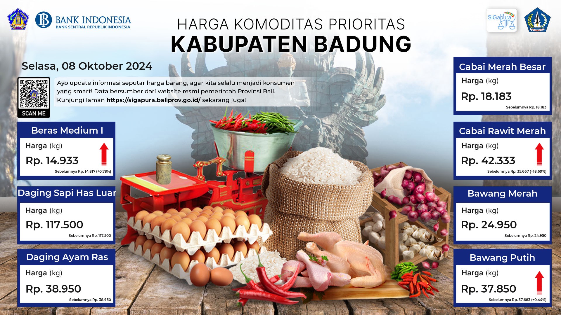 Berdasarkan pemantauan Harga Pangan Rata-Rata 7 (tujuh) Komoditas Prioritas di 60 Pasar seluruh Bali pada tanggal 08 Oktober 2024, diperoleh informasi Beras Medium I ada diharga Rp. 14.374, mengalami penurunan sebesar 0.06%. Daging Sapi Has Luar ada diharga Rp. 112.068, mengalami penurunan sebesar 0.36%. Daging Ayam Ras ada diharga Rp. 39.188, mengalami kenaikan sebesar 0.41%. Cabai Merah Besar ada diharga Rp. 18.032, mengalami penurunan sebesar 4.68%. Cabai Rawit Merah ada diharga Rp. 40.724, mengalami kenaikan sebesar 2.81%. Bawang Merah ada diharga Rp. 23.566, mengalami penurunan sebesar 0.50%. Bawang Putih ada diharga Rp. 36.267, mengalami penurunan sebesar 0.17%.