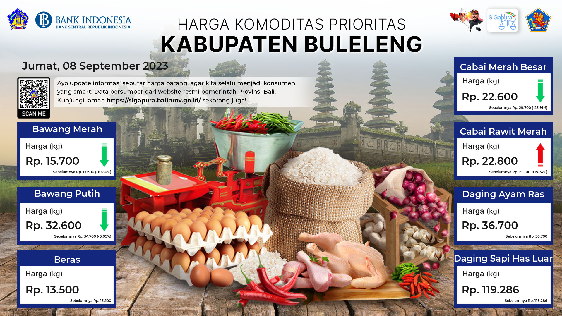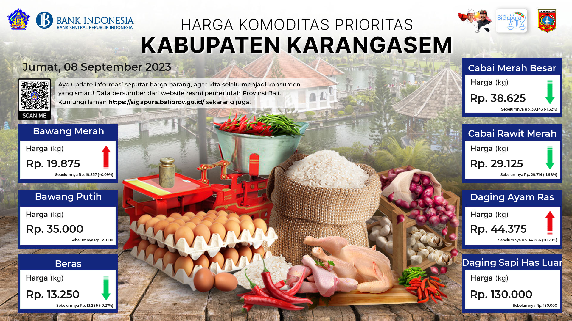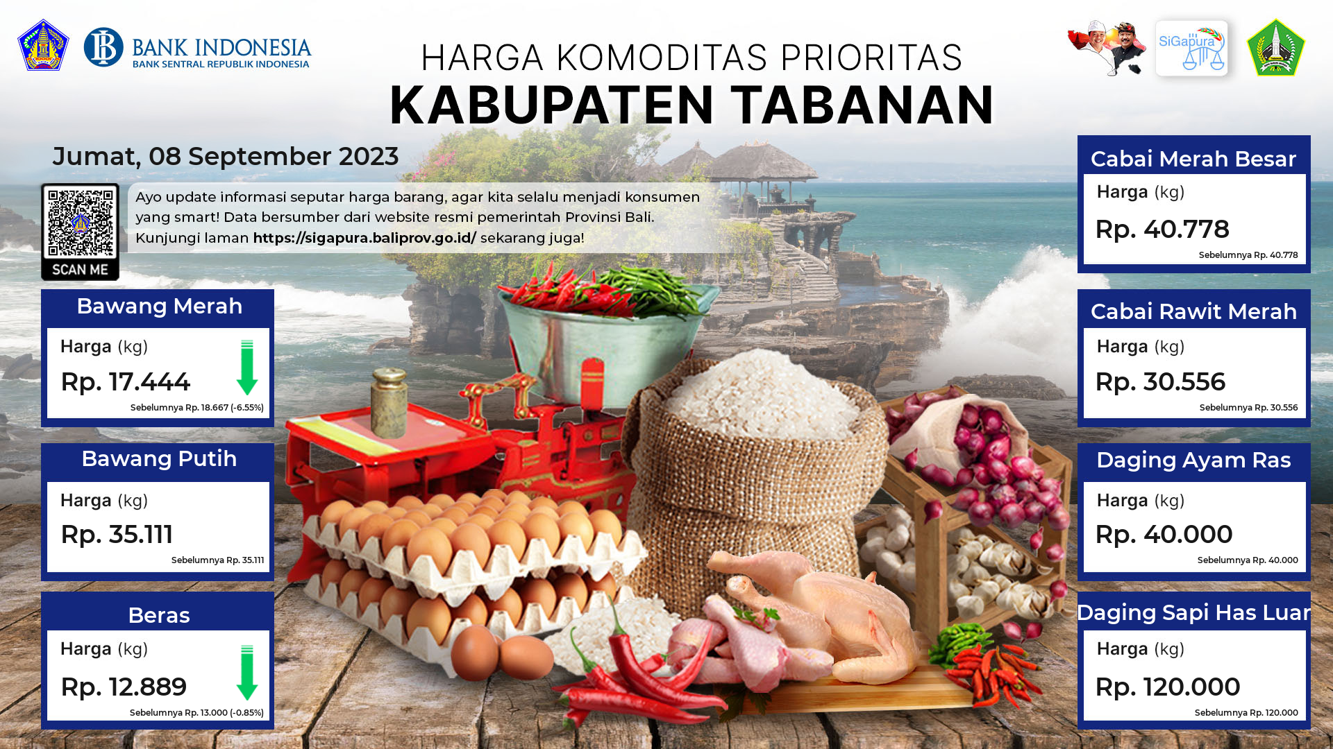 Berdasarkan pemantauan Harga Pangan Rata-Rata 7 (tujuh) Komoditas Prioritas di 60 Pasar seluruh Bali pada tanggal 08 September 2023, diperoleh informasi Bawang Merah ada diharga Rp. 19.156, mengalami penurunan sebesar 2.29%. Bawang Putih ada diharga Rp. 35.141, mengalami penurunan sebesar 1.06%. Beras ada diharga Rp. 13.258, mengalami penurunan sebesar 0.03%. Cabai Merah Besar ada diharga Rp. 34.734, mengalami penurunan sebesar 6.12%. Cabai Rawit Merah ada diharga Rp. 28.381, mengalami kenaikan sebesar 2.46%. Daging Ayam Ras ada diharga Rp. 40.249, mengalami kenaikan sebesar 0.66%. Daging Sapi Has Luar tetap ada diharga Rp. 122.364.