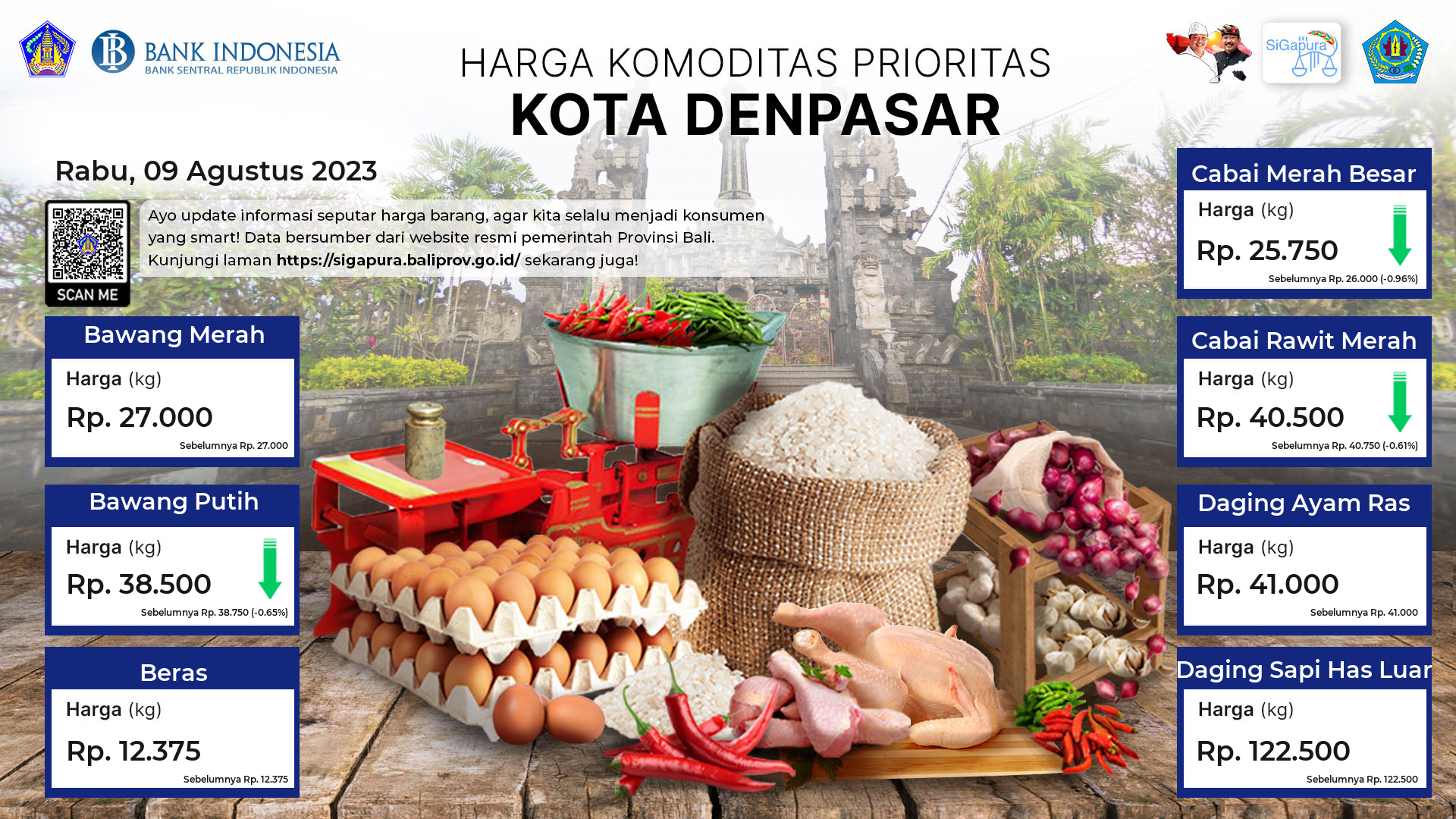 Berdasarkan pemantauan Harga Pangan Rata-Rata 7 (tujuh) Komoditas Prioritas di 60 Pasar seluruh Bali pada tanggal 09 Agustus 2023, diperoleh informasi Bawang Merah ada diharga Rp. 24.158, mengalami penurunan sebesar 4.60%. Bawang Putih ada diharga Rp. 38.272, mengalami penurunan sebesar 0.44%. Beras tetap ada diharga Rp. 12.142. Cabai Merah Besar ada diharga Rp. 25.447, mengalami penurunan sebesar 6.77%. Cabai Rawit Merah ada diharga Rp. 40.008, mengalami kenaikan sebesar 1.37%. Daging Ayam Ras ada diharga Rp. 41.113, mengalami penurunan sebesar 0.18%. Daging Sapi Has Luar tetap ada diharga Rp. 120.626.