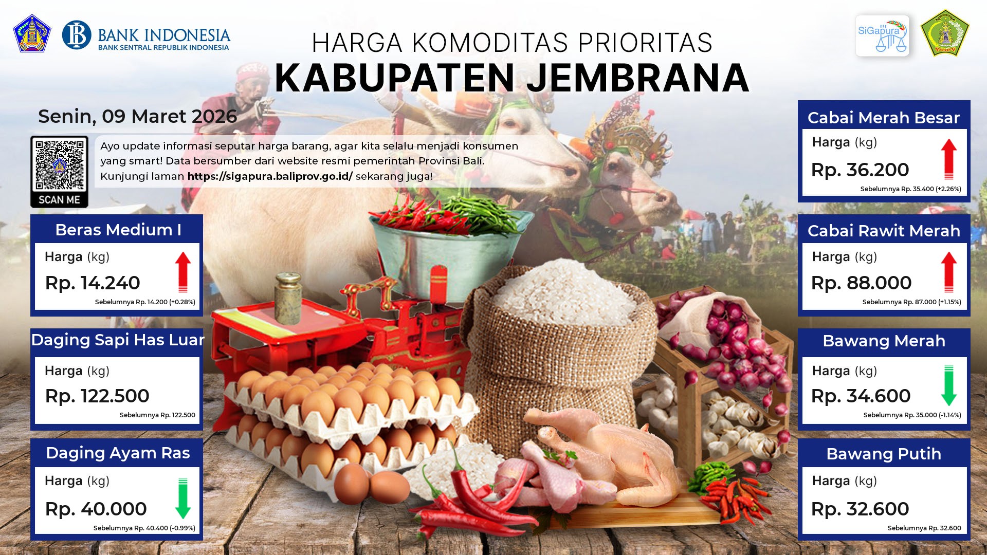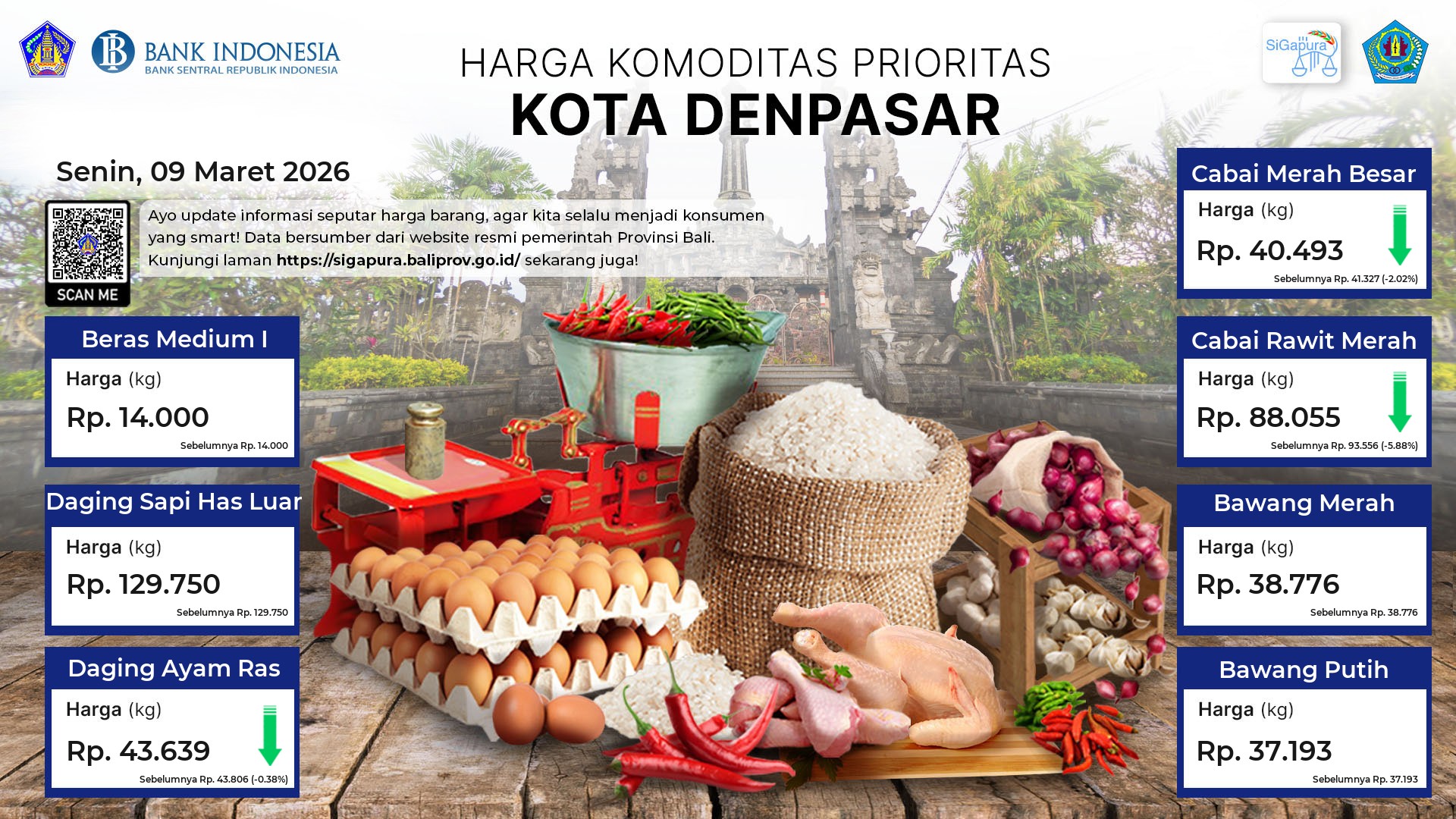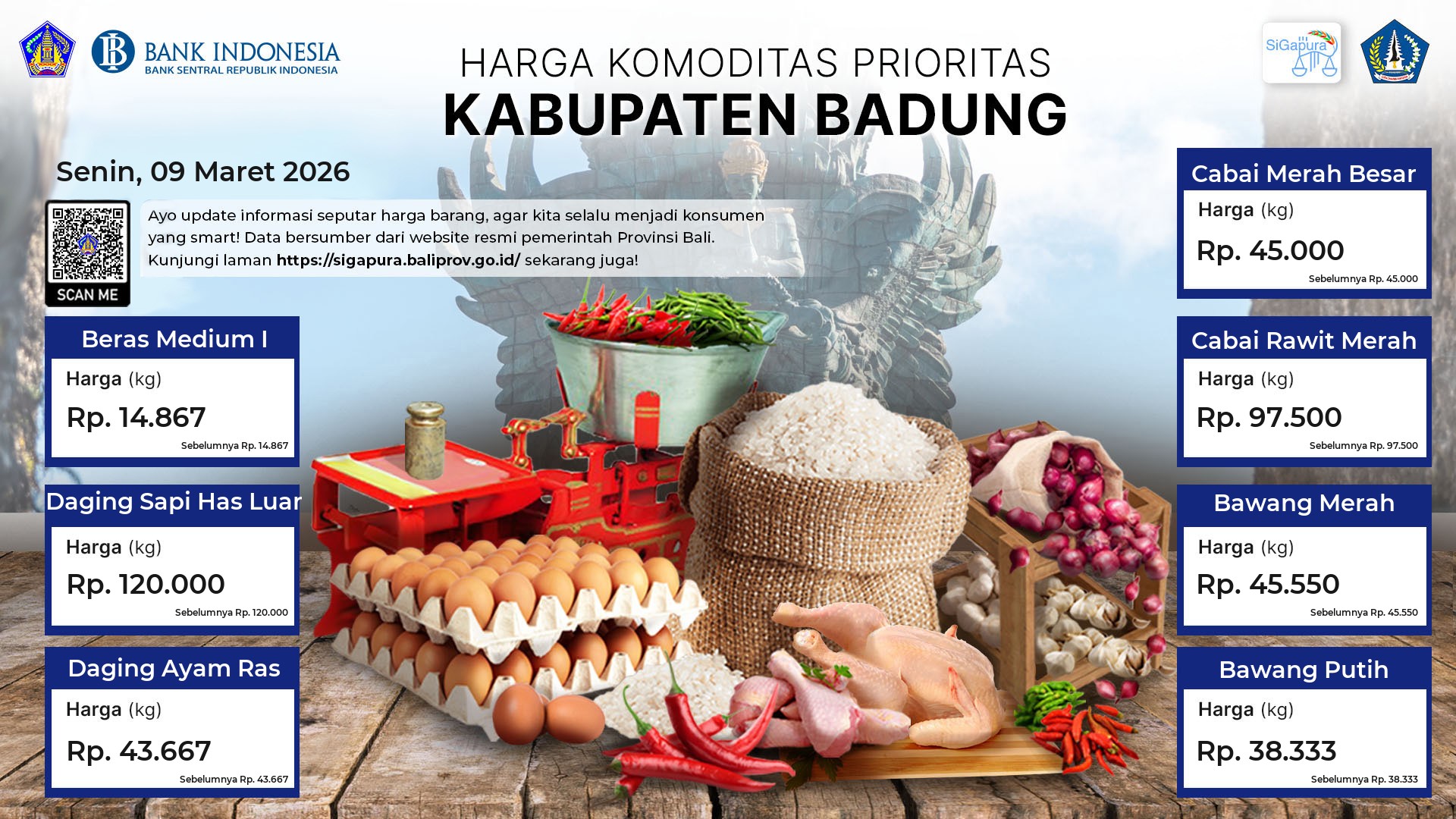 Berdasarkan pemantauan Harga Pangan Rata-Rata 7 (tujuh) Komoditas Prioritas di 60 Pasar seluruh Bali pada tanggal 09 Maret 2026, diperoleh informasi Beras Medium I ada diharga Rp. 14.381, mengalami kenaikan sebesar 0.07%. Daging Sapi Has Luar ada diharga Rp. 119.198, mengalami penurunan sebesar 3.64%. Daging Ayam Ras ada diharga Rp. 43.104, mengalami kenaikan sebesar 0.66%. Cabai Merah Besar ada diharga Rp. 37.908, mengalami penurunan sebesar 2.76%. Cabai Rawit Merah ada diharga Rp. 109.615, mengalami kenaikan sebesar 18.89%. Bawang Merah ada diharga Rp. 36.321, mengalami kenaikan sebesar 1.94%. Bawang Putih ada diharga Rp. 33.485, mengalami penurunan sebesar 0.76%.