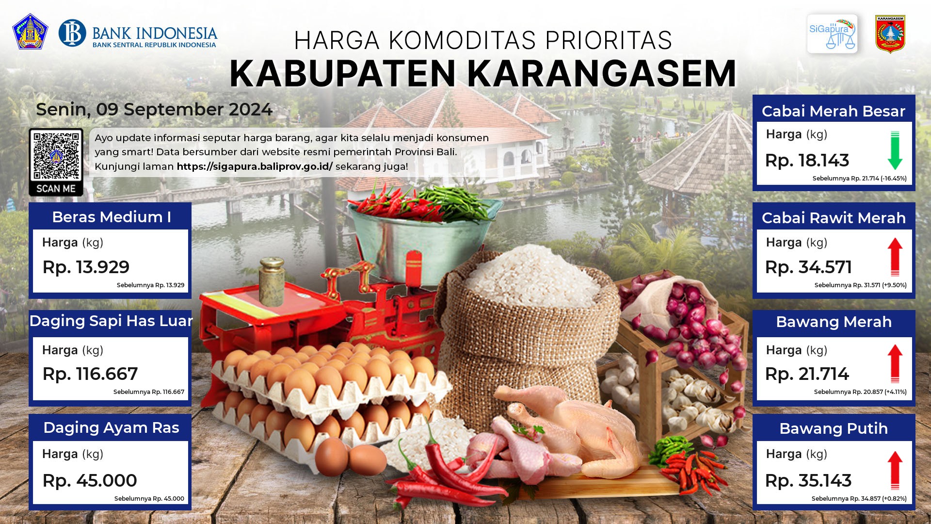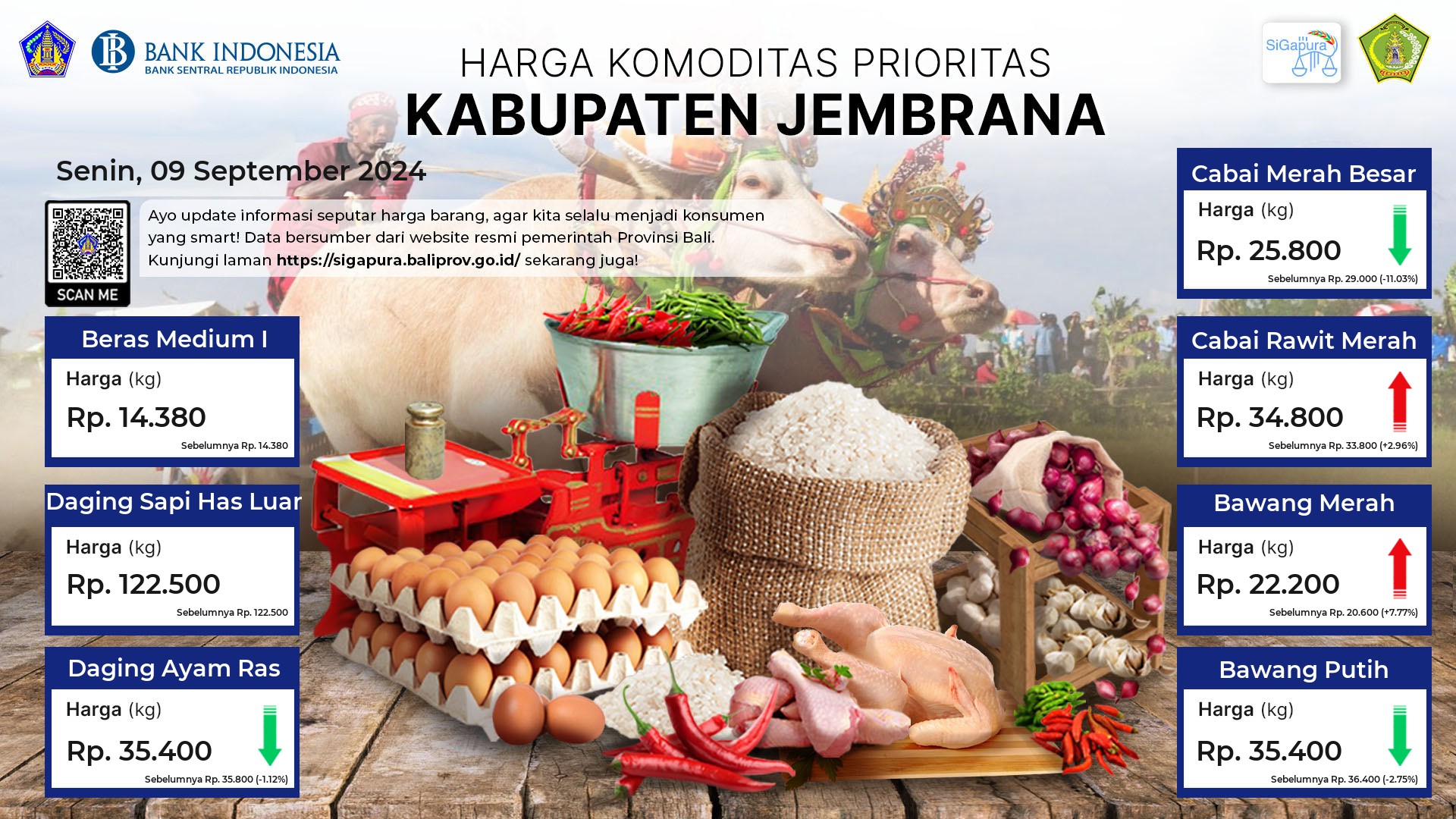 Berdasarkan pemantauan Harga Pangan Rata-Rata 7 (tujuh) Komoditas Prioritas di 60 Pasar seluruh Bali pada tanggal 09 September 2024, diperoleh informasi Beras Medium I ada diharga Rp. 14.417, mengalami penurunan sebesar 0.15%. Daging Sapi Has Luar tetap ada diharga Rp. 113.760. Daging Ayam Ras ada diharga Rp. 39.359, mengalami penurunan sebesar 0.15%. Cabai Merah Besar ada diharga Rp. 20.829, mengalami penurunan sebesar 8.07%. Cabai Rawit Merah ada diharga Rp. 35.927, mengalami kenaikan sebesar 7.09%. Bawang Merah ada diharga Rp. 22.976, mengalami kenaikan sebesar 2.40%. Bawang Putih ada diharga Rp. 36.399, mengalami kenaikan sebesar 0.12%.