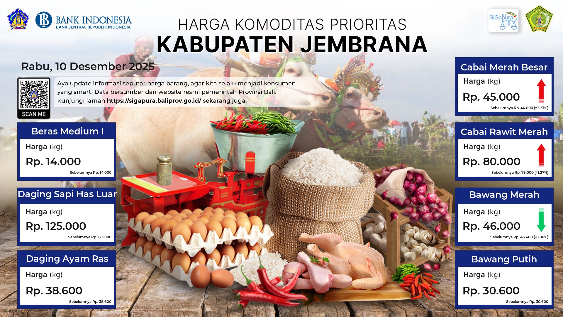 Berdasarkan pemantauan Harga Pangan Rata-Rata 7 (tujuh) Komoditas Prioritas di 60 Pasar seluruh Bali pada tanggal 10 Desember 2025, diperoleh informasi Beras Medium I ada diharga Rp. 14.498, mengalami penurunan sebesar 0.06%. Daging Sapi Has Luar tetap ada diharga Rp. 123.096. Daging Ayam Ras ada diharga Rp. 41.116, mengalami kenaikan sebesar 0.27%. Cabai Merah Besar ada diharga Rp. 41.987, mengalami penurunan sebesar 0.13%. Cabai Rawit Merah ada diharga Rp. 79.567, mengalami kenaikan sebesar 1.91%. Bawang Merah ada diharga Rp. 50.334, mengalami penurunan sebesar 0.59%. Bawang Putih ada diharga Rp. 32.702, mengalami kenaikan sebesar 0.09%.