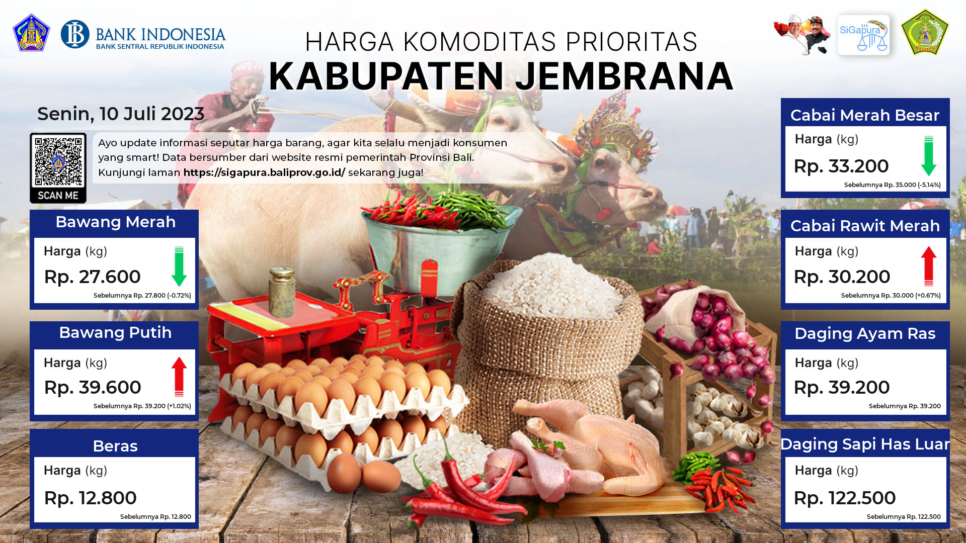 Berdasarkan pemantauan Harga Pangan Rata-Rata 7 (tujuh) Komoditas Prioritas di 60 Pasar seluruh Bali pada tanggal 10 Juli 2023, diperoleh informasi Bawang Merah ada diharga Rp. 27.851, mengalami penurunan sebesar 2.61%. Bawang Putih ada diharga Rp. 45.055, mengalami penurunan sebesar 0.06%. Beras ada diharga Rp. 12.119, mengalami kenaikan sebesar 0.16%. Cabai Merah Besar ada diharga Rp. 29.962, mengalami penurunan sebesar 9.53%. Cabai Rawit Merah ada diharga Rp. 29.340, mengalami kenaikan sebesar 2.01%. Daging Ayam Ras ada diharga Rp. 41.340, mengalami kenaikan sebesar 1.45%. Daging Sapi Has Luar ada diharga Rp. 120.409, mengalami penurunan sebesar 0.18%.