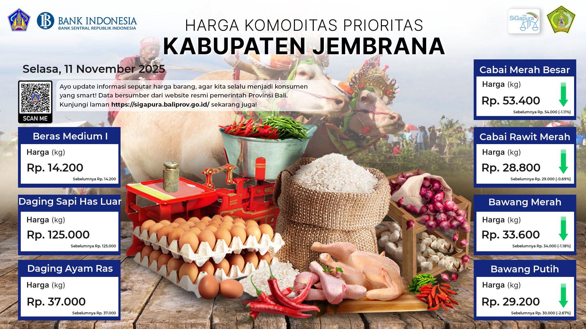 Berdasarkan pemantauan Harga Pangan Rata-Rata 7 (tujuh) Komoditas Prioritas di 60 Pasar seluruh Bali pada tanggal 11 November 2025, diperoleh informasi Beras Medium I ada diharga Rp. 14.559, mengalami penurunan sebesar 0.08%. Daging Sapi Has Luar tetap ada diharga Rp. 121.680. Daging Ayam Ras ada diharga Rp. 40.902, mengalami kenaikan sebesar 0.05%. Cabai Merah Besar ada diharga Rp. 50.841, mengalami kenaikan sebesar 2.57%. Cabai Rawit Merah ada diharga Rp. 28.599, mengalami penurunan sebesar 1.49%. Bawang Merah ada diharga Rp. 36.039, mengalami kenaikan sebesar 0.03%. Bawang Putih ada diharga Rp. 32.171, mengalami penurunan sebesar 0.56%.