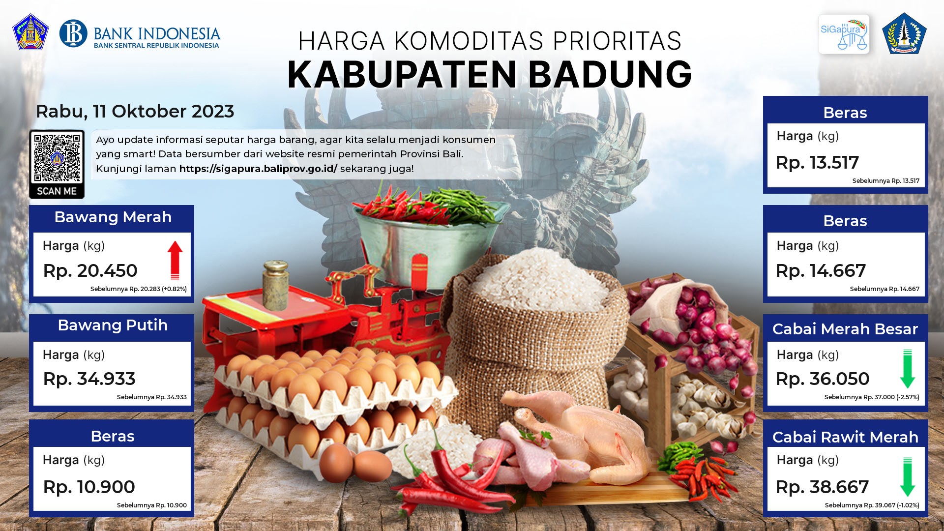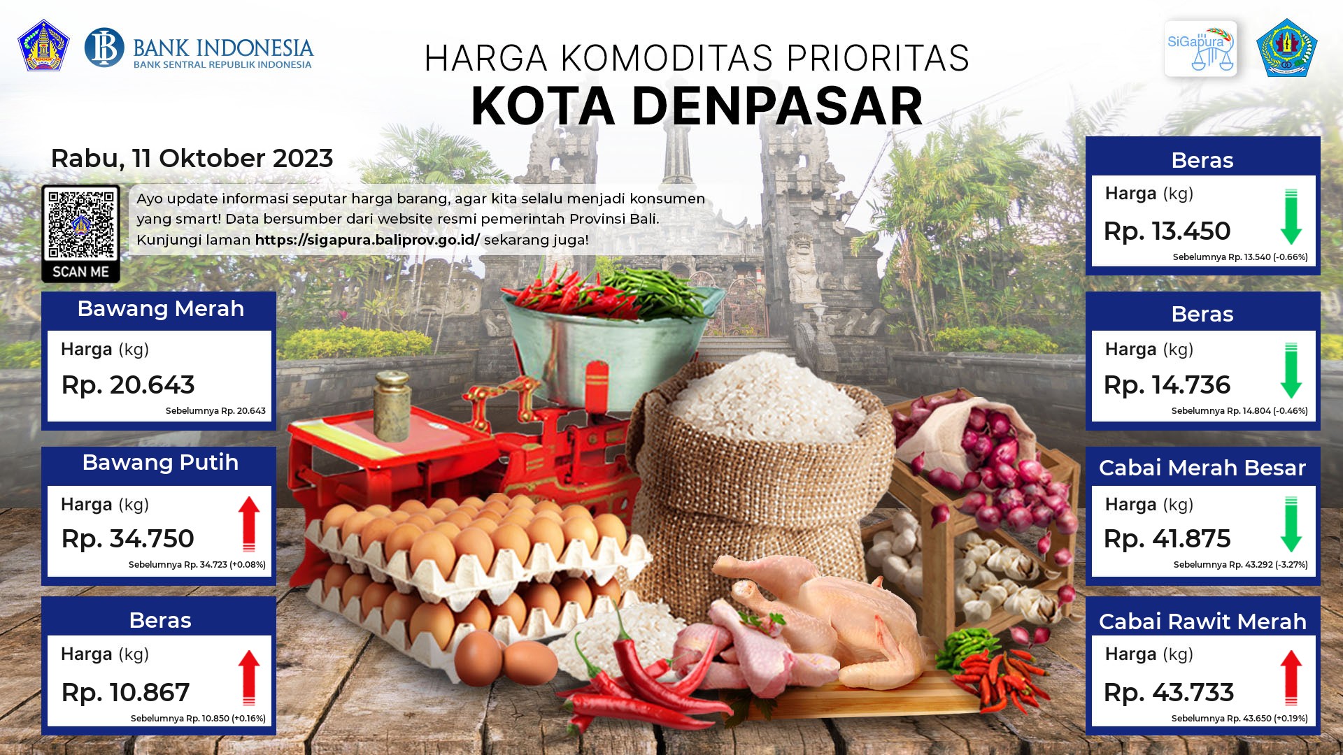 Berdasarkan pemantauan Harga Pangan Rata-Rata 7 (tujuh) Komoditas Prioritas di 60 Pasar seluruh Bali pada tanggal 11 Oktober 2023, diperoleh informasi Bawang Merah ada diharga Rp. 17.010, mengalami penurunan sebesar 1.95%. Bawang Putih ada diharga Rp. 33.616, mengalami kenaikan sebesar 0.78%. Beras ada diharga Rp. 10.932, mengalami kenaikan sebesar 0.05%. Beras ada diharga Rp. 13.768, mengalami kenaikan sebesar 0.06%. Beras ada diharga Rp. 14.947, mengalami kenaikan sebesar 0.15%. Cabai Merah Besar ada diharga Rp. 34.027, mengalami penurunan sebesar 1.20%. Cabai Rawit Merah ada diharga Rp. 39.586, mengalami penurunan sebesar 0.74%. Daging Ayam Ras ada diharga Rp. 39.458, mengalami kenaikan sebesar 0.92%. Daging Sapi Has Luar ada diharga Rp. 121.947, mengalami kenaikan sebesar 1.03%.
