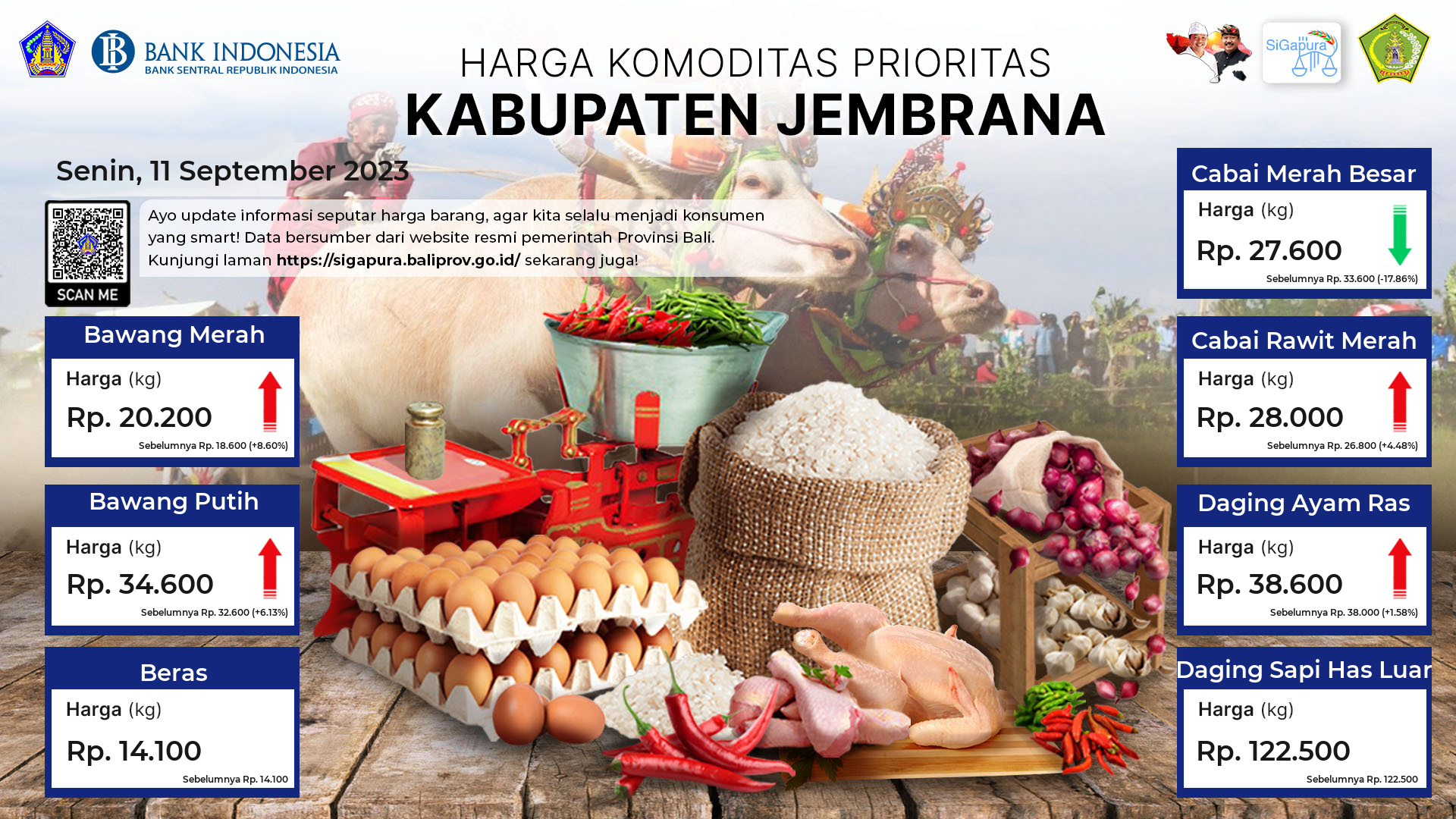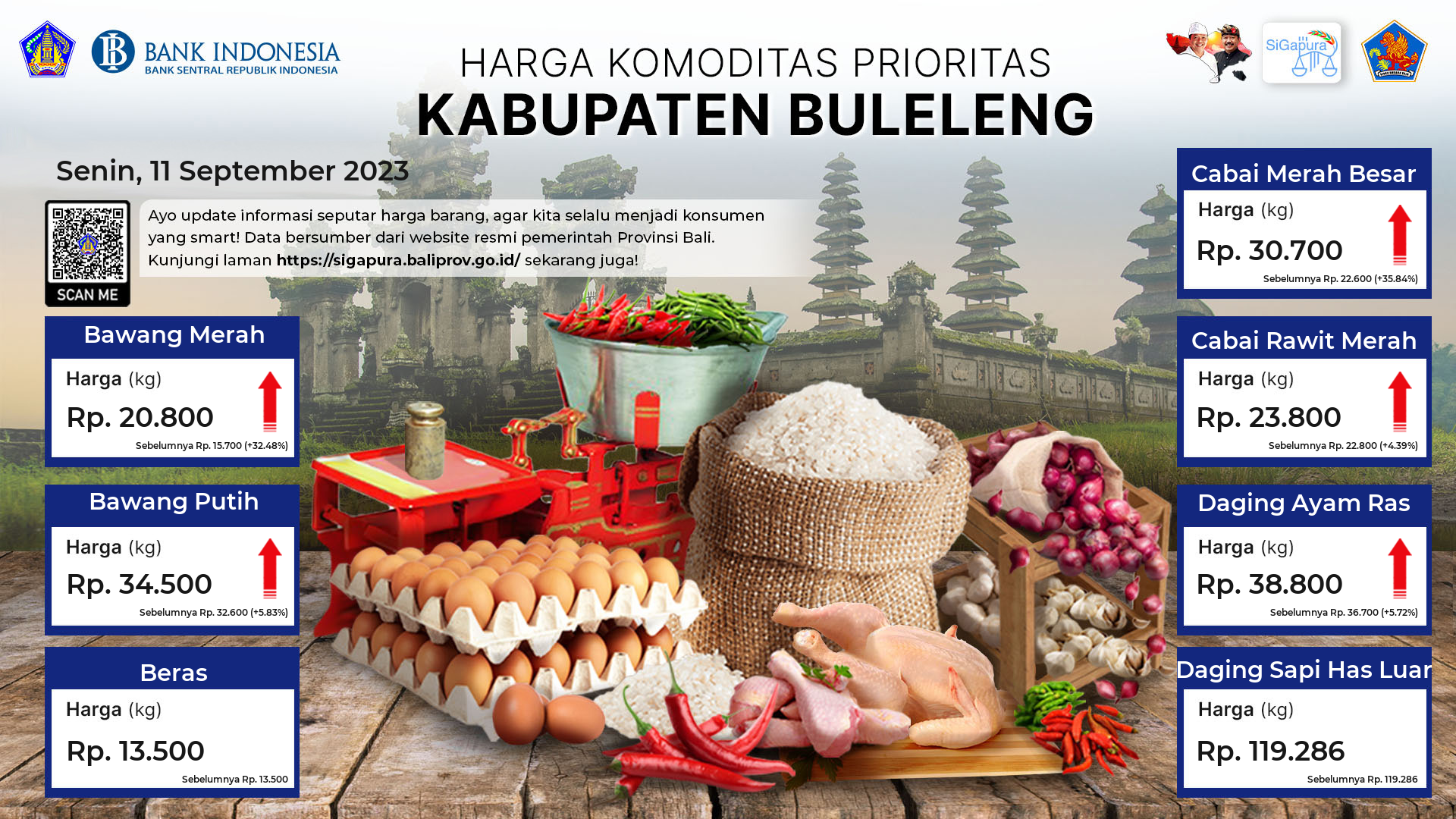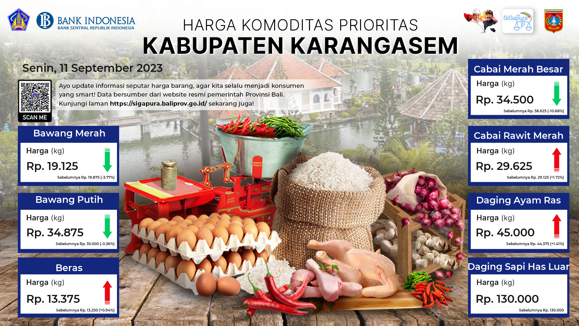 Berdasarkan pemantauan Harga Pangan Rata-Rata 7 (tujuh) Komoditas Prioritas di 60 Pasar seluruh Bali pada tanggal 11 September 2023, diperoleh informasi Bawang Merah ada diharga Rp. 19.995, mengalami kenaikan sebesar 4.38%. Bawang Putih ada diharga Rp. 35.053, mengalami kenaikan sebesar 0.25%. Beras ada diharga Rp. 13.442, mengalami kenaikan sebesar 1.39%. Cabai Merah Besar ada diharga Rp. 32.828, mengalami penurunan sebesar 5.63%. Cabai Rawit Merah ada diharga Rp. 28.521, mengalami kenaikan sebesar 0.49%. Daging Ayam Ras ada diharga Rp. 40.862, mengalami kenaikan sebesar 1.52%. Daging Sapi Has Luar ada diharga Rp. 121.046, mengalami penurunan sebesar 1.08%.