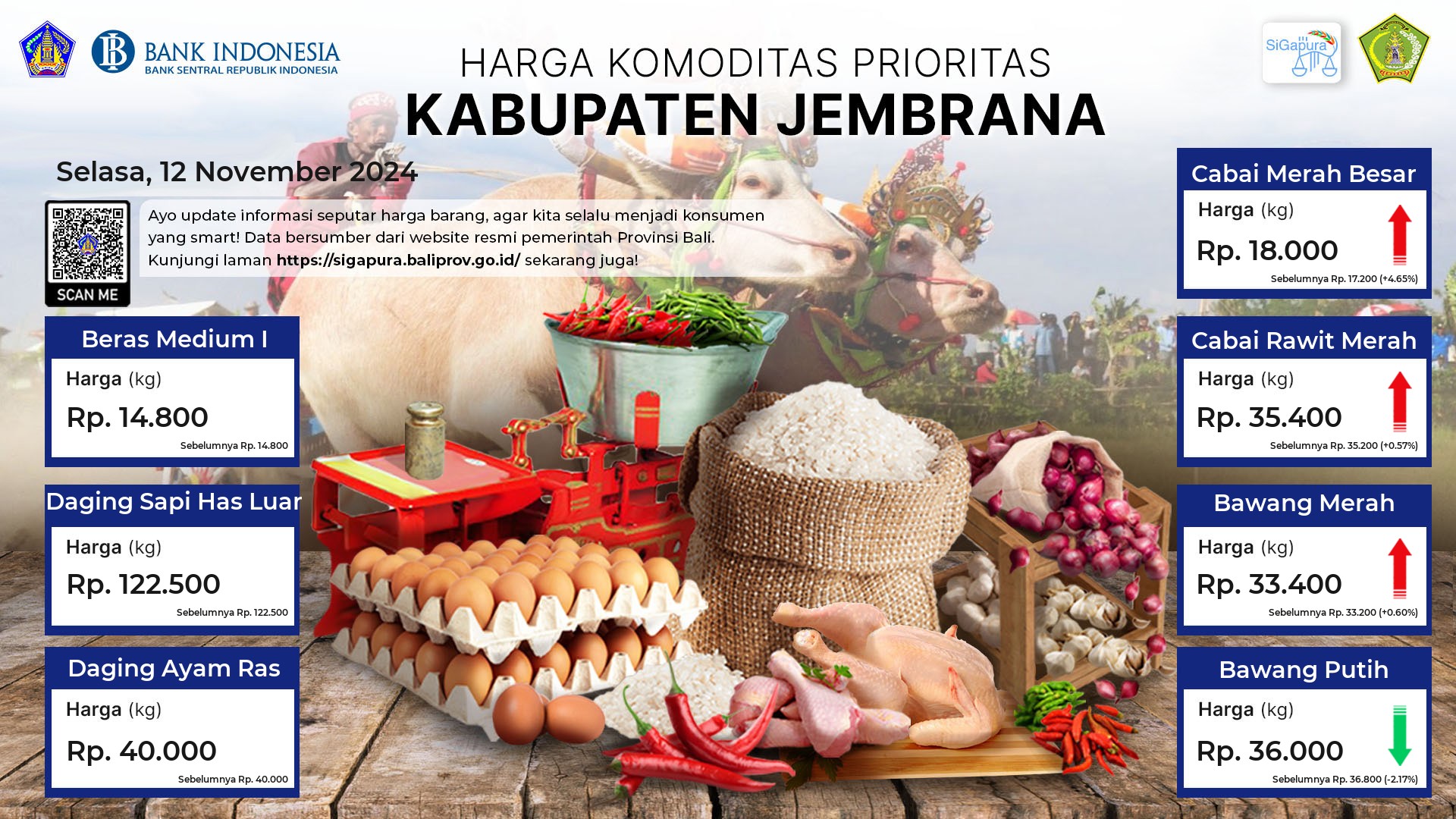 Berdasarkan pemantauan Harga Pangan Rata-Rata 7 (tujuh) Komoditas Prioritas di 60 Pasar seluruh Bali pada tanggal 12 November 2024, diperoleh informasi Beras Medium I ada diharga Rp. 14.286, mengalami penurunan sebesar 0.40%. Daging Sapi Has Luar tetap ada diharga Rp. 117.890. Daging Ayam Ras ada diharga Rp. 40.651, mengalami kenaikan sebesar 0.19%. Cabai Merah Besar ada diharga Rp. 18.417, mengalami kenaikan sebesar 1.16%. Cabai Rawit Merah ada diharga Rp. 36.717, mengalami kenaikan sebesar 0.38%. Bawang Merah ada diharga Rp. 32.476, mengalami penurunan sebesar 1.51%. Bawang Putih ada diharga Rp. 37.253, mengalami penurunan sebesar 0.45%.
