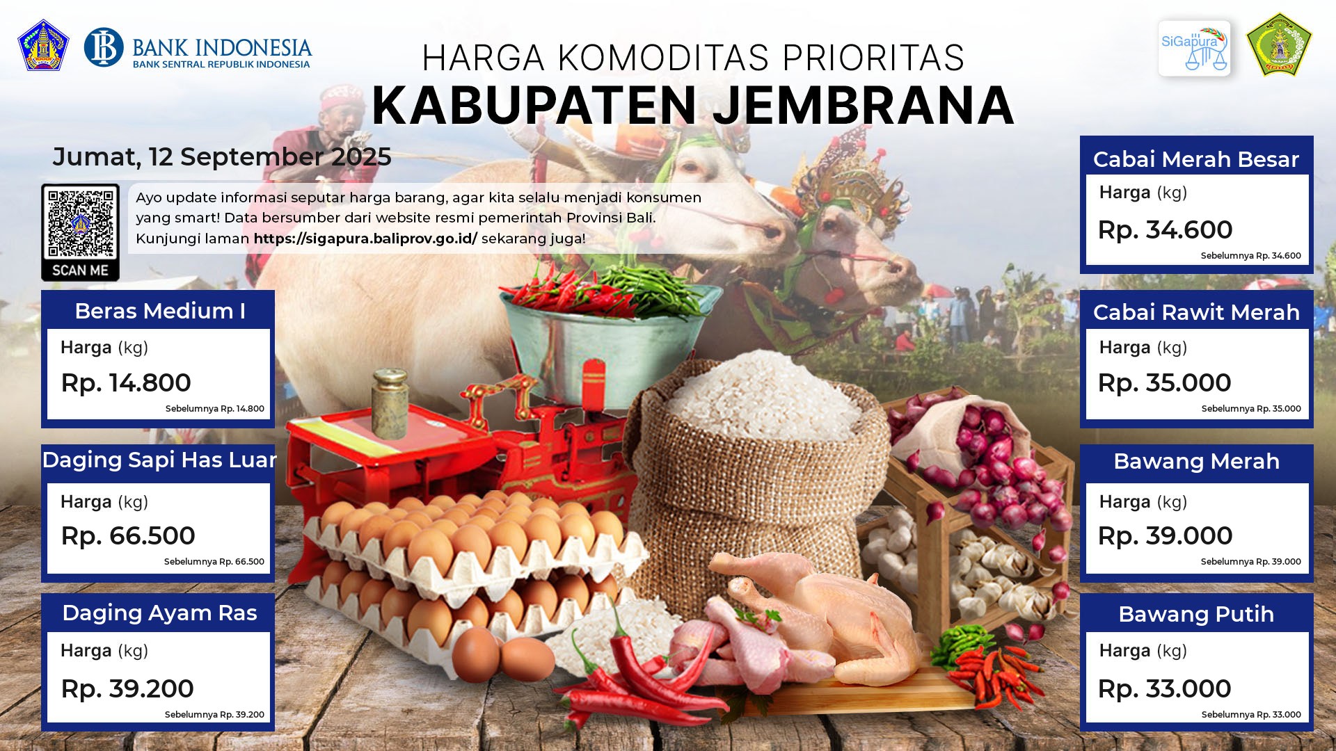Berdasarkan pemantauan Harga Pangan Rata-Rata 7 (tujuh) Komoditas Prioritas di 60 Pasar seluruh Bali pada tanggal 12 September 2025, diperoleh informasi Beras Medium I ada diharga Rp. 14.837, mengalami penurunan sebesar 0.10%. Daging Sapi Has Luar ada diharga Rp. 111.788, mengalami penurunan sebesar 0.36%. Daging Ayam Ras ada diharga Rp. 41.687, mengalami kenaikan sebesar 0.27%. Cabai Merah Besar ada diharga Rp. 31.683, mengalami penurunan sebesar 0.40%. Cabai Rawit Merah ada diharga Rp. 33.318, mengalami kenaikan sebesar 0.61%. Bawang Merah ada diharga Rp. 34.063, mengalami penurunan sebesar 0.32%. Bawang Putih ada diharga Rp. 32.329, mengalami kenaikan sebesar 0.32%.