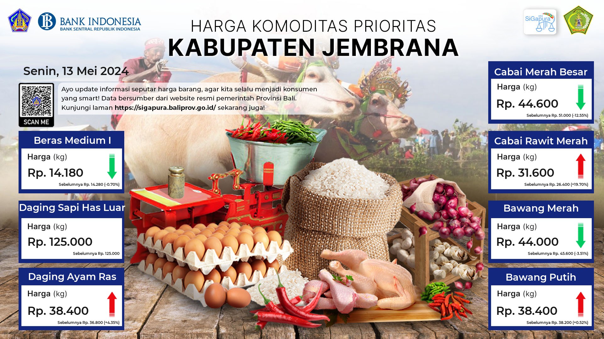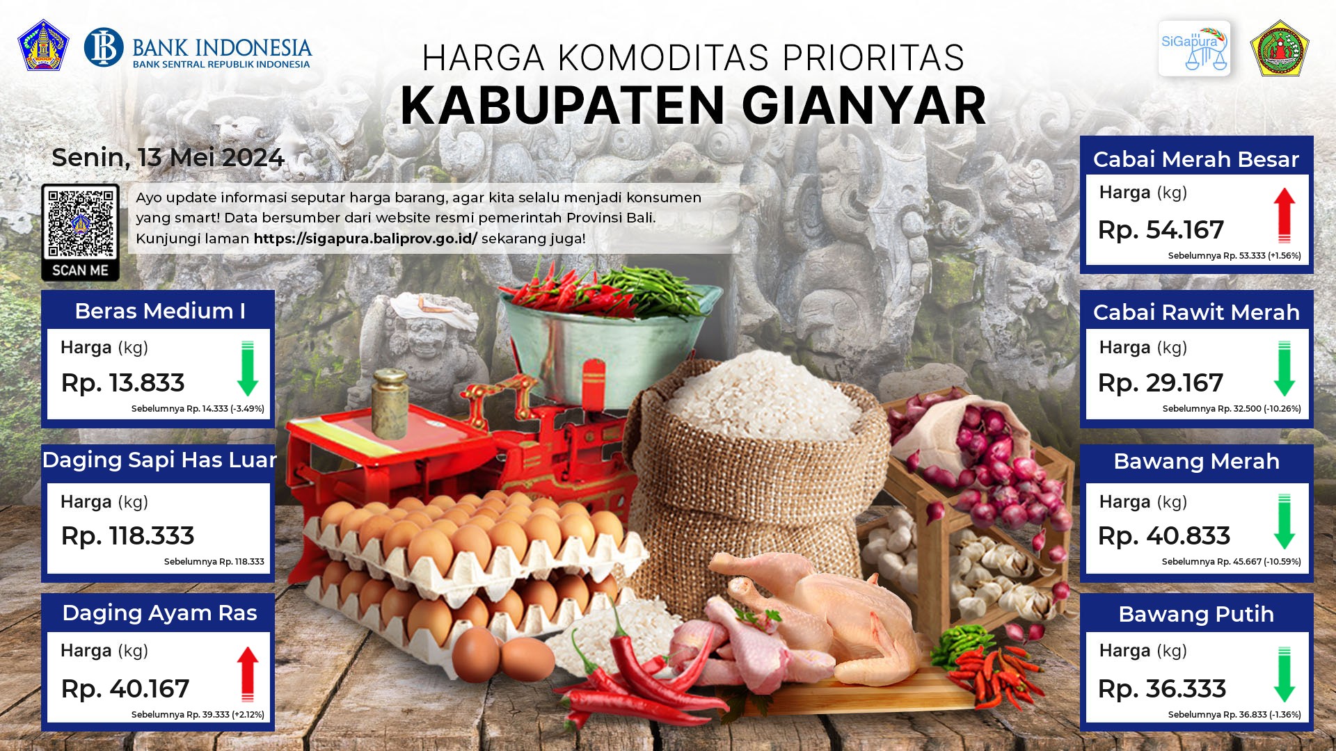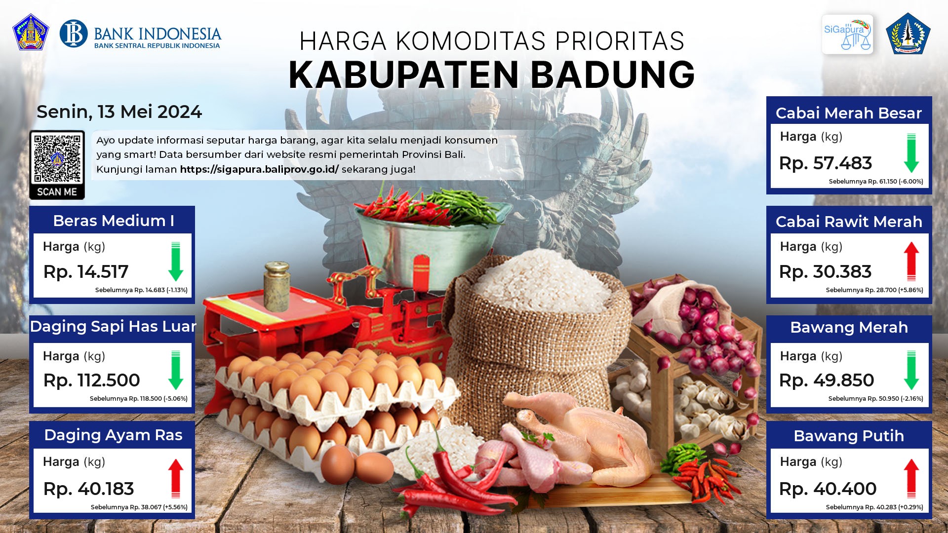 Berdasarkan pemantauan Harga Pangan Rata-Rata 7 (tujuh) Komoditas Prioritas di 60 Pasar seluruh Bali pada tanggal 13 Mei 2024, diperoleh informasi Beras Medium I ada diharga Rp. 13.969, mengalami penurunan sebesar 1.63%. Daging Sapi Has Luar ada diharga Rp. 117.489, mengalami penurunan sebesar 1.61%. Daging Ayam Ras ada diharga Rp. 40.907, mengalami kenaikan sebesar 3.54%. Cabai Merah Besar ada diharga Rp. 53.810, mengalami penurunan sebesar 5.91%. Cabai Rawit Merah ada diharga Rp. 27.548, mengalami penurunan sebesar 3.73%. Bawang Merah ada diharga Rp. 42.816, mengalami penurunan sebesar 8.01%. Bawang Putih ada diharga Rp. 37.724, mengalami penurunan sebesar 1.59%.